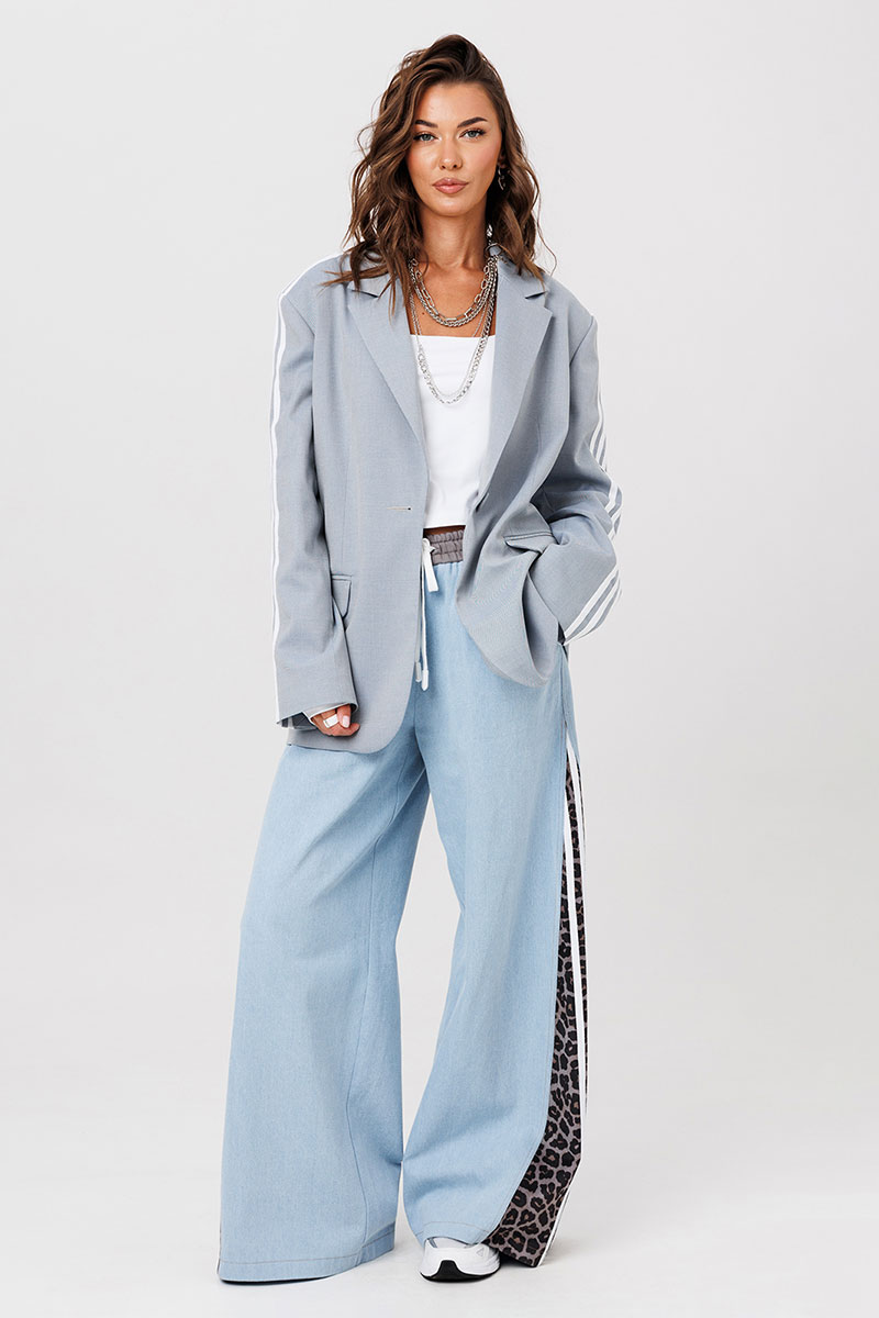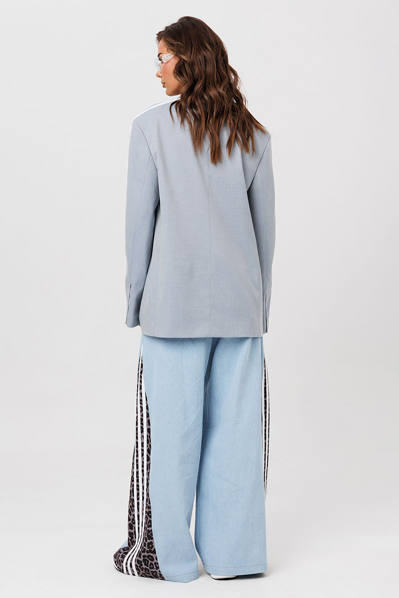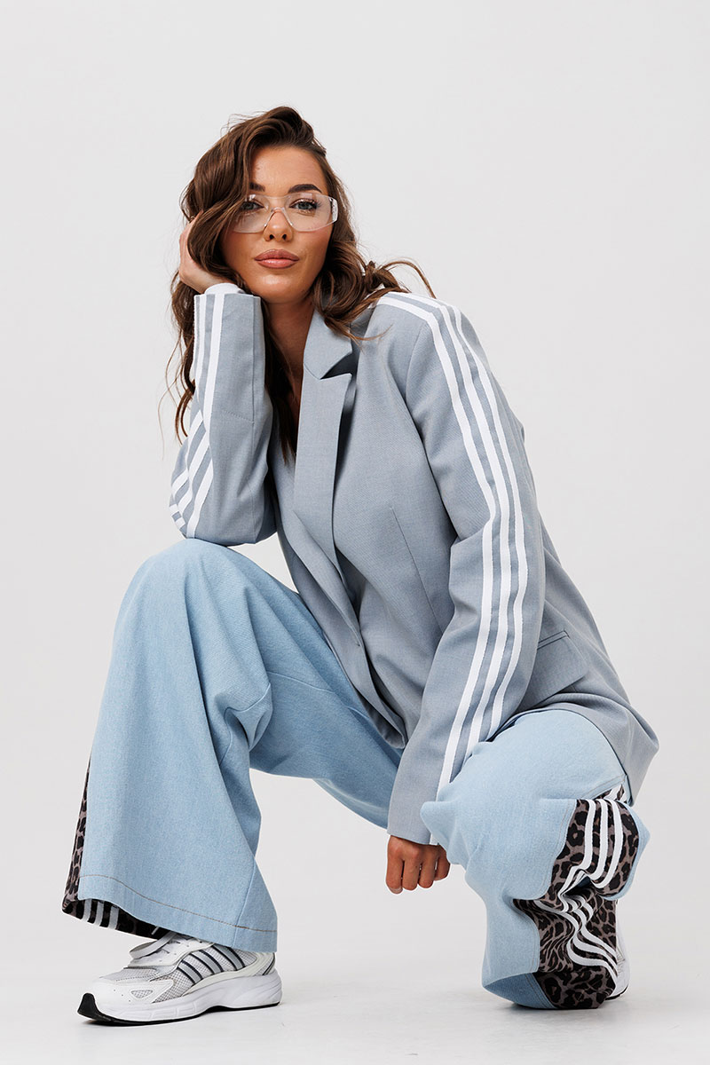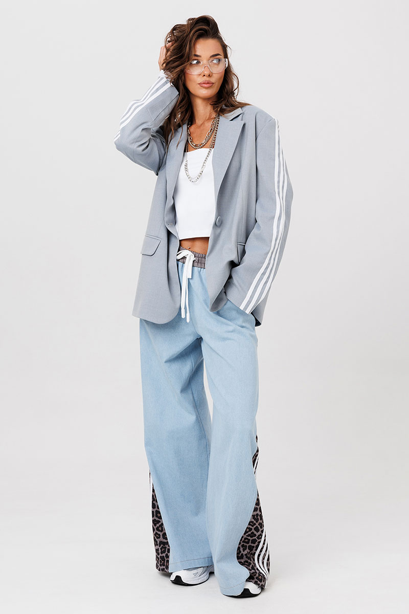 Жакет прямого силуэта, с однобортной застежкой на петлю-пуговицу, втачным двухшовным рукавом. Воротник отложной с лацканом. Полочка с отрезным бочком и талиевой вытачкой и карманом с клапанном и рамкой. Спинка со средним швом. Рукав и верх полочки и спинке (по плечу) с натрочными лампасами. Жакет на подкладке.