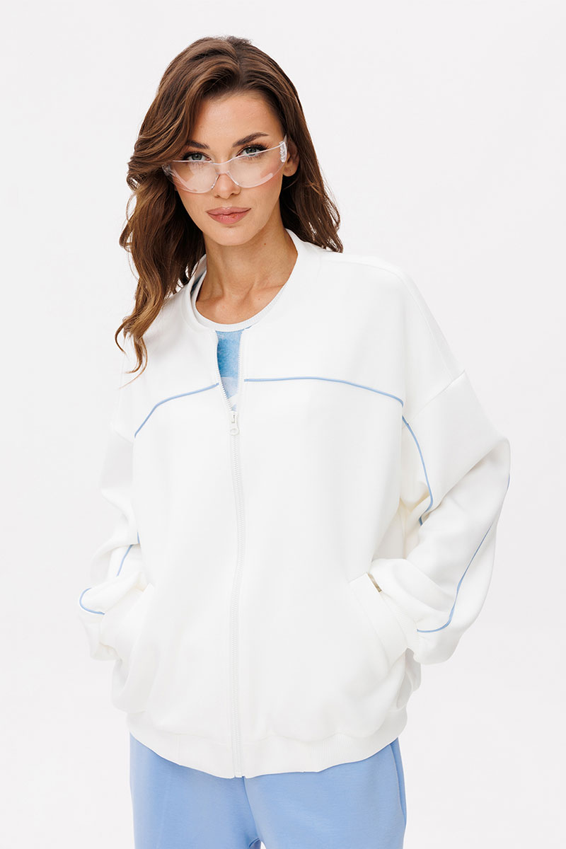 Бомбер спортивный прямого силуэта с втачным рукавом и спущенной линией плеча, внизу рукав на манжете из довяза. Бомбер по переду с центральной застежкой на тесьму-молнию и карманами с листочкой. По горловине стойка из довяза, по низу бомбера приточная планка из довяза. По переду спинке и рукаву декоративные подрезы с вставленным в него кантом.