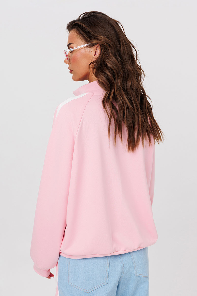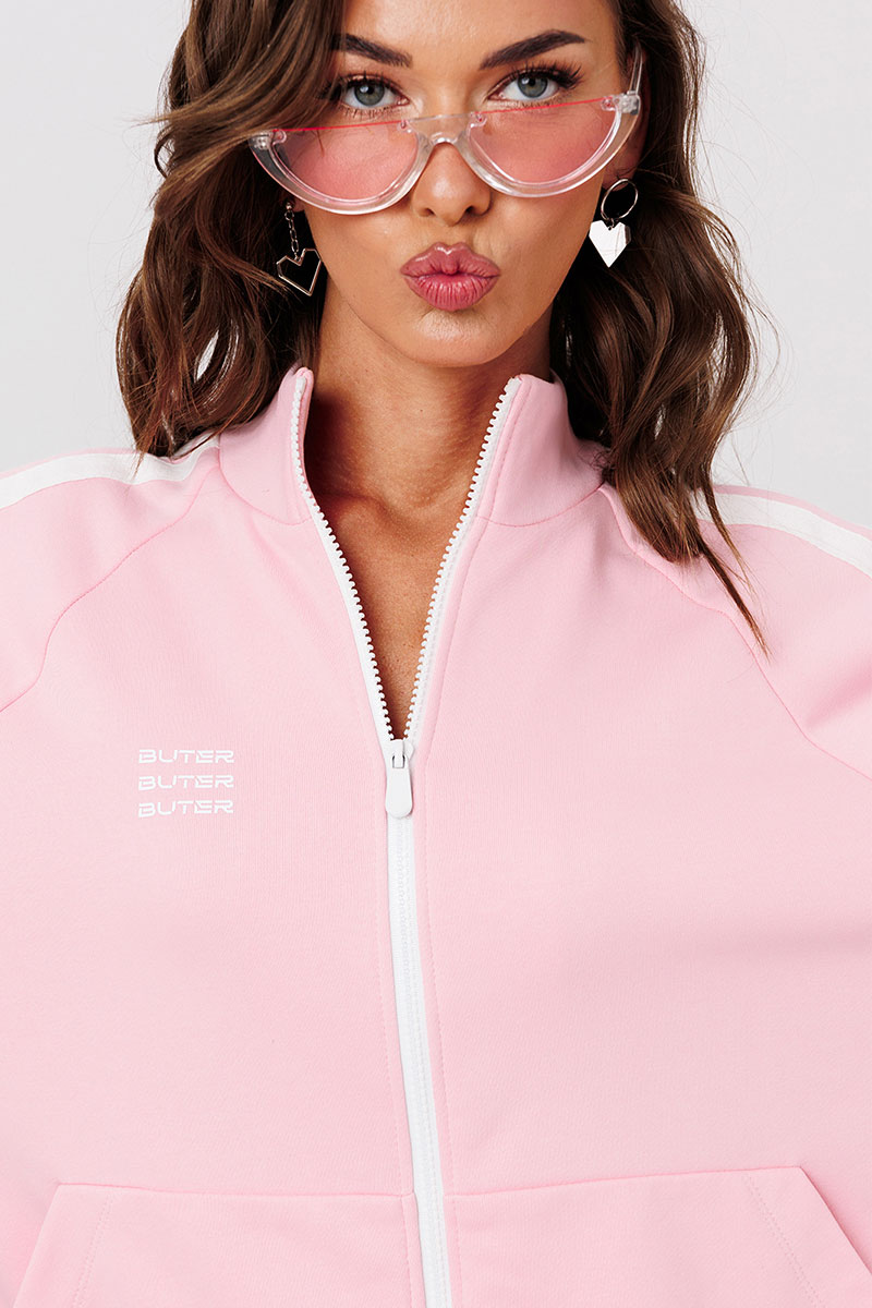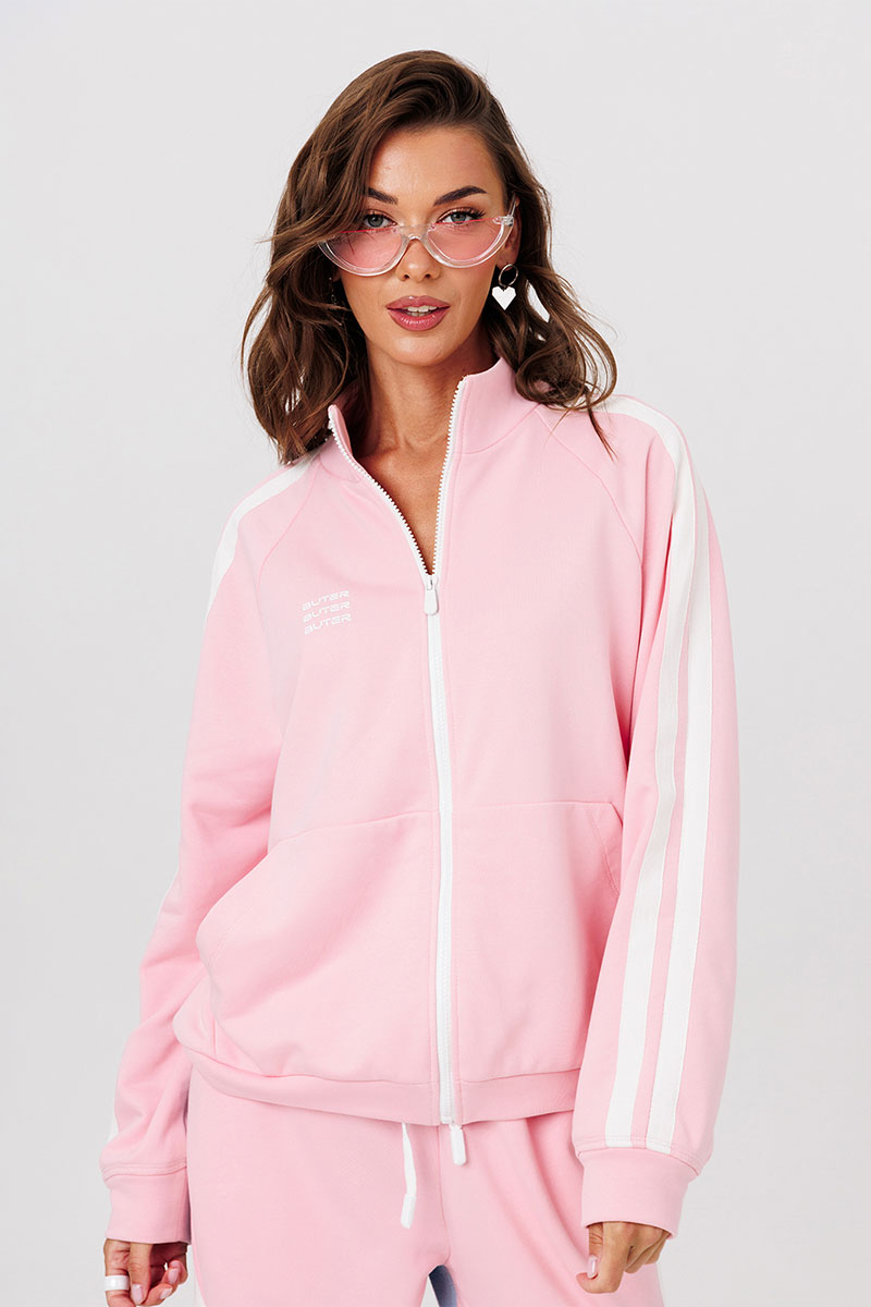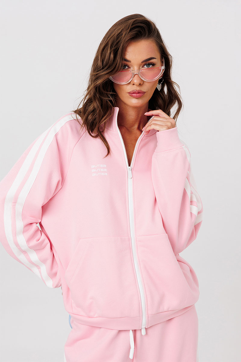 Джемпер трикотажный прямого силуэта с втачным длинным рукавом-реглан внизу на притачной манжете. Рукав с широкими настроченными лампасами. Полочка, с центральной застежкой на тесьму-молнию, карманом-кенгуру и печатью «BUTER». По низу джемпера притачная планка. Воротник-стойка. Джемпер без подкладки.