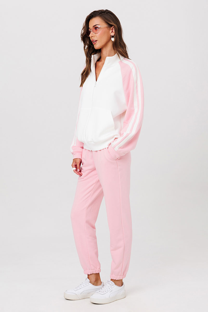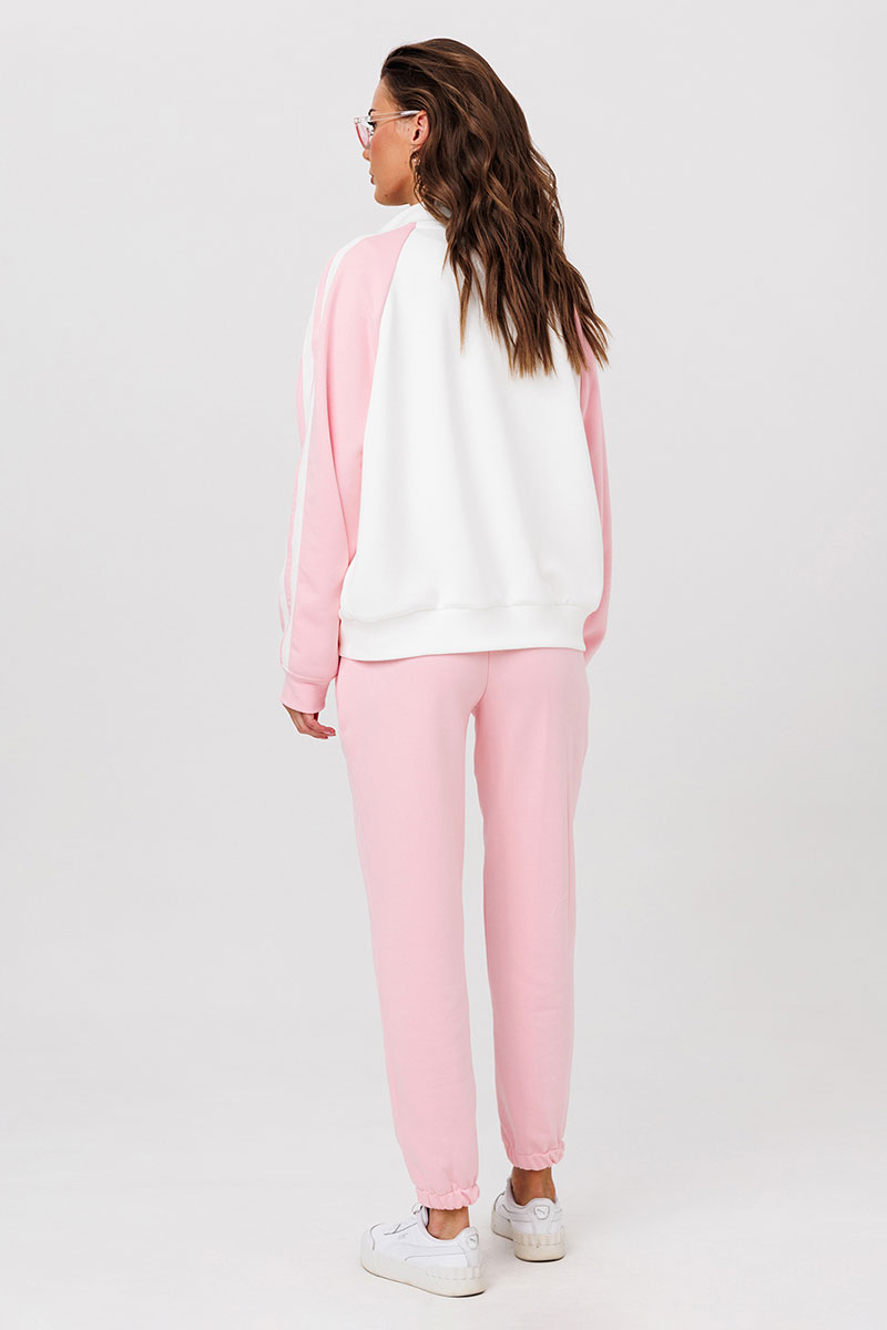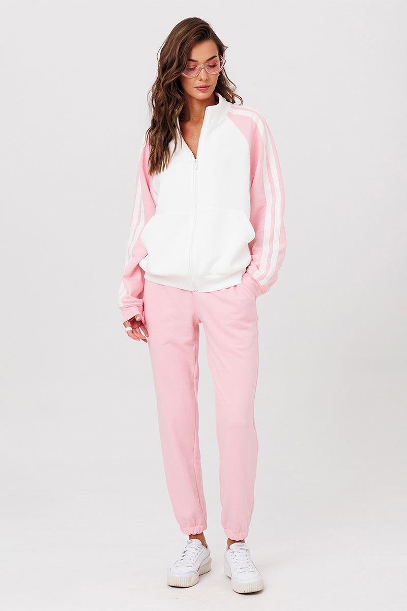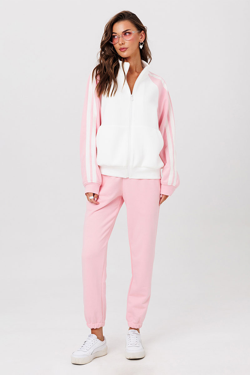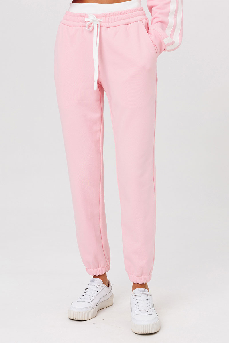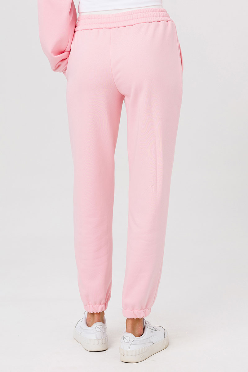 Брюки спортивные, зауженные к низу, на притачном, отстроченном поясе на резинке и втянутым в него декоративным шнуром. Над притачным поясом вставлен довяз. По переду карманы в боковых швах с наклонным входом. По низу брюк подгибка со вставленной в нее резинкой.
