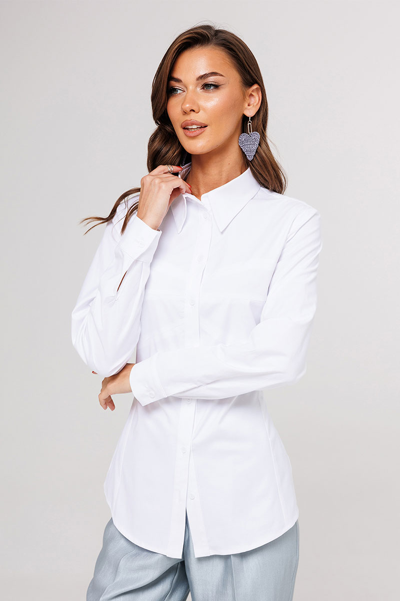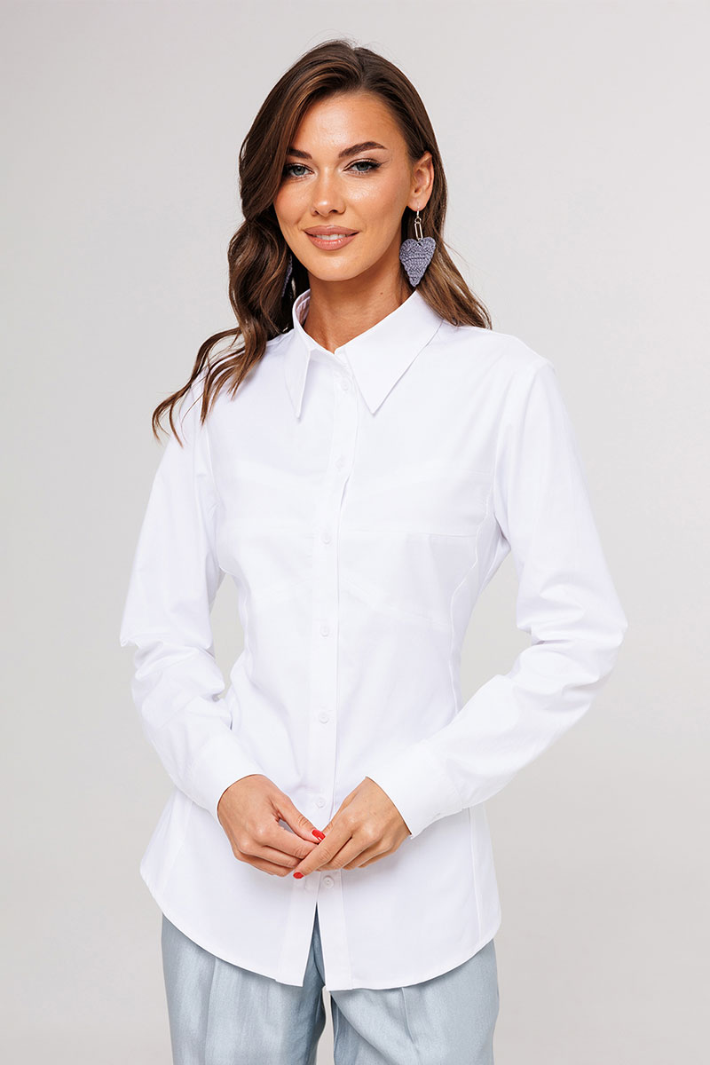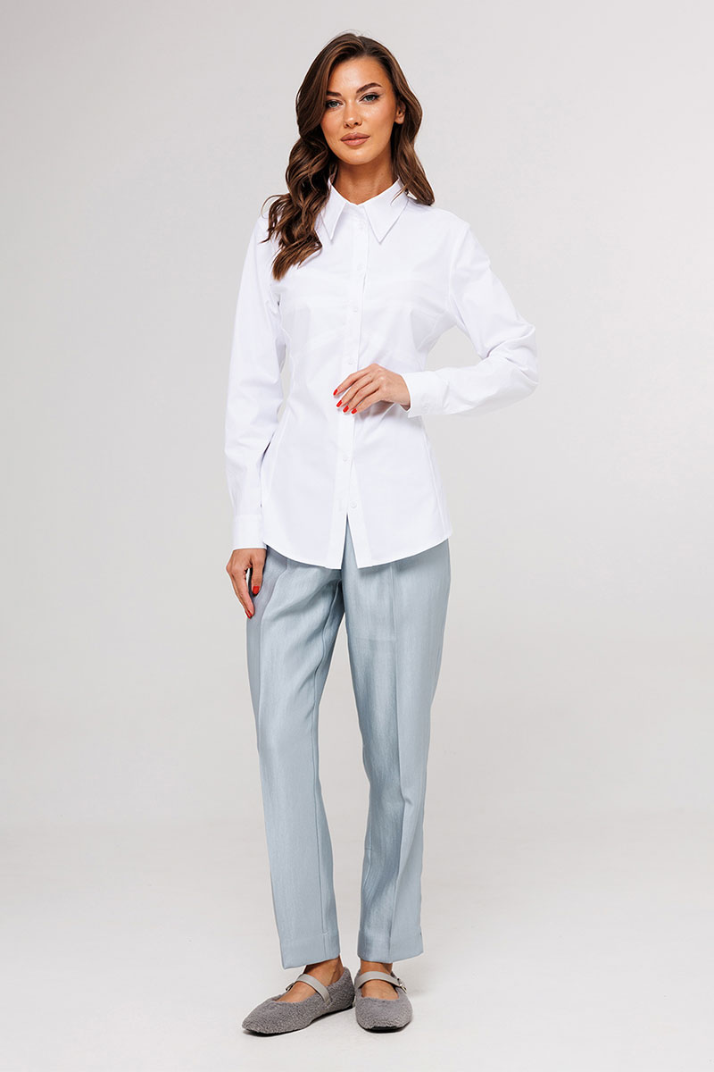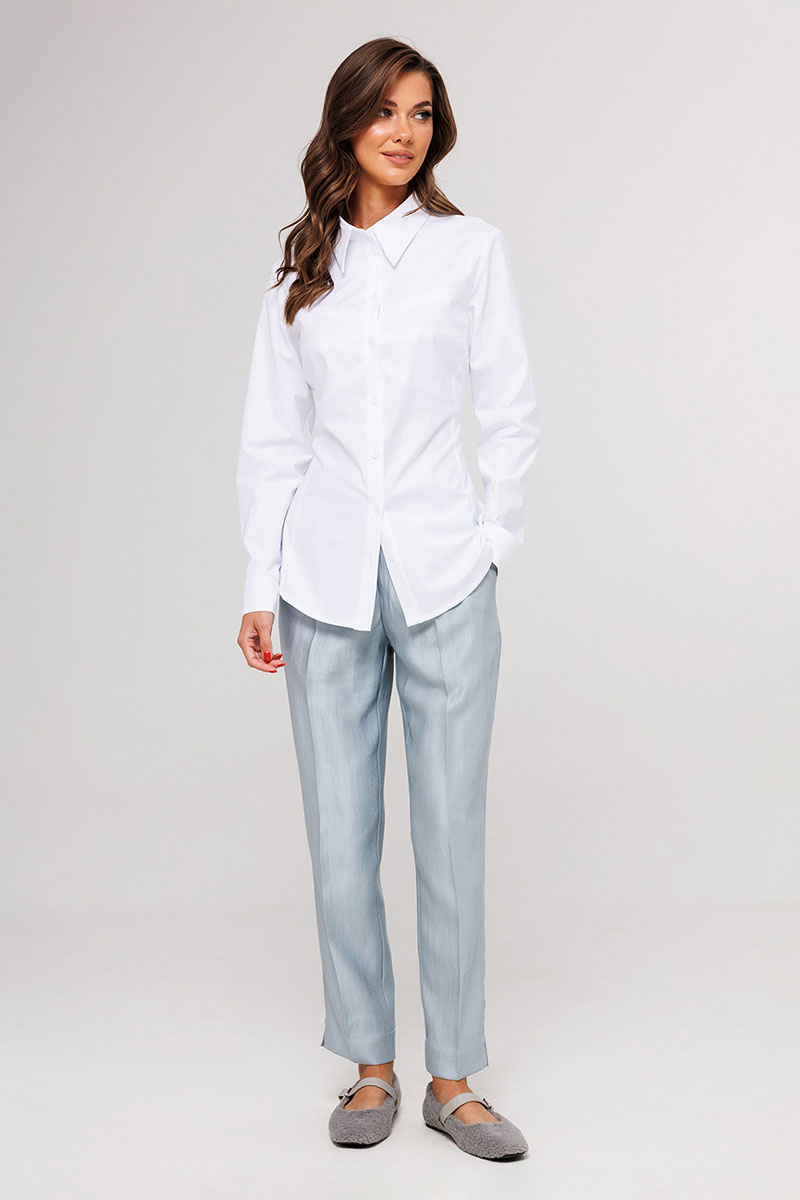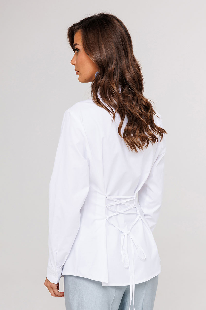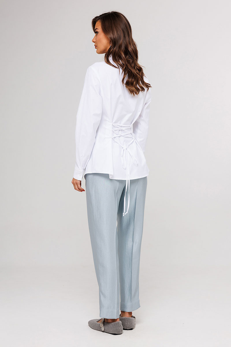 Блузка полуприлегающего силуэта, с втачным одно шовным рукавом, со складкой и манжетой, с застежкой на петлю-пуговицу. Полочка с центральной застежкой на петли-пуговицы и с фигурными подрезами, имитирующими лиф. Спинка с рельефами и шнуровкой от рельефов. Воротник рубашечный отложной на стойке. Спинка и полочка с фигурным низом.