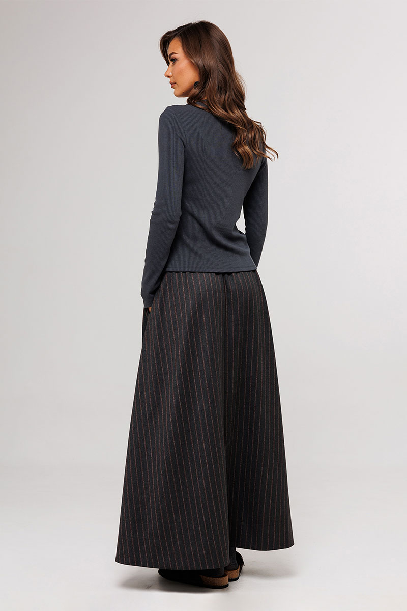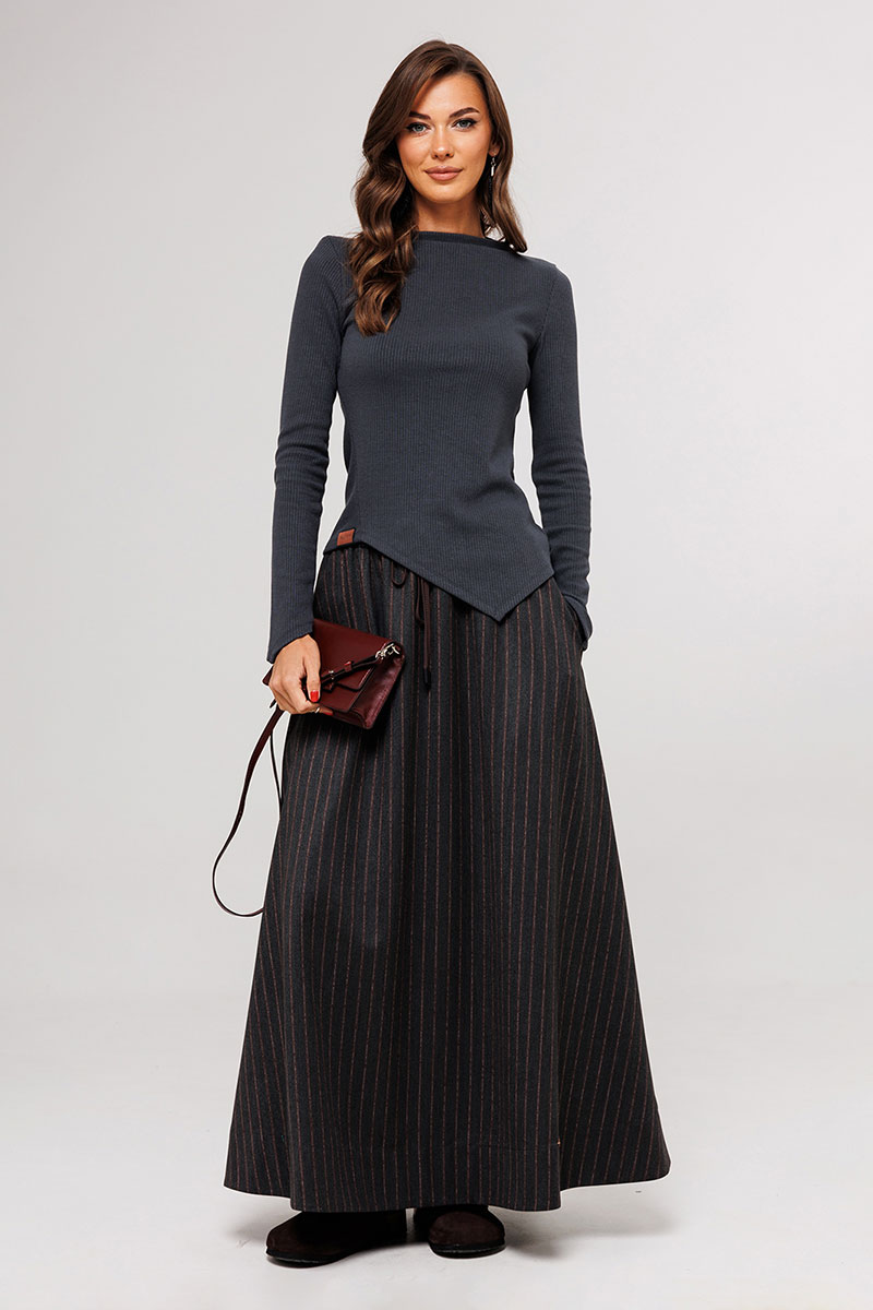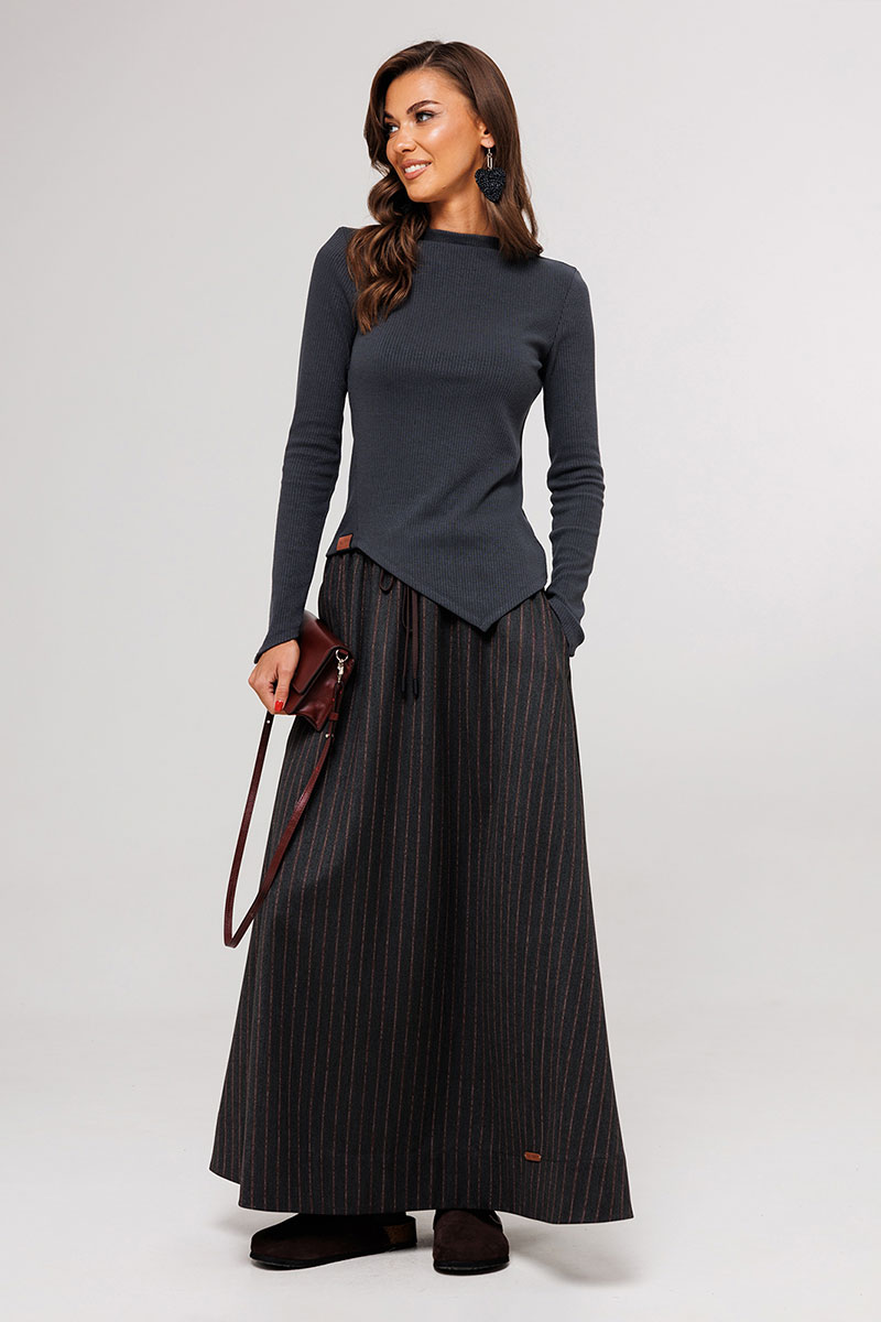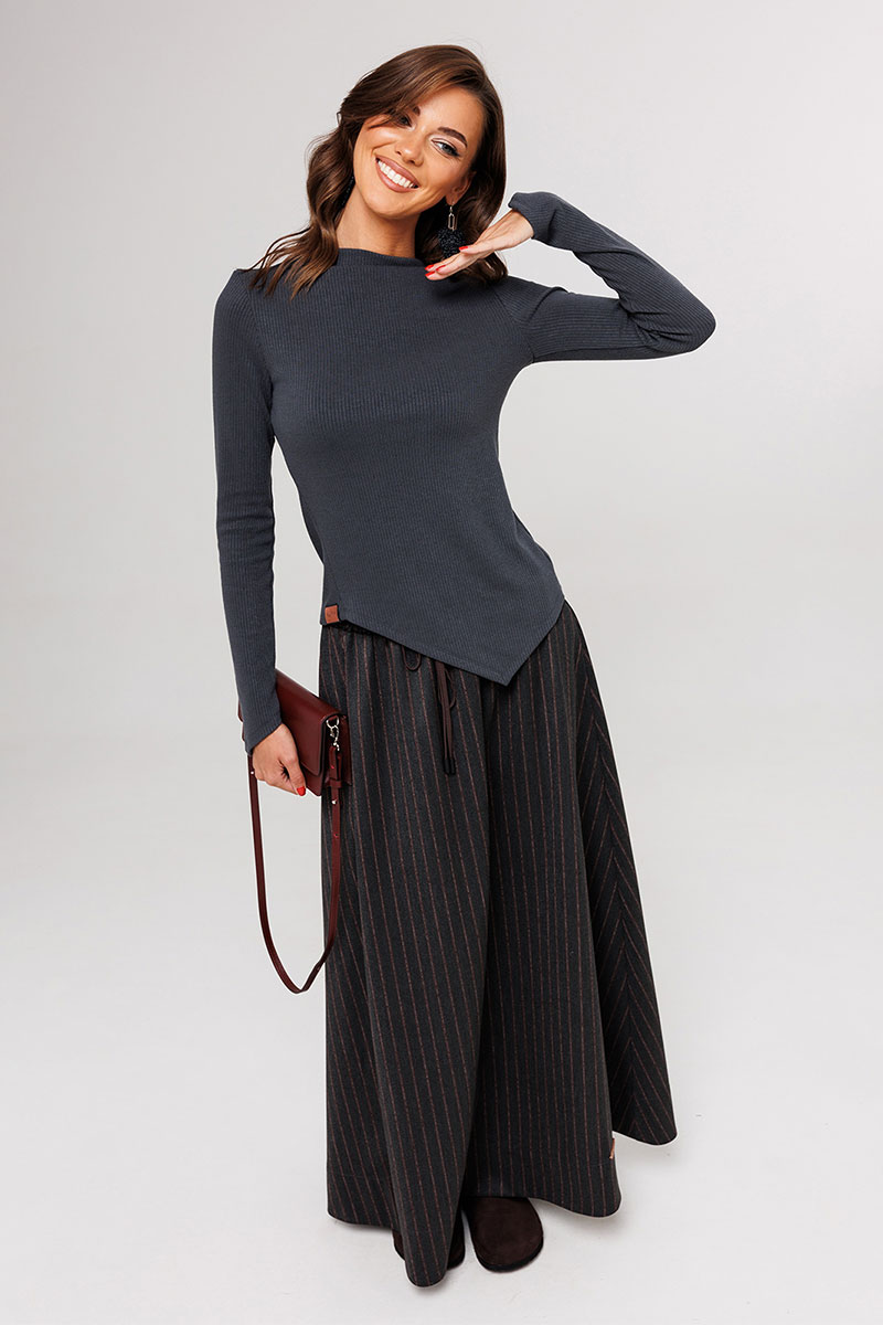 Джемпер трикотажный полуприлегающего силуэта с втачным одношовным рукавом, низ рукава фигурный. Полочка с фигурным низом и правый боковой шов к низу слегка переходит на перед. По переду нашивка "BUTER". Горловина, расширенная с невысокой цельнокроеной стойкой.