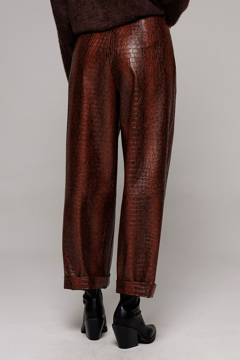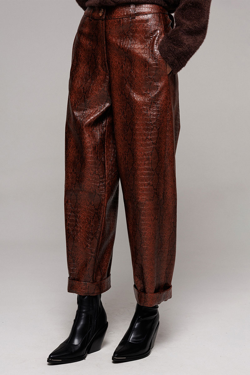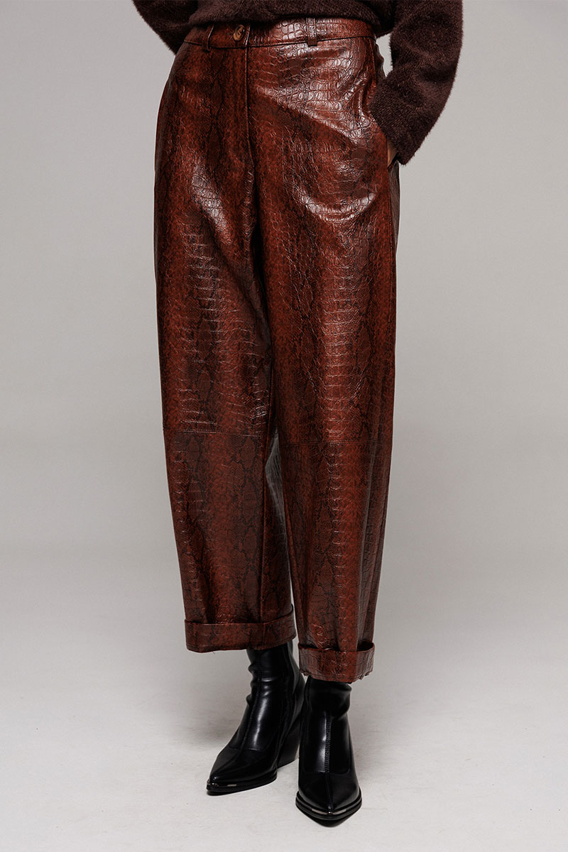 Брюки их экокожи немного заужены к низу. На притачном поясе со шлёвками, застежкой-гульфик. Пояс застегивается на петлю-пуговицу. По переду рельефы и карманами в них. По спинке вытачка от пояса. По переду и спинке брюки отрезные по лини колен.