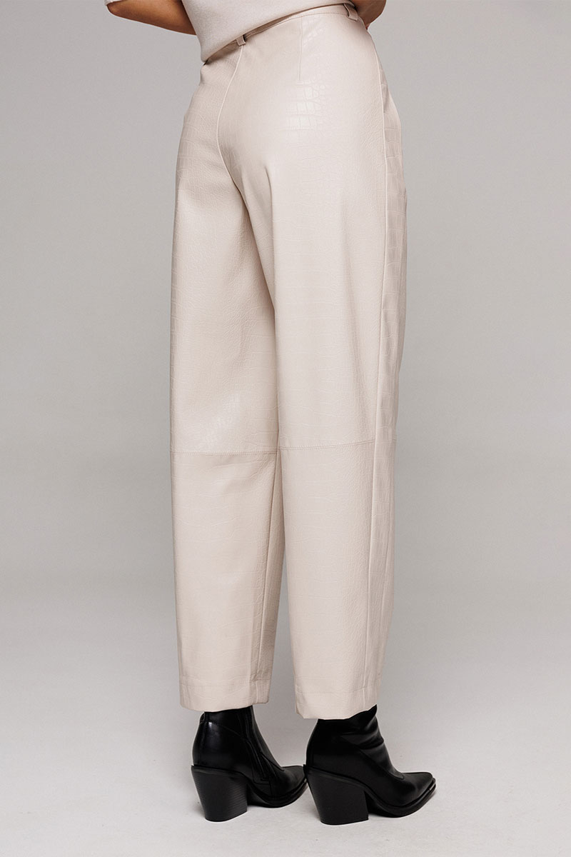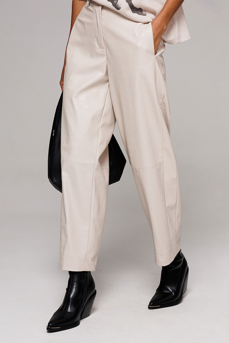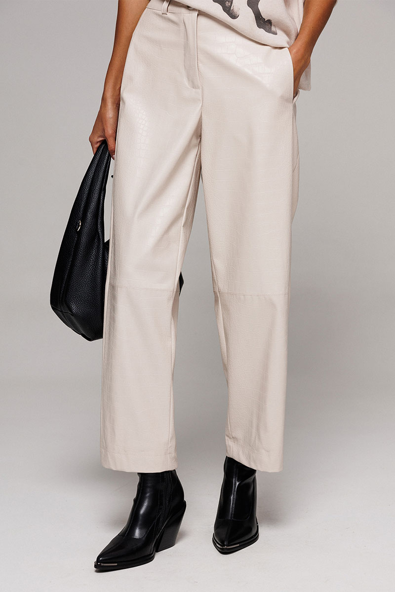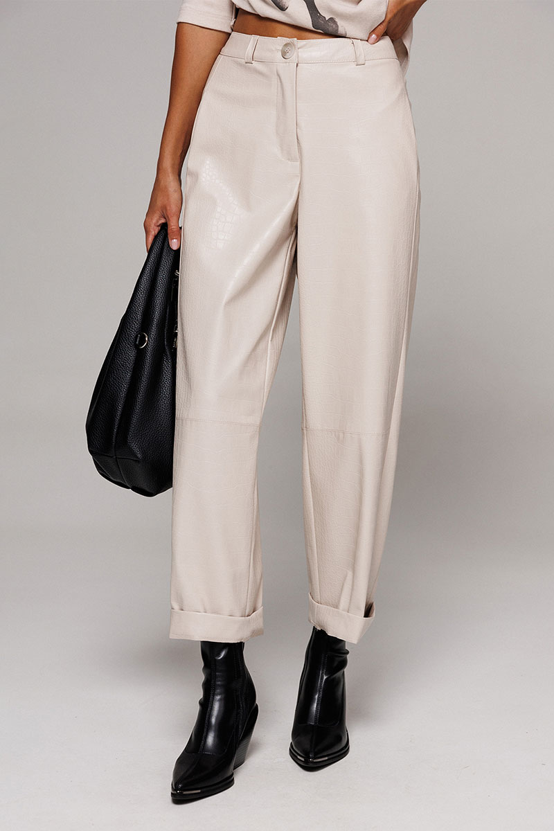 Брюки их экокожи немного заужены к низу. На притачном поясе со шлёвками, застежкой-гульфик. Пояс застегивается на петлю-пуговицу. По переду рельефы и карманами в них. По спинке вытачка от пояса. По переду и спинке брюки отрезные по лини колен.