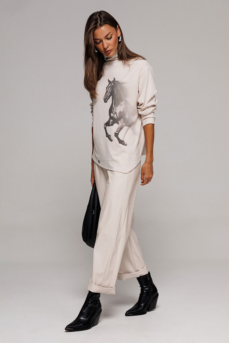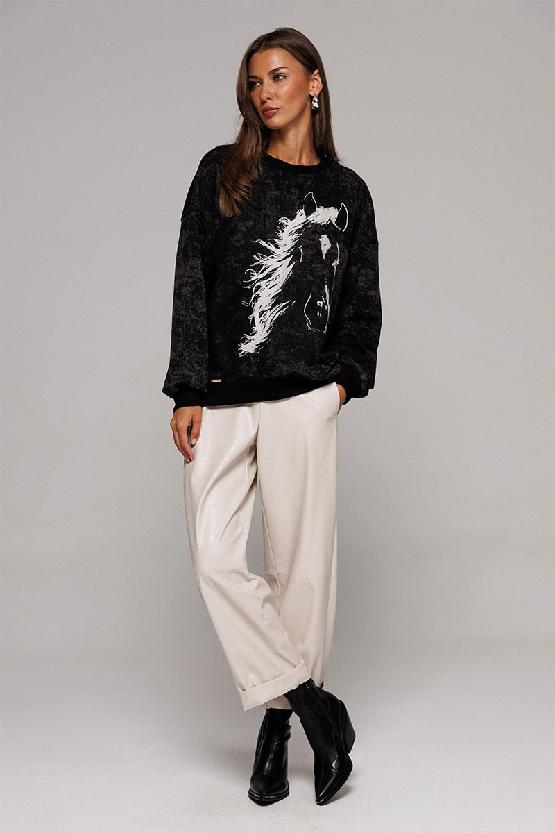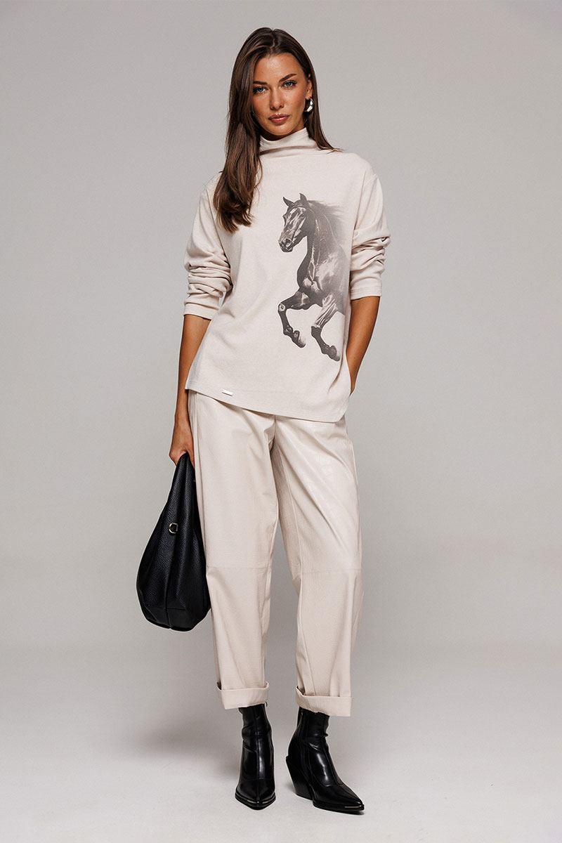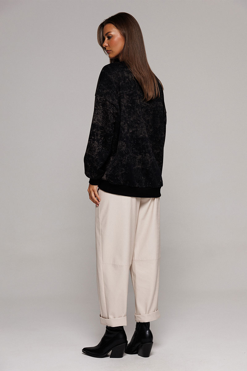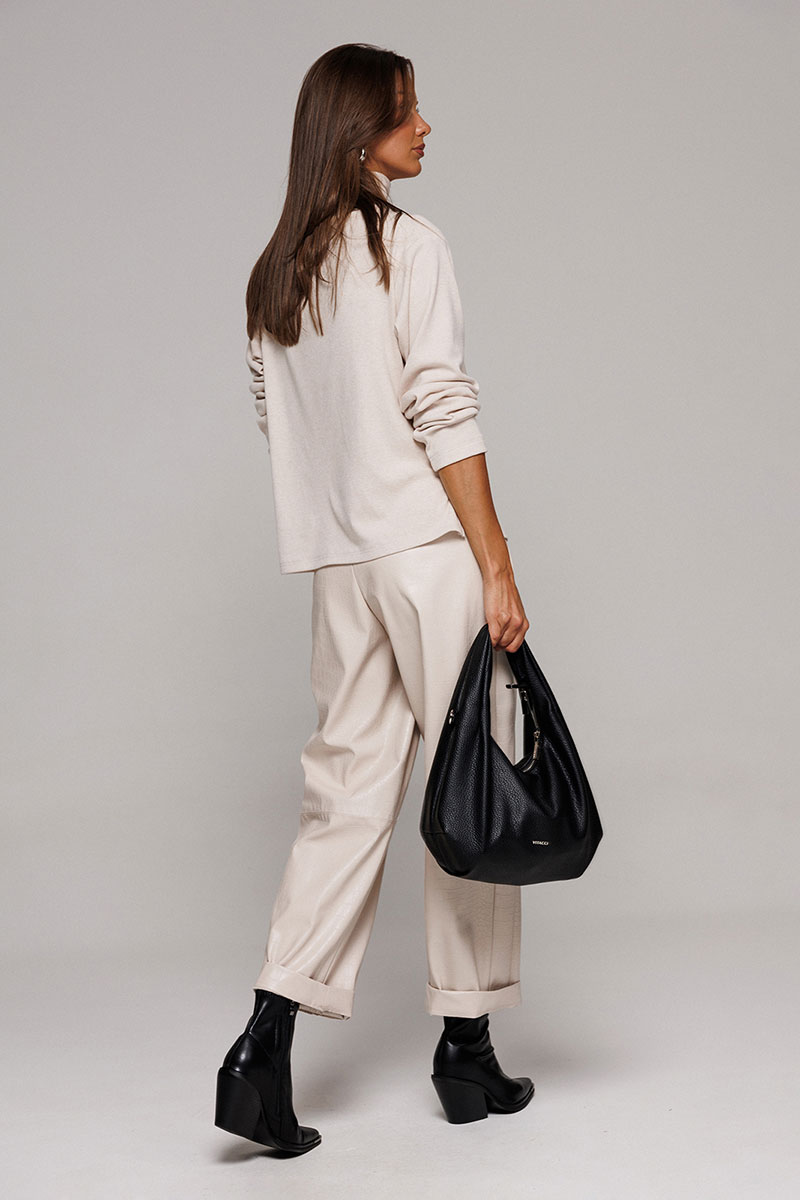 Брюки их экокожи немного заужены к низу. На притачном поясе со шлёвками, застежкой-гульфик. Пояс застегивается на петлю-пуговицу. По переду рельефы и карманами в них. По спинке вытачка от пояса. По переду и спинке брюки отрезные по лини колен.