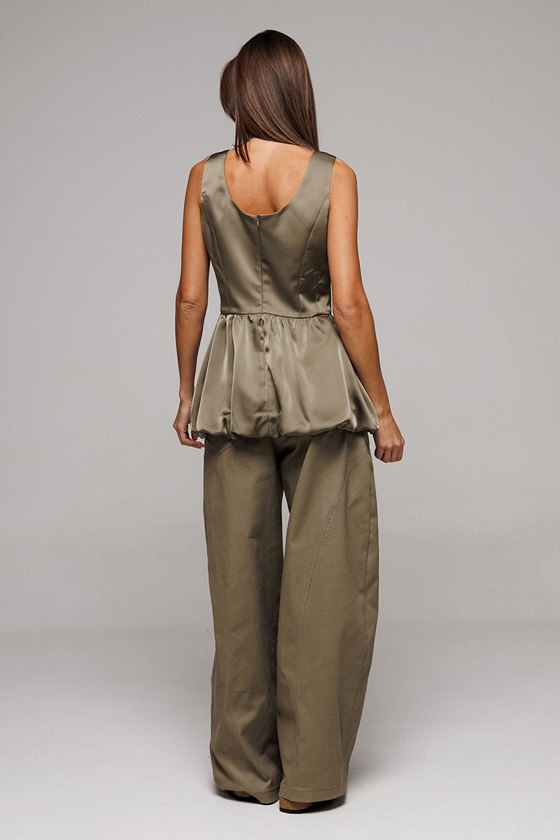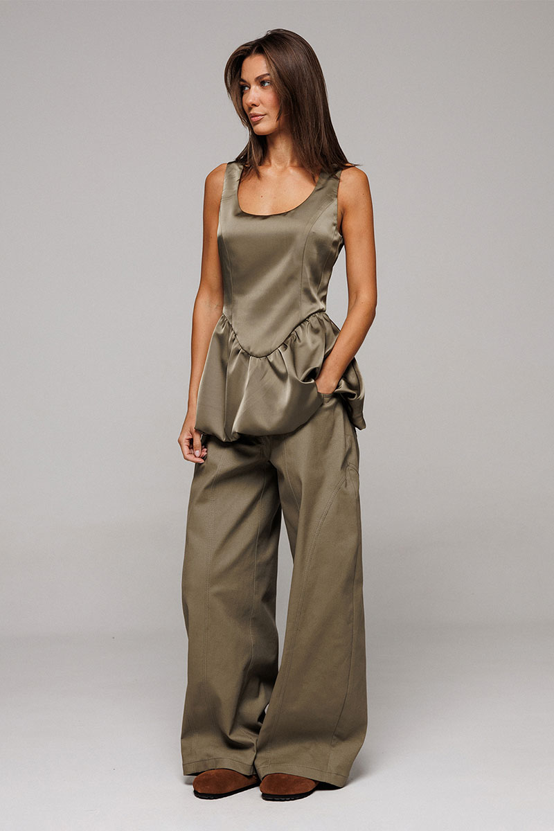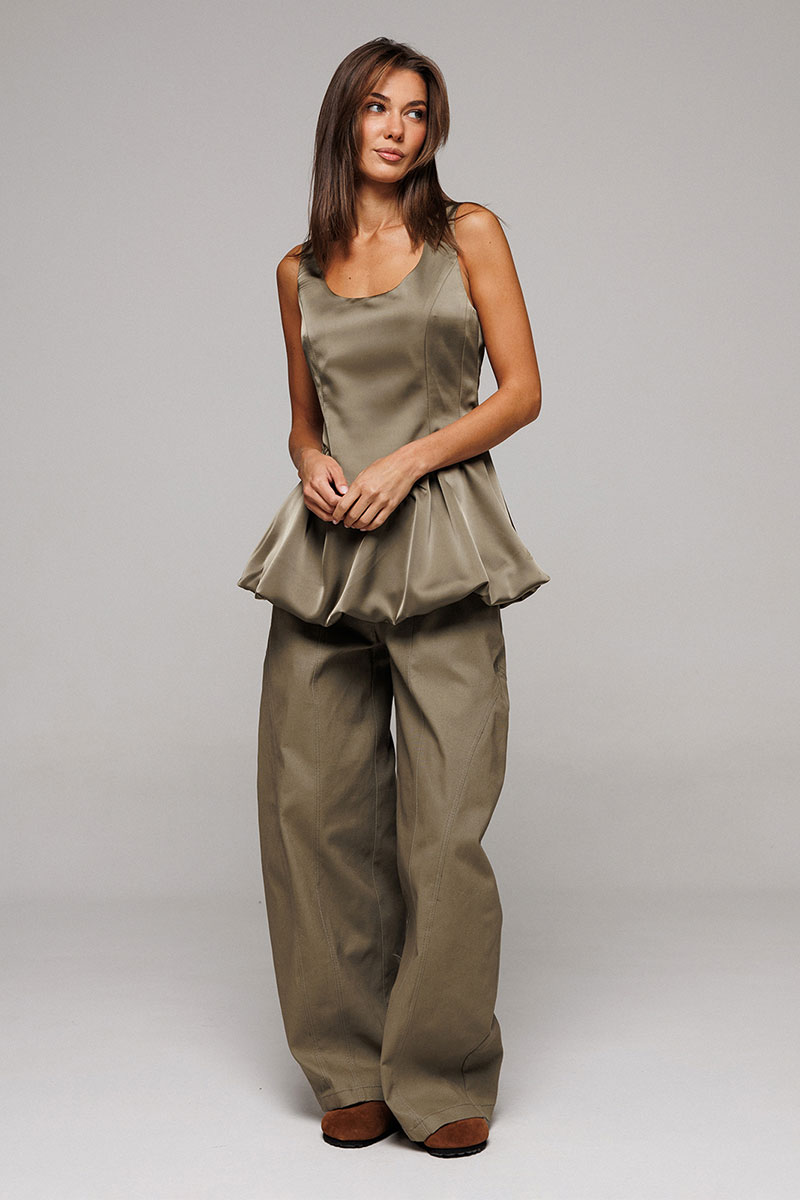 Блузка прилегающего силуэта лиф имитирует корсет, без рукавов. Полочка лифа с рельефом и отрезным бочком низ лифа фигурный. Спинка лифа с рельефом и отрезным бочком, и застежкой на потайную тесьму-молнию в центральном шве. Полочка и спинка с вырезом каре по горловине и баской-балон по низу блузки. Блузка на подкладке из основной ткани.