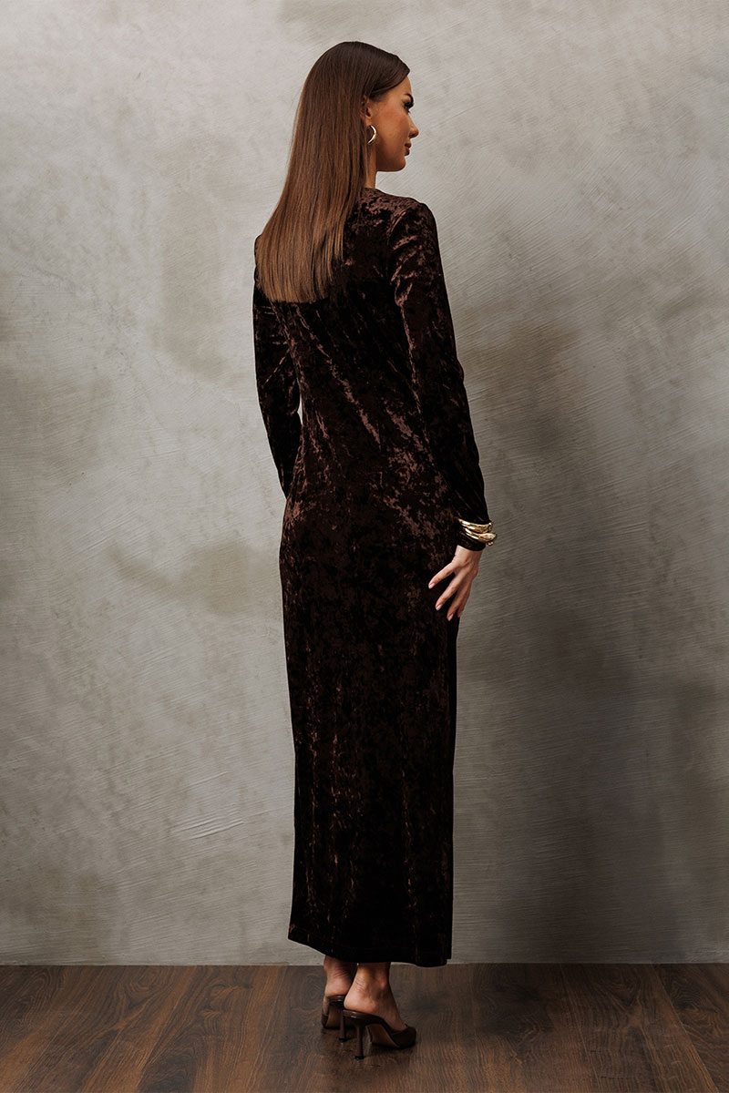 Платье велюровое прилегающего силуэта с втачным длинным одношовным рукавом. Перед платья на запах, вырез горловины V-образный и складки от запаха. Платье без подкладки.