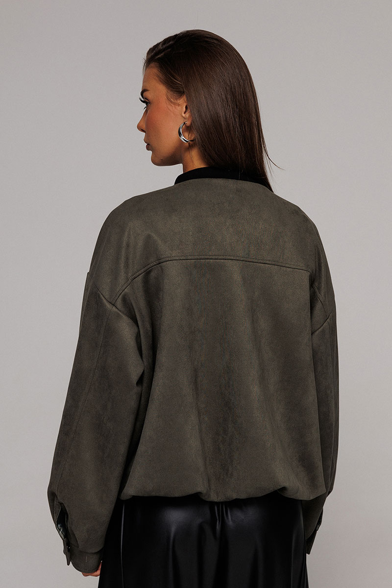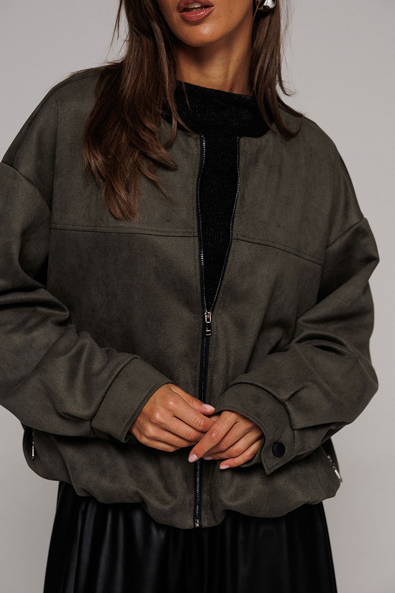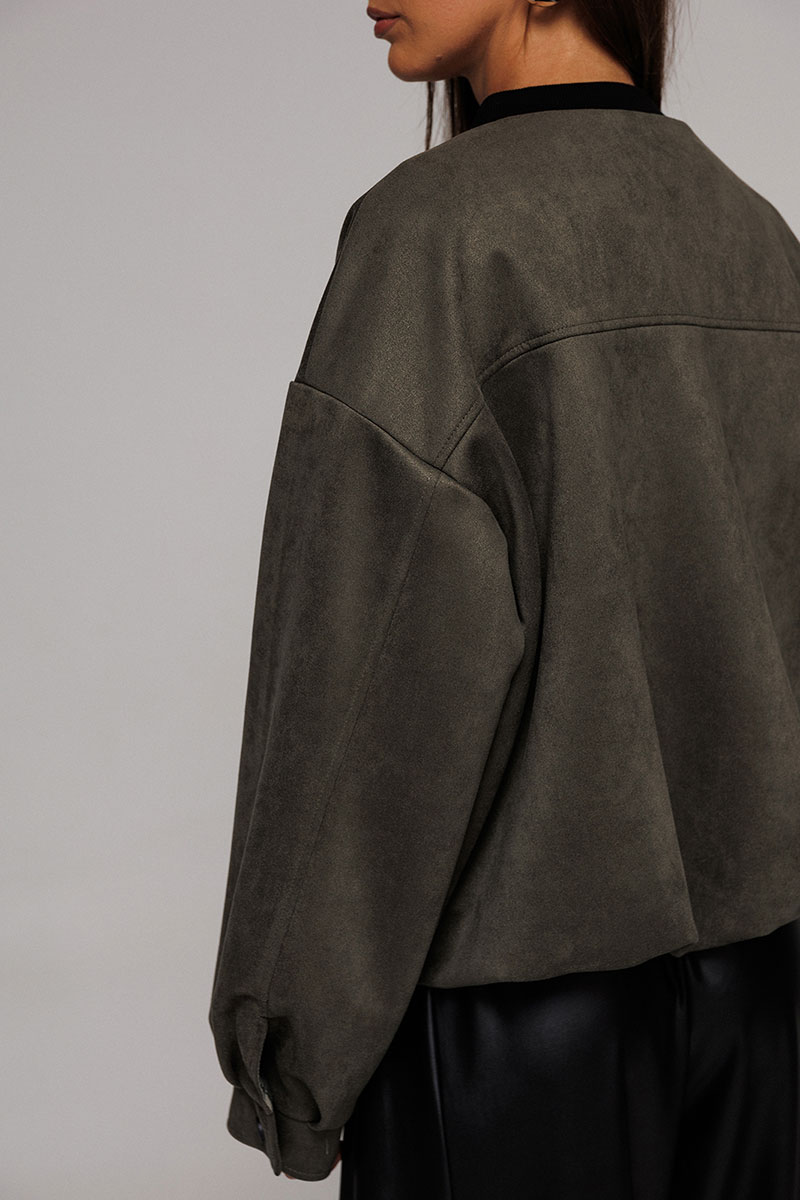 Жакет-бомбер из искусственной замши свободного силуэта со спущенной линией плеча. Рукав втачной двухшовнный, внизу со складками, притачной манжетой с застежкой на кнопку. Полочка с застежкой на тесьму молнию, с кокеткой и карманами с застежкой на молнию. Синка с кокеткой. По горловине планка из довяза. Низ жакета-бомбера со сборкой. Изделие на подкладке.