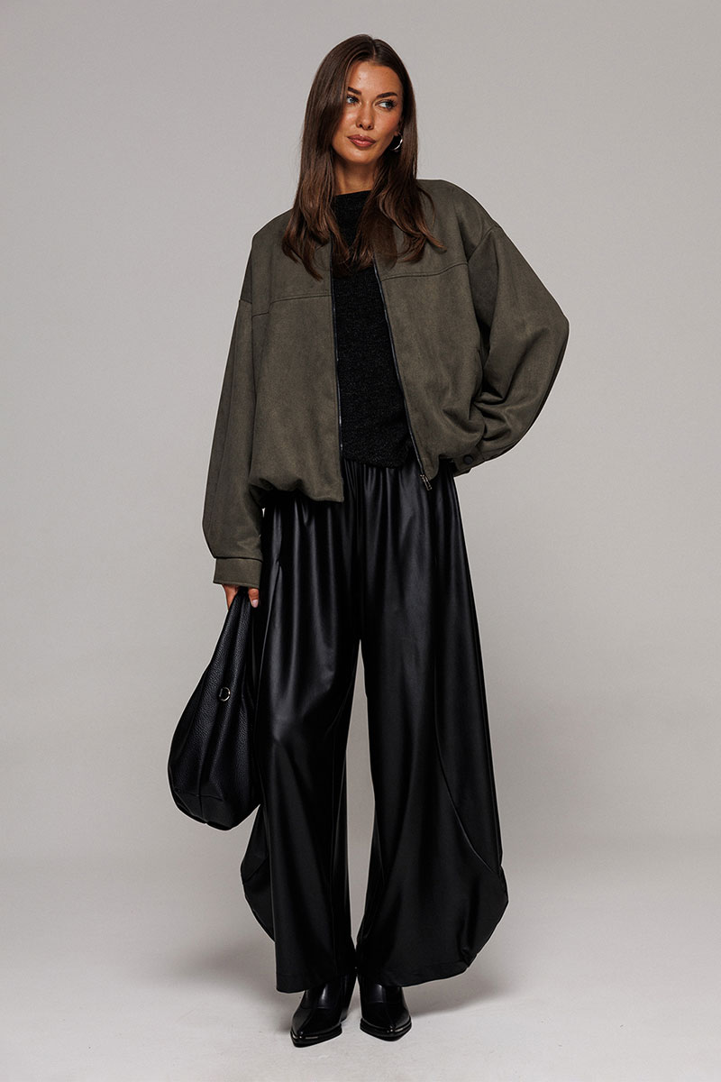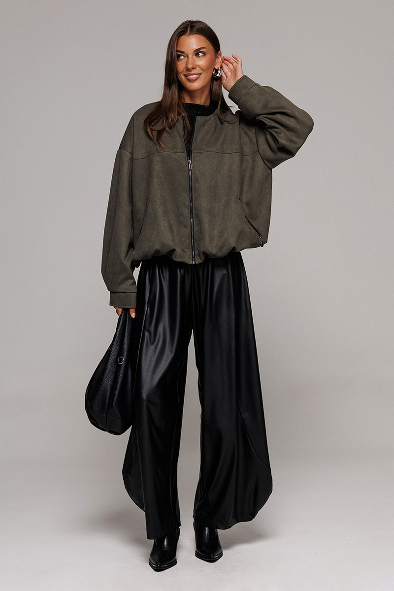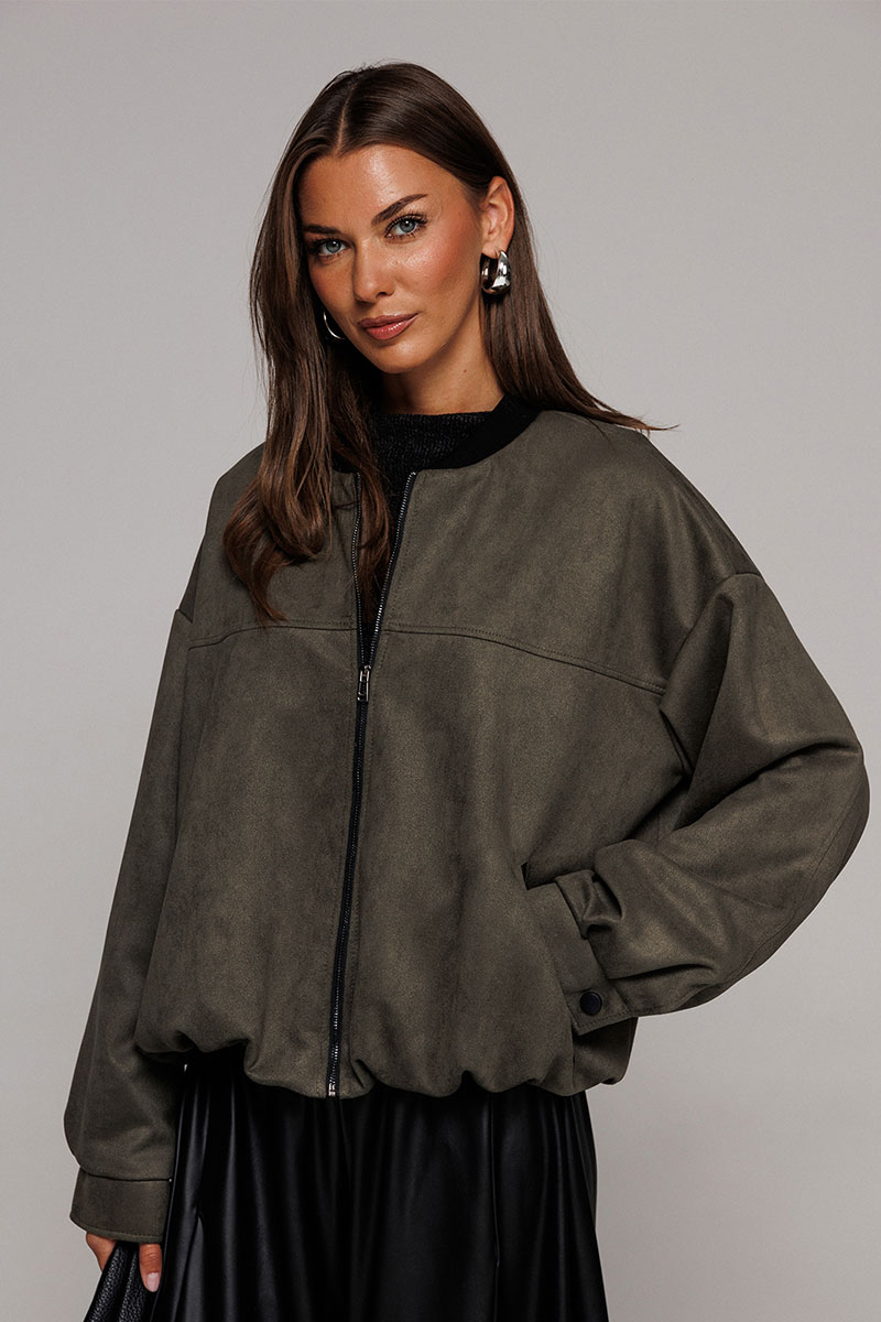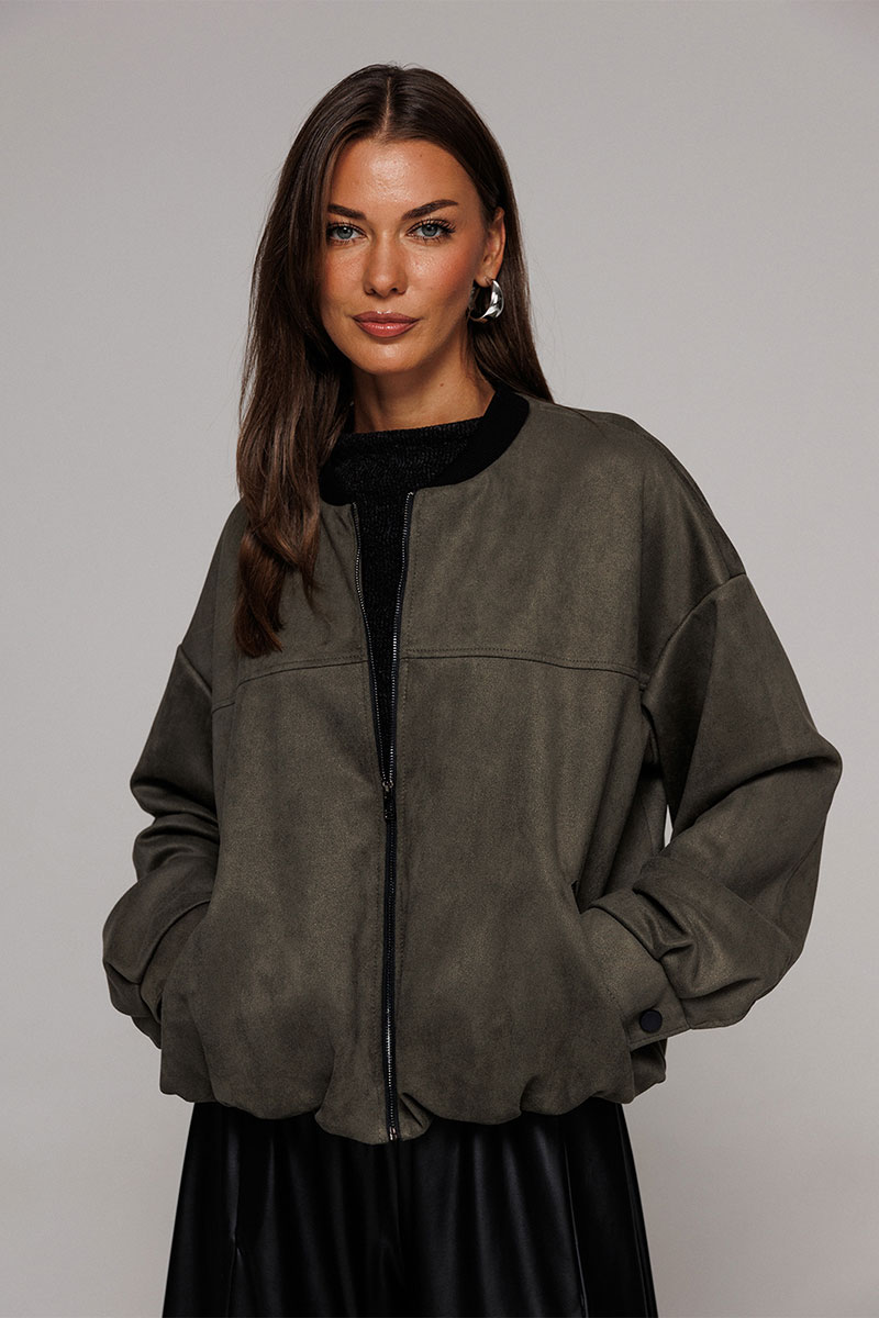 Жакет-бомбер из искусственной замши свободного силуэта со спущенной линией плеча. Рукав втачной двухшовнный, внизу со складками, притачной манжетой с застежкой на кнопку. Полочка с застежкой на тесьму молнию, с кокеткой и карманами с застежкой на молнию. Синка с кокеткой. По горловине планка из довяза. Низ жакета-бомбера со сборкой. Изделие на подкладке.