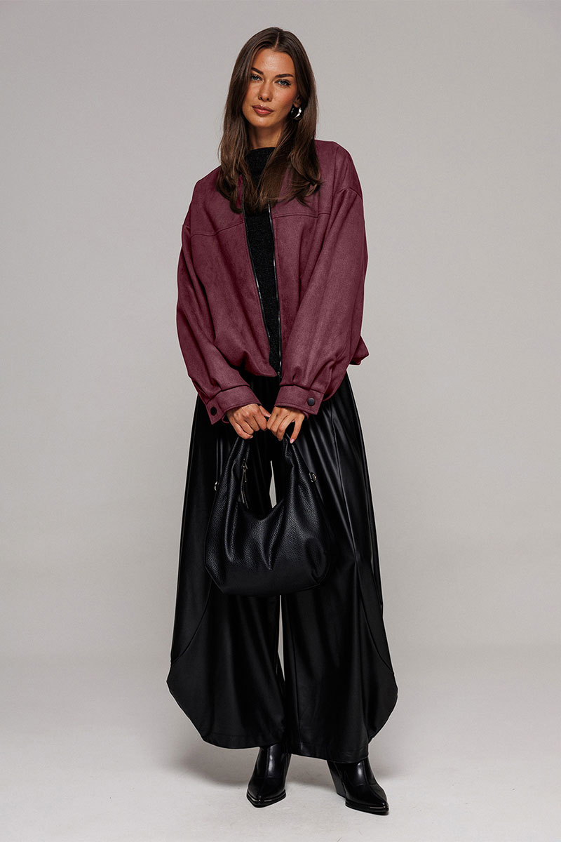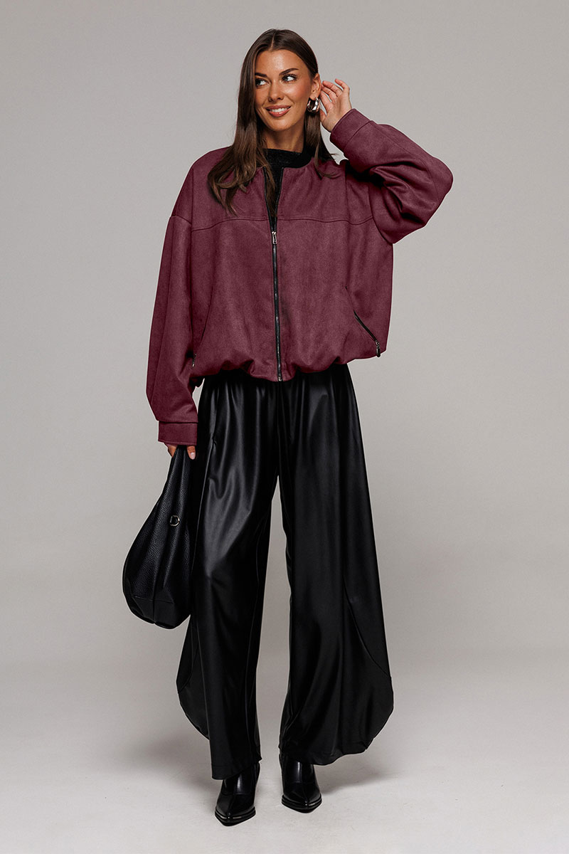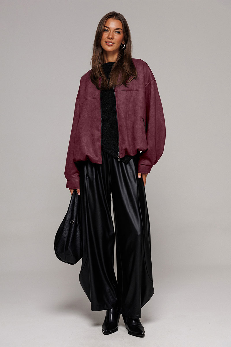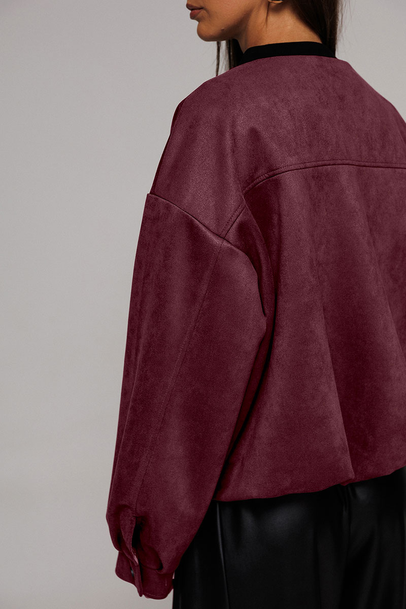Жакет-бомбер из искусственной замши свободного силуэта со спущенной линией плеча. Рукав втачной двухшовнный, внизу со складками, притачной манжетой с застежкой на кнопку. Полочка с застежкой на тесьму молнию, с кокеткой и карманами с застежкой на молнию. Синка с кокеткой. По горловине планка из довяза. Низ жакета-бомбера со сборкой. Изделие на подкладке.