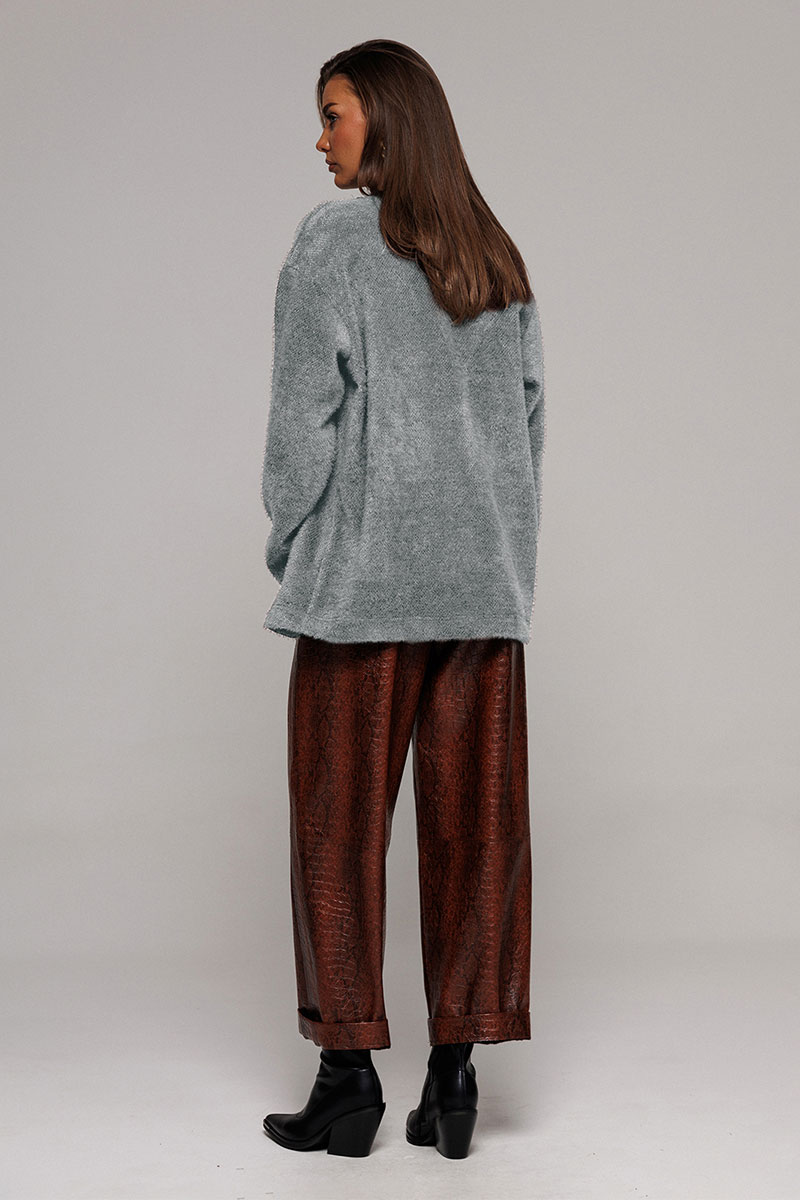 Кардиган из трикотажного полотна свободного силуэта слегка заужен к низу, со спущенной линией плеча и втачным рукавом. Полочка с V-образным вырезом и центральной застежкой на пришивные кнопки. Без подкладки.