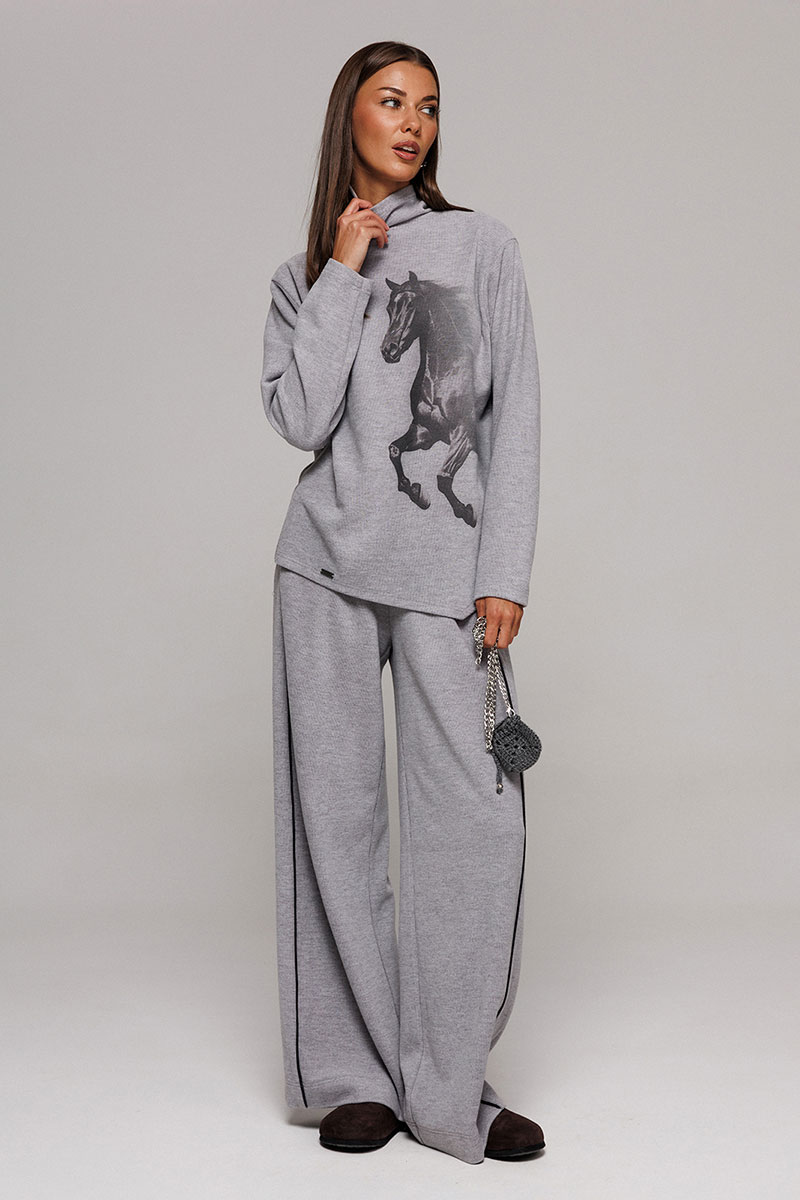 Брюки из трикотажного полотна с велюровым эффектом прямого силуэта на цельнокроеном отстроченном поясе со вставленной в него резинкой и декоративным шнурком. По бокам отрезной бочок с кантом и карманом в шве притачивания бочка.