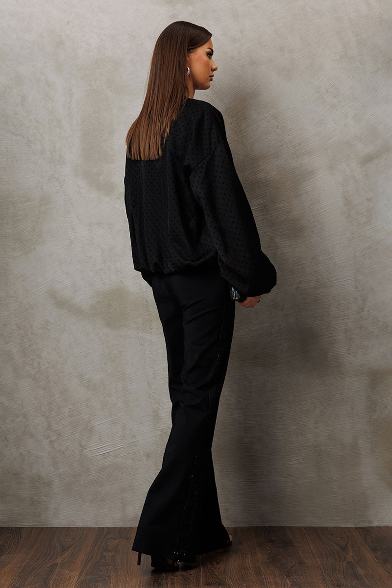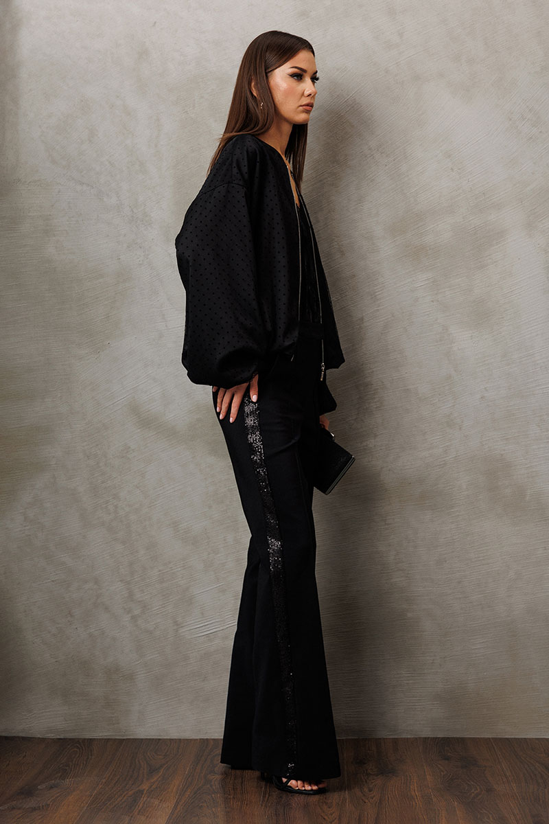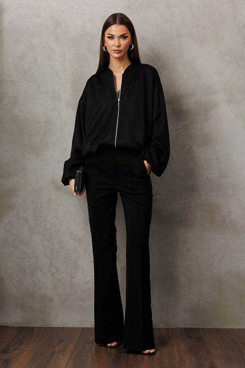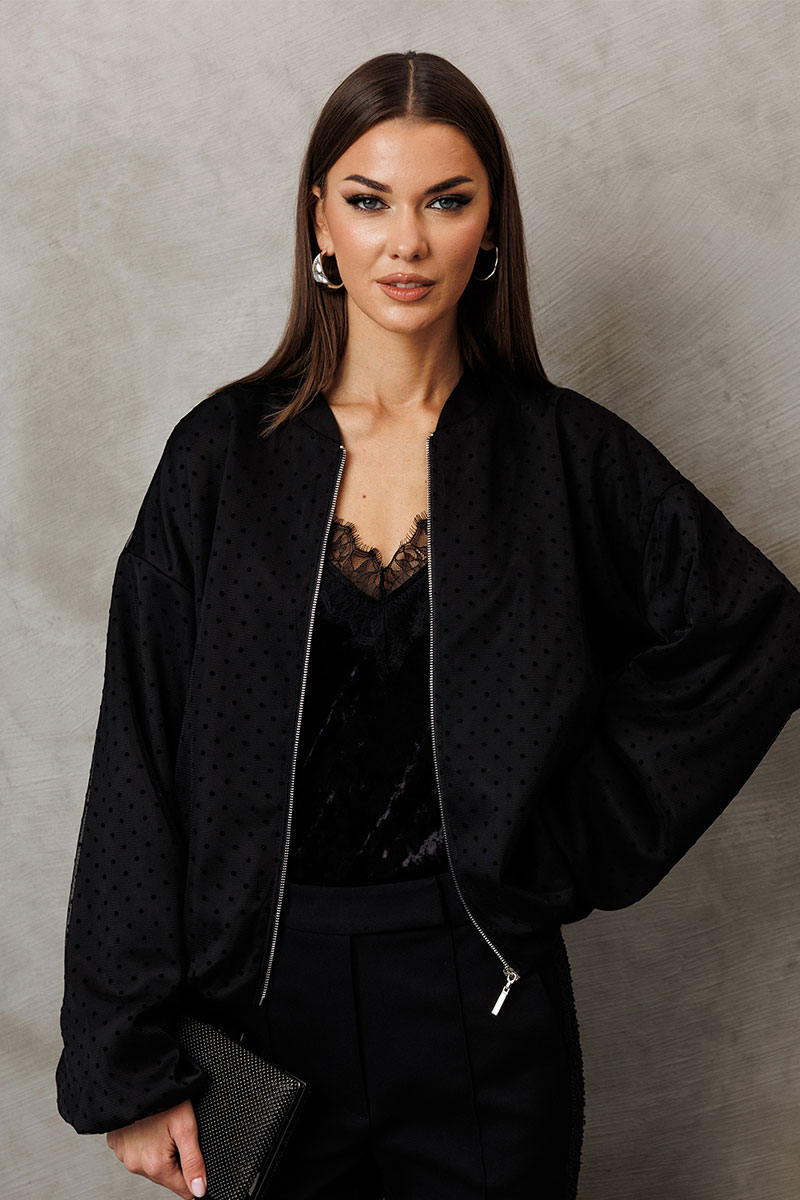 Жакет из атласа из фатина прямого силуэта со спущенной линией плеча. Рукав втачной одношовнный внизу на резинке. Полочка с центральной застежкой на тесьму-молнию. Полочка и спинка внизу на резинке. По горловине воротник-стойка. Жакет на подкладке.