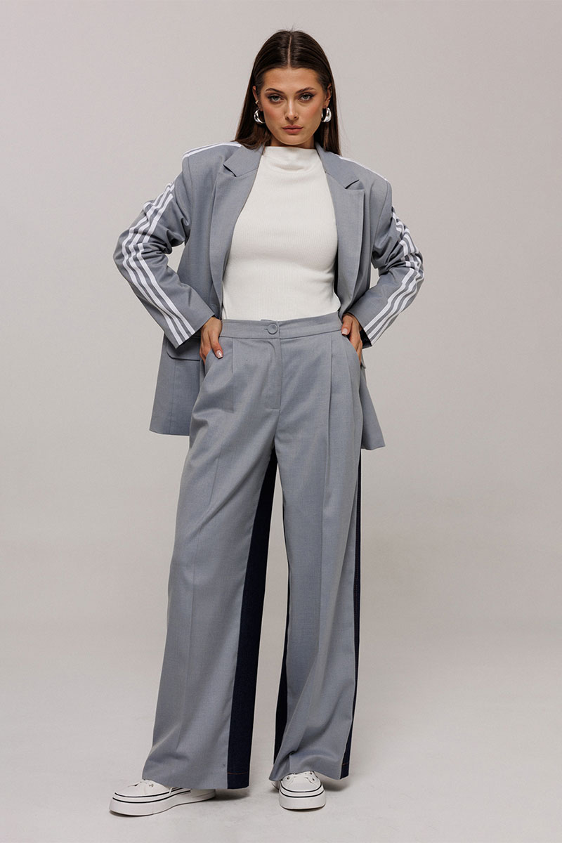 Брюки-палаццо, комбинированные из костюмной ткани по переду и джинса по спинке. Брюки на притачном поясе со шлевками и застежкой-гульфик. Пояс застегивается на петлю-пуговицу. По переду со складками и заутюженной стрелкой от одной из складок по всей длине брюк и карманами в боковых швах с наклонным входом. По спинке кокетка, накладные карманы и заутюженная стрелка.