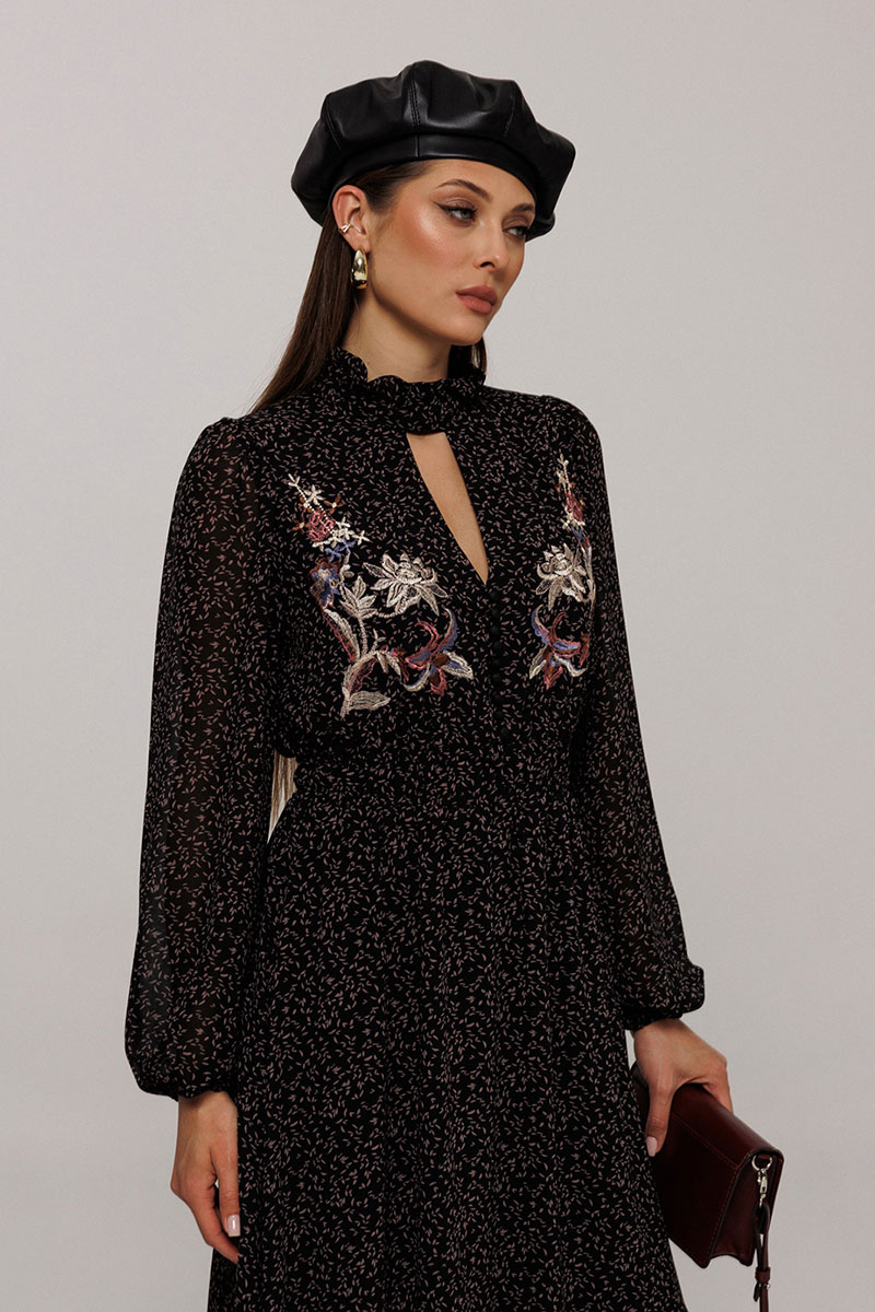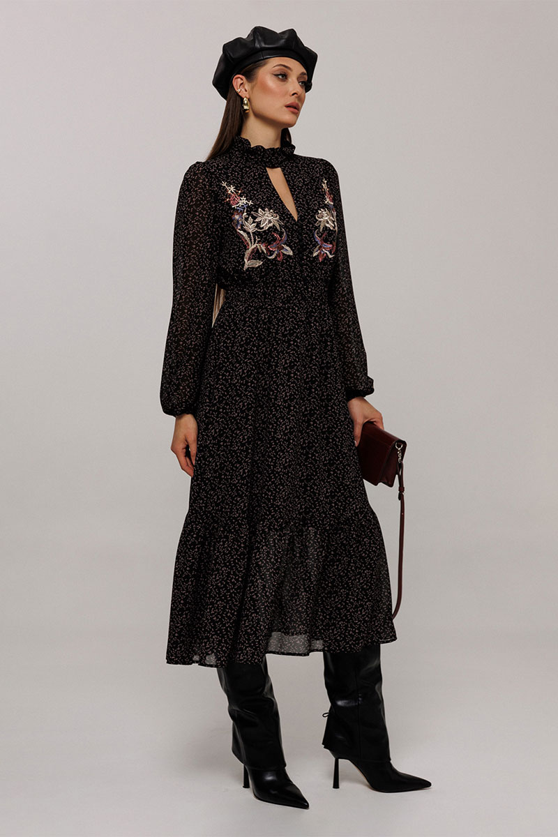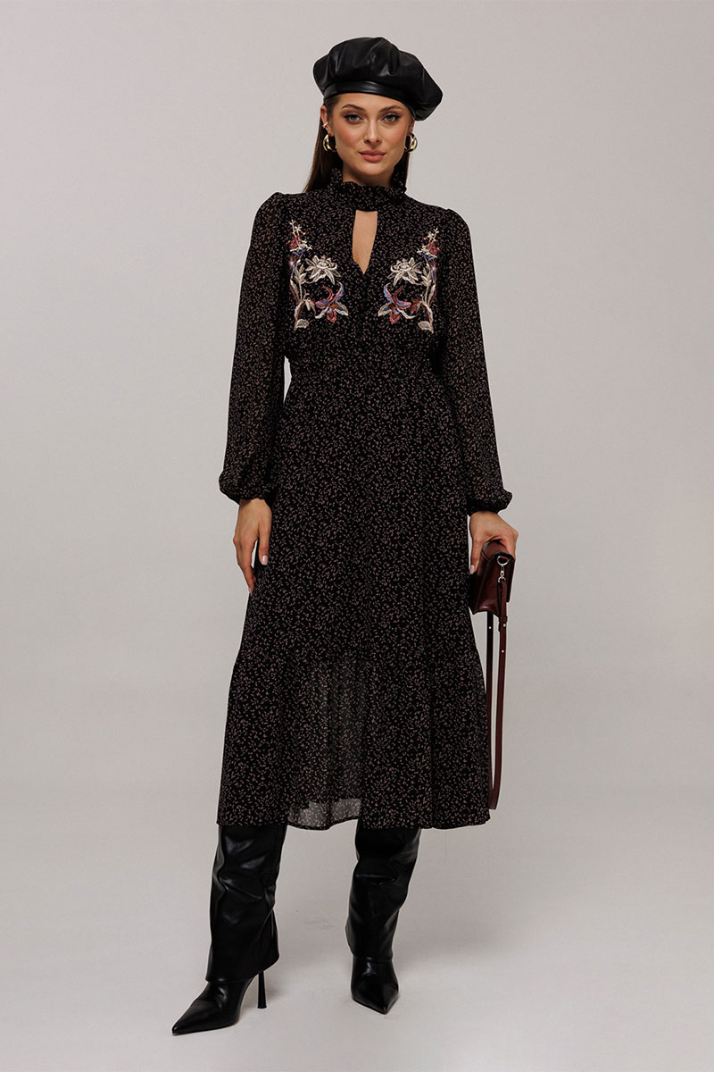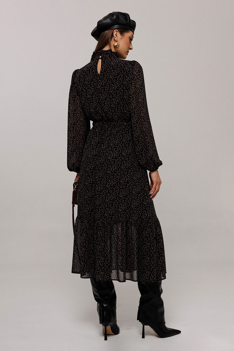 Платье полуприлегающего силуэта отрезное по линии талии, нижняя часть расширена к низу. Платье с втачным рукавом со сборкой по окату и внизу на резинке. Лиф с V-образным вырезом и имитацией центральной застежкой на пуговицы. По спинке и переду выставка на талии с резинками и по низу платья волан. По горловине стойка с рюшей и застежкой на навесную петлю пуговицу на спинке. Платье на подкладке.