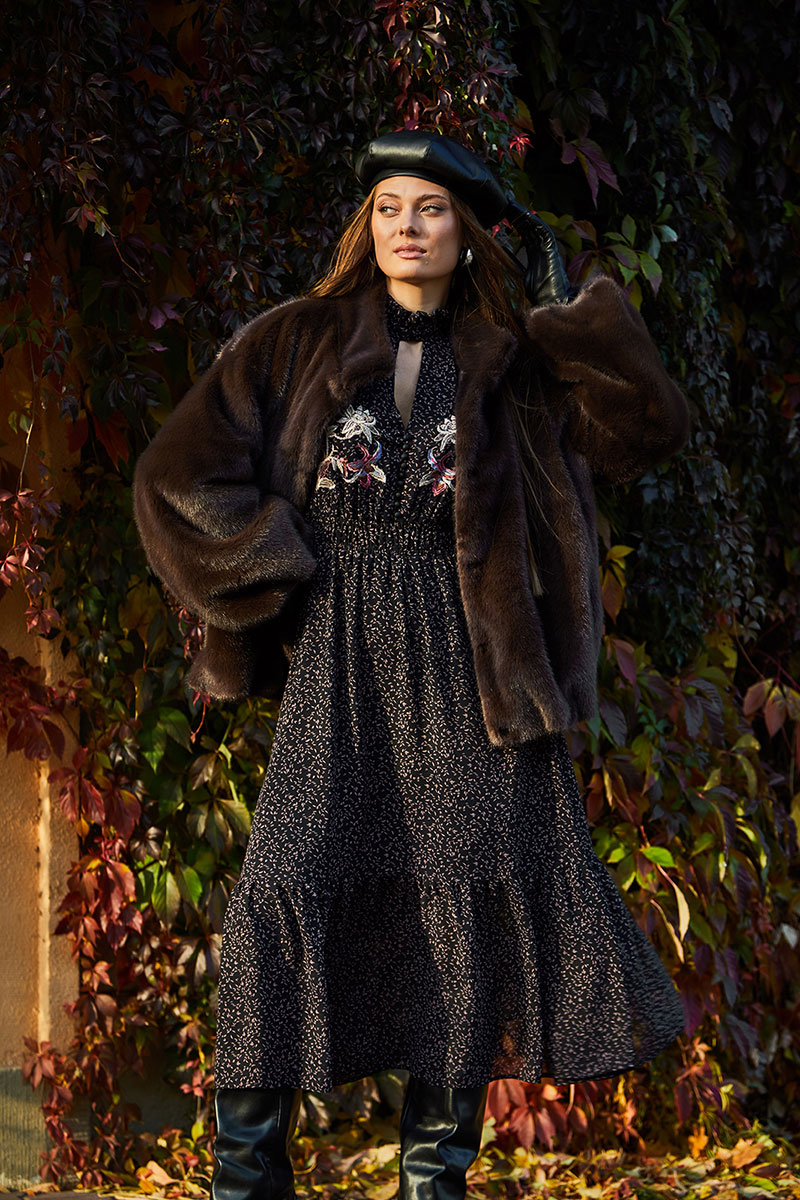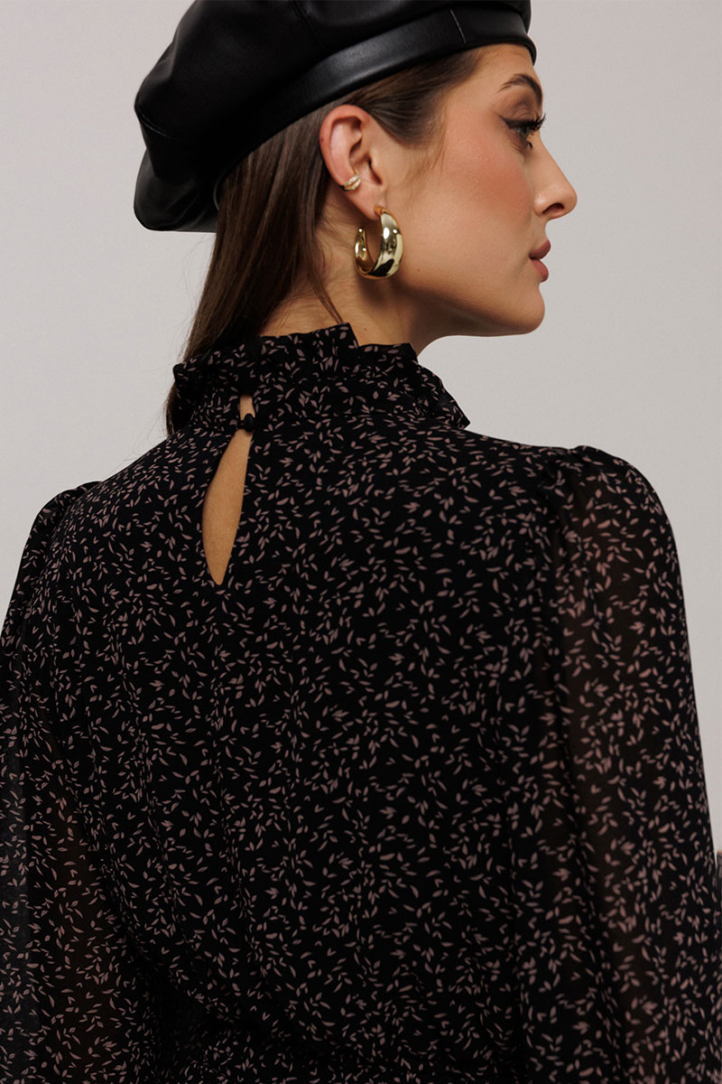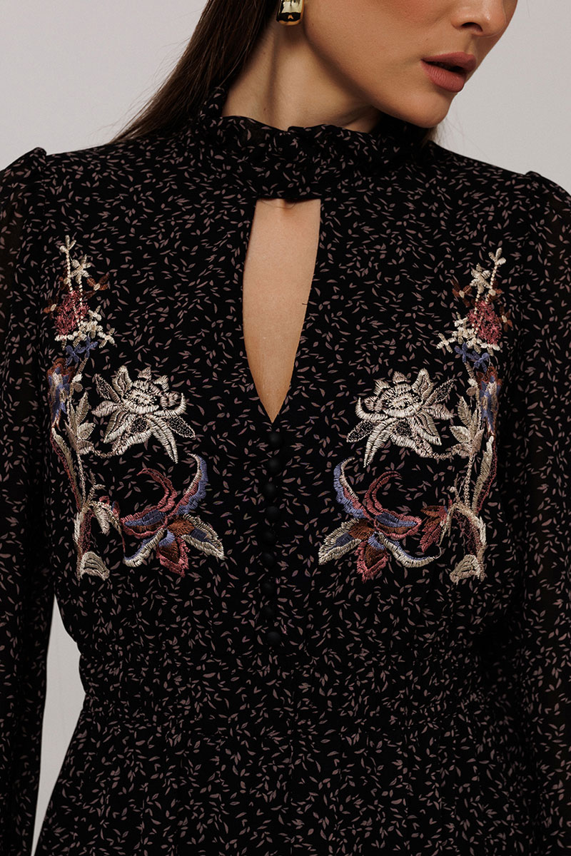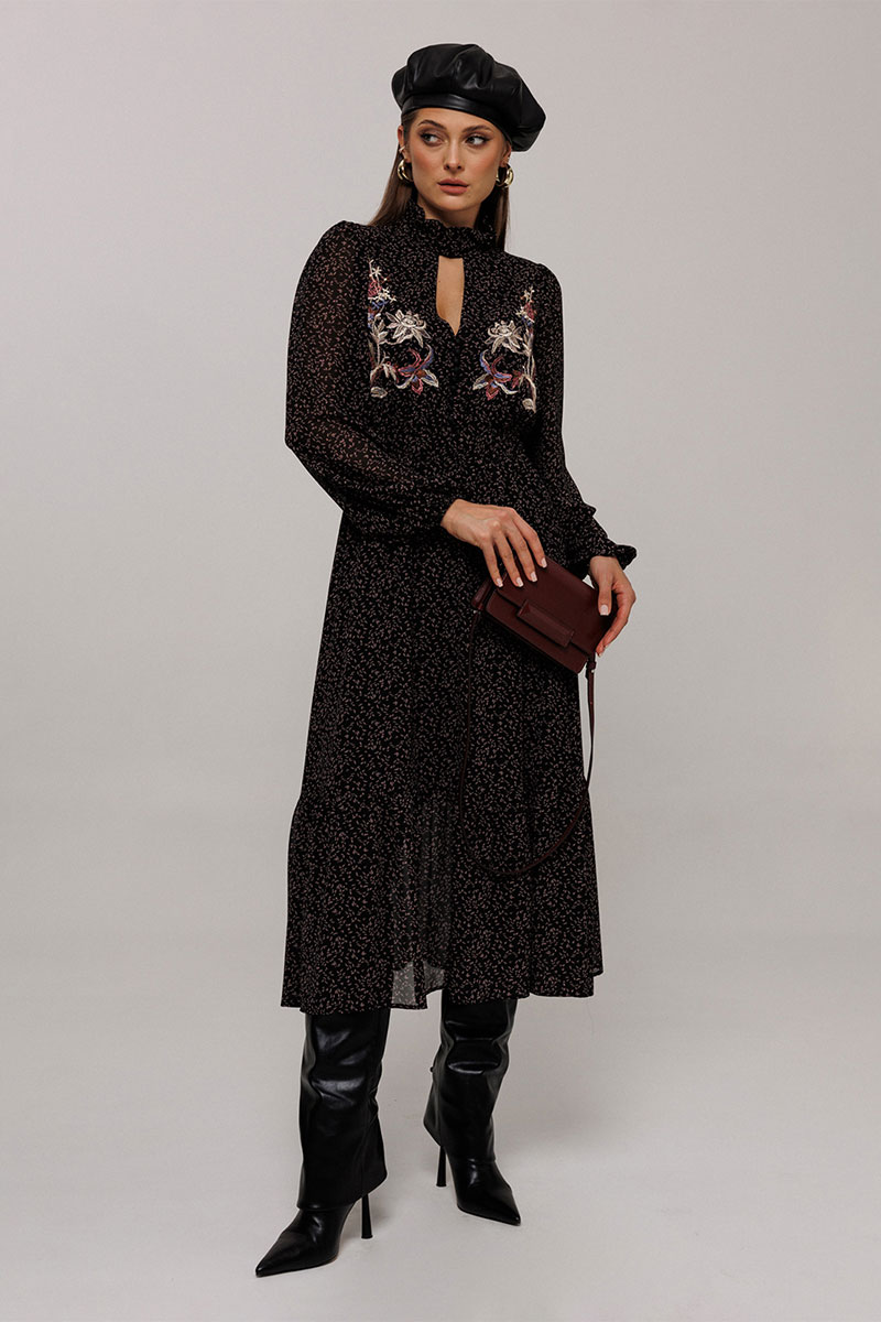Платье полуприлегающего силуэта отрезное по линии талии, нижняя часть расширена к низу. Платье с втачным рукавом со сборкой по окату и внизу на резинке. Лиф с V-образным вырезом и имитацией центральной застежкой на пуговицы. По спинке и переду выставка на талии с резинками и по низу платья волан. По горловине стойка с рюшей и застежкой на навесную петлю пуговицу на спинке. Платье на подкладке.