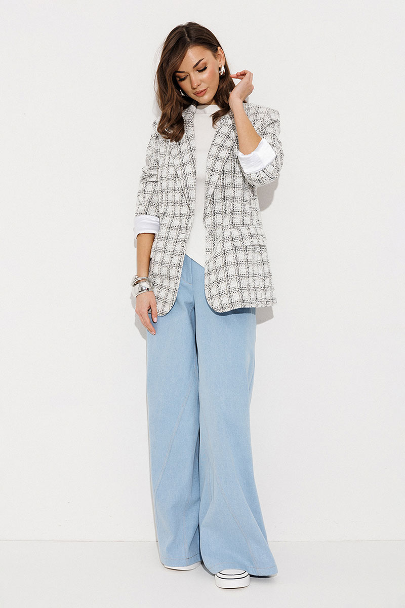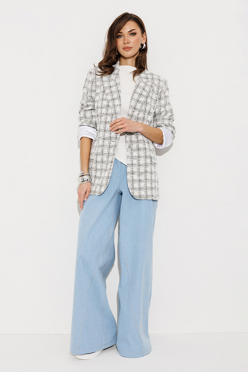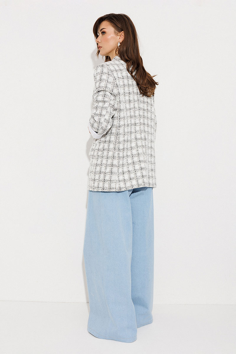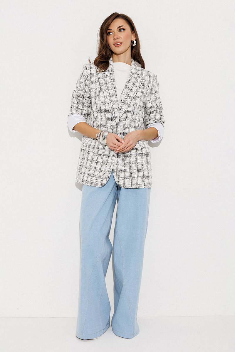 Жакет полуприлегающего силуэта, с однобортной застежкой на петлю-пуговицу, втачным двухшовным рукавом. Воротник отложной с лацканом. Полочка с талиевой вытачкой и карманом с клапаном. Спинка со средним швом. Жакет с отрезным бочком, переходящим на полочку и на спинку. Жакет на подкладке.