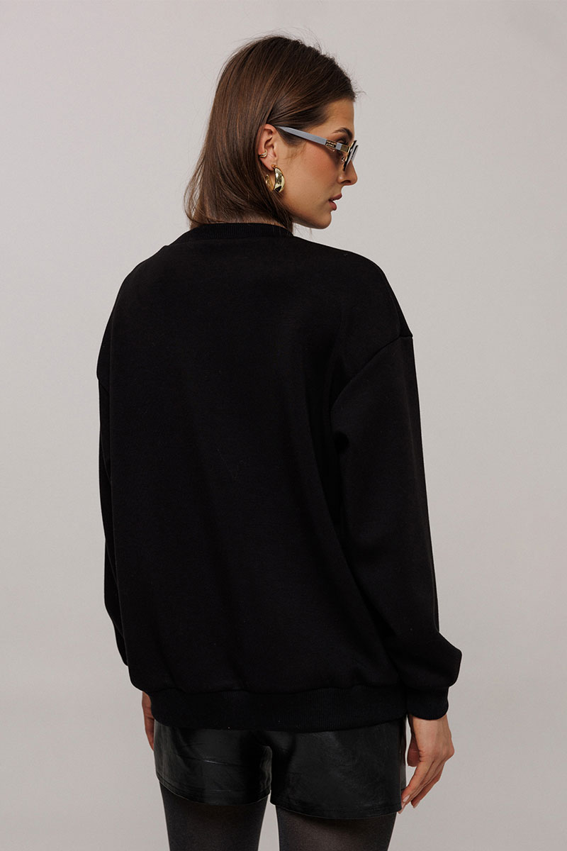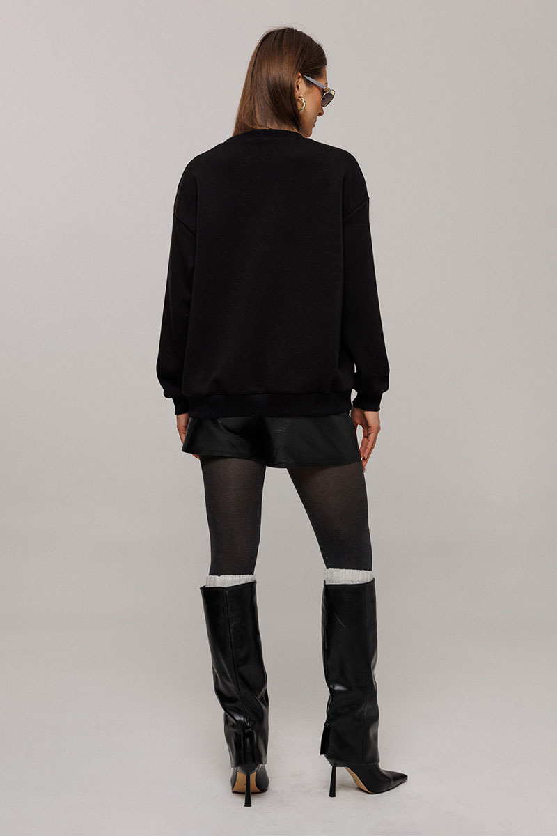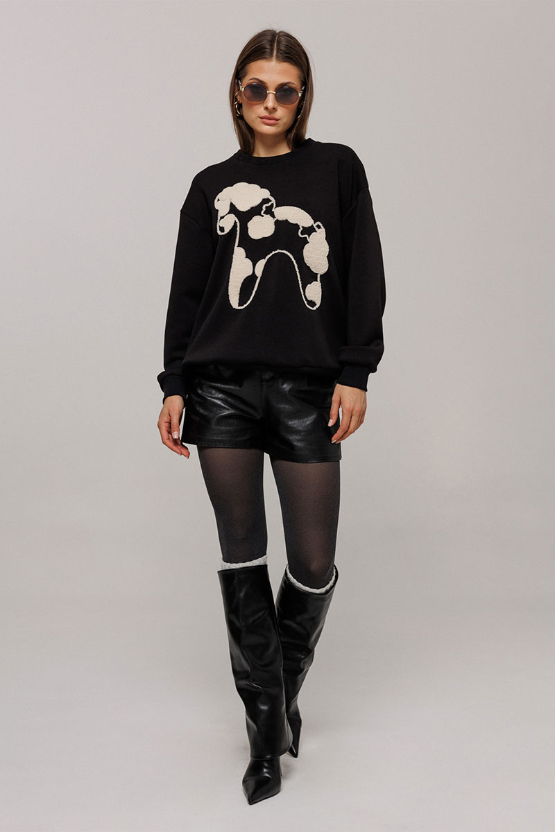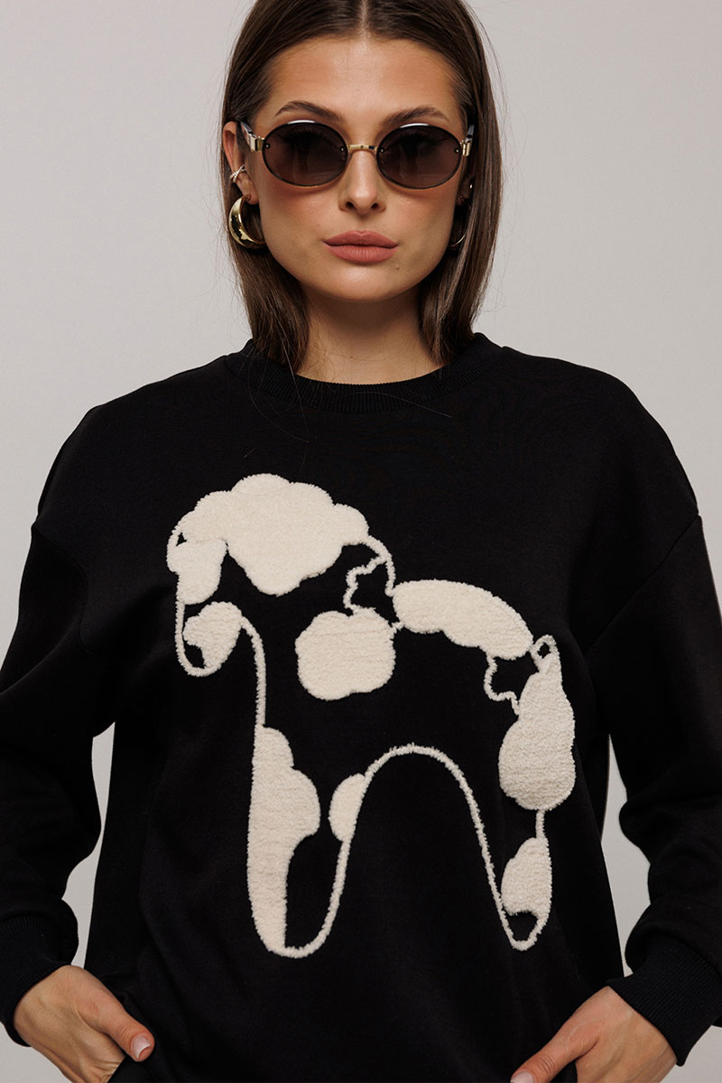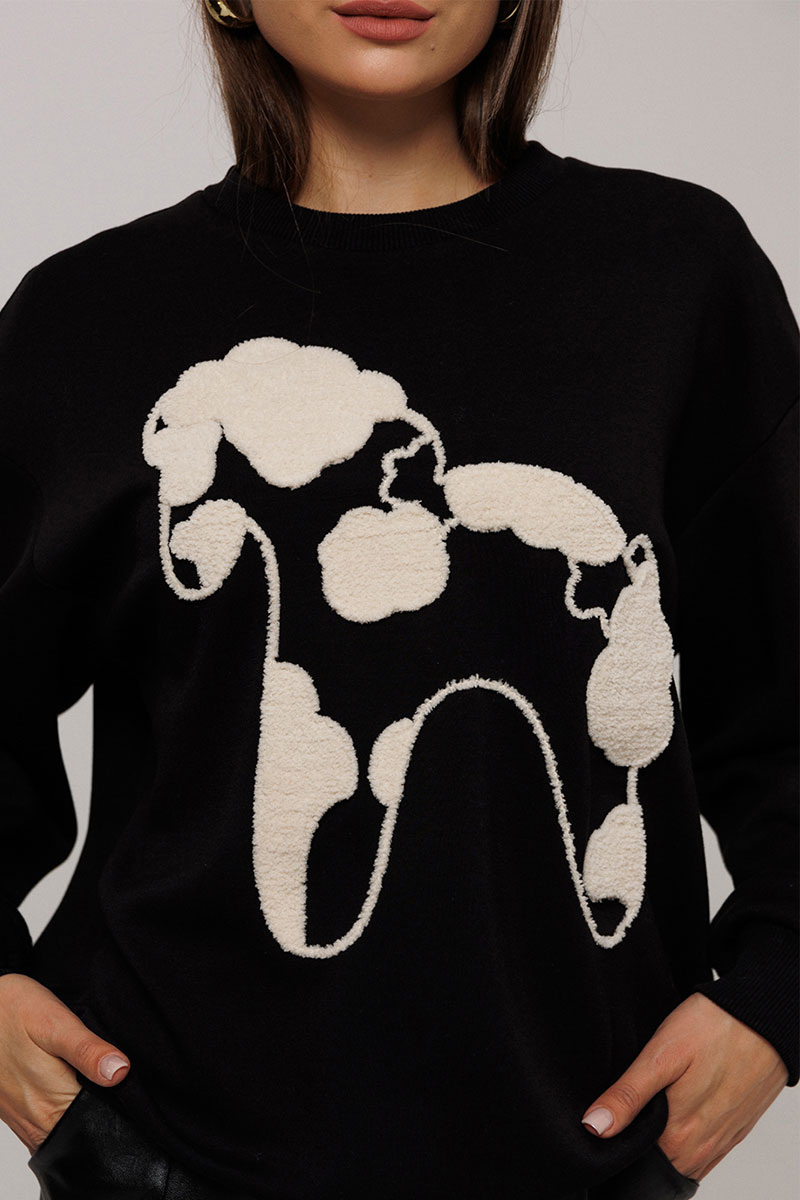 Джемпер из технологичного трикотажного полотна с эффектом peach. Прямого силуэта с втачным рукавом и спущенной линией плеча, с манжетой из отделочной ткани по низу рукава. По переду вышивка "Лошадка". По горловине и низу изделия притачная планка из отделочной ткани.