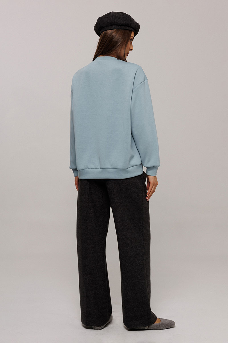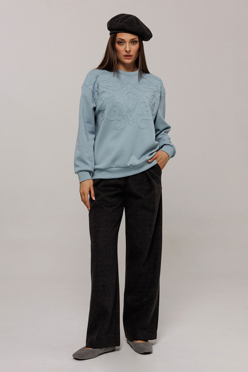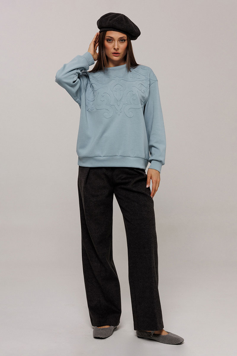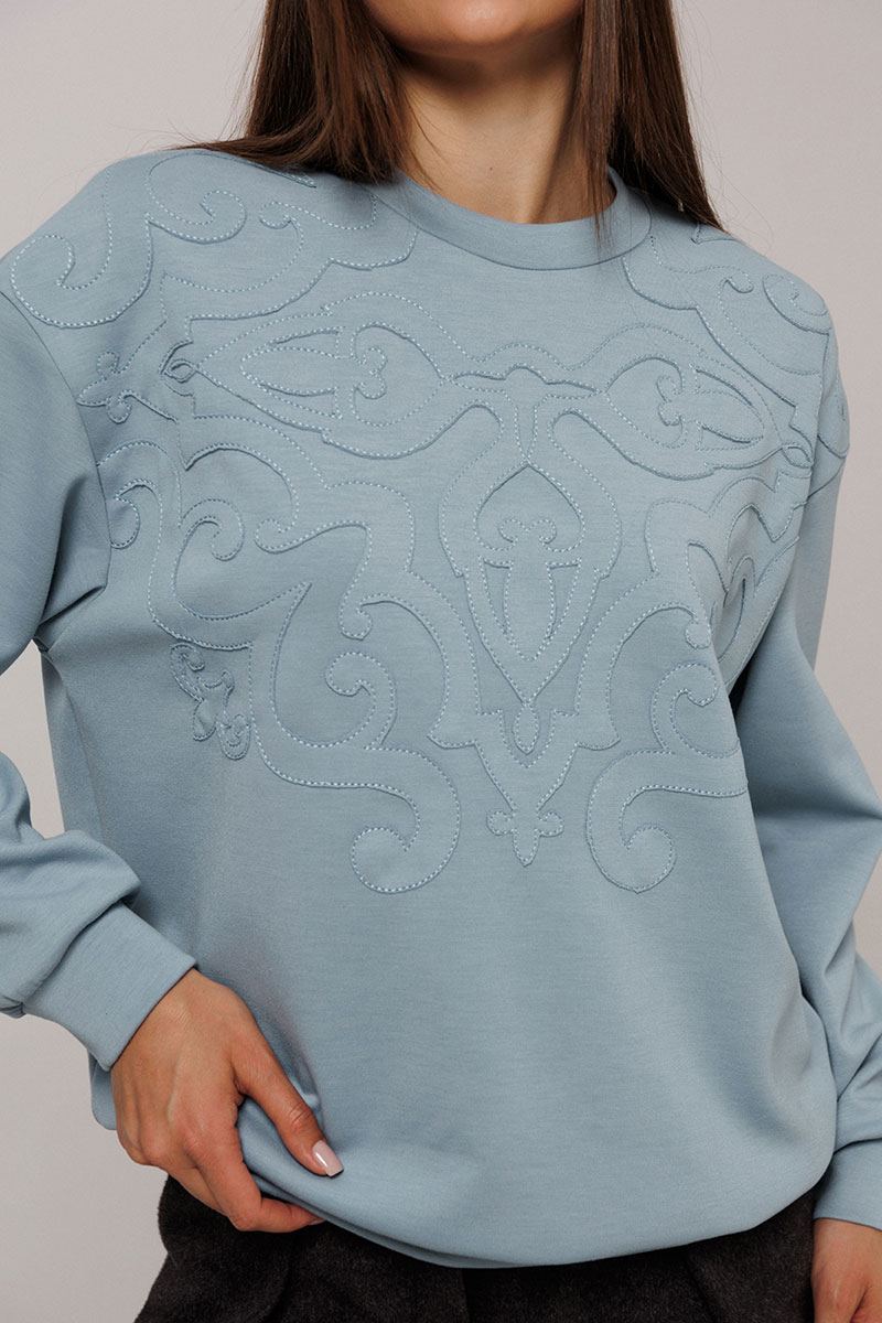Джемпер из технологичного трикотажного полотна с эффектом peach. Прямого силуэта с втачным рукавом и спущенной линией плеча, с манжетой из основной ткани по низу рукава. По переду вышивка "Орнамент". По горловине и низу изделия притачная планка из основной ткани.