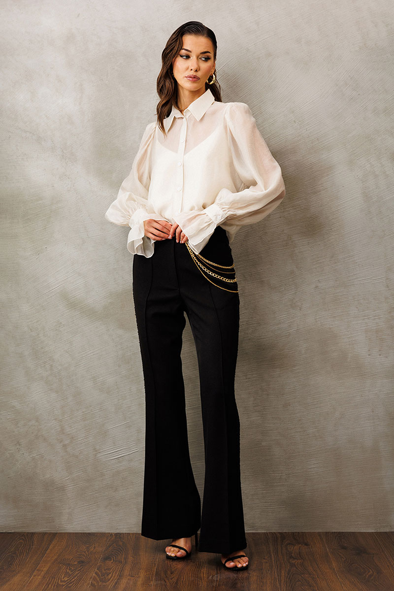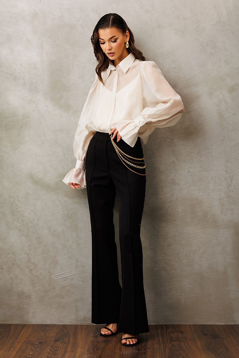 Брюки-клеш из костюмной ткани с лампасом из пайеток. Брюки на притачном поясе с уступом и застежкой-гульфик. Пояс застегивается на крючок и потайную петлю-пуговицу. По переду защип по всей длине брюк и карманами в шве притачивания к лампасу. По спинке вытачка от пояса.