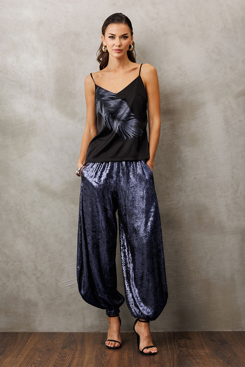 Атласная блузка-топ на регулируемых бретелях прямого силуэта, на широкой обтачке. Полочка с V-образным вырезом и нагрудной вытачкой, и печатью "Перо", и вышивкой бисером.