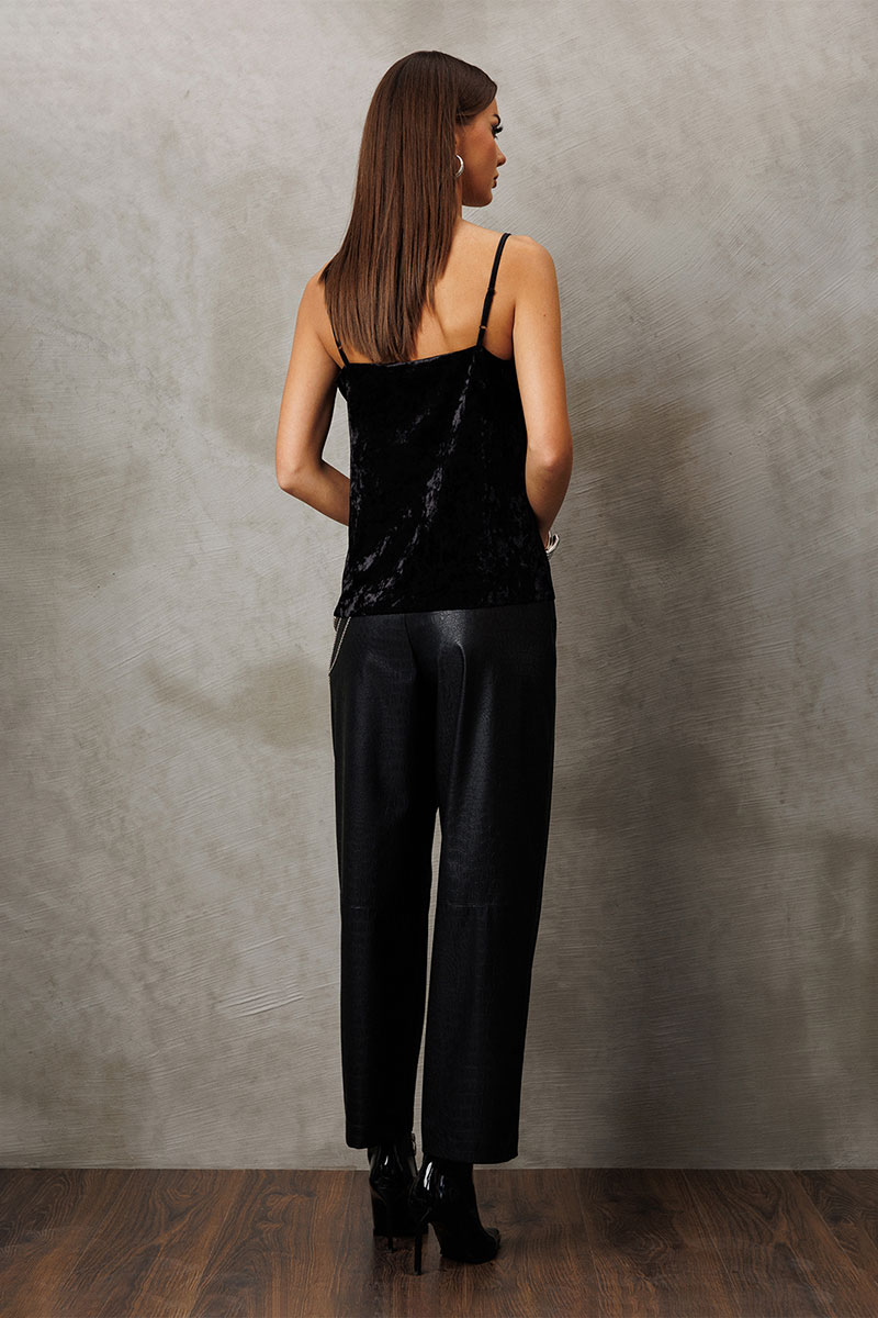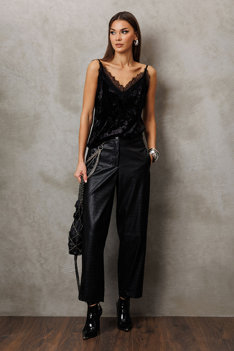 Топ из велюра с кружевом на регулируемых бретелях. Топ полуприлегающего силуэта, верху на широкой обтачке. Полочка с V-образным вырезом и кружевом по вырезу и нагрудной вытачкой.