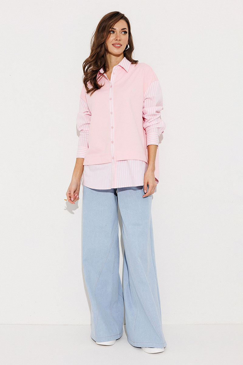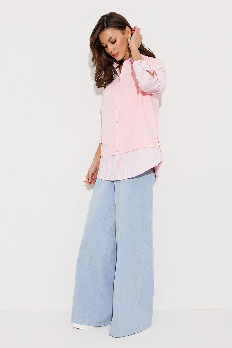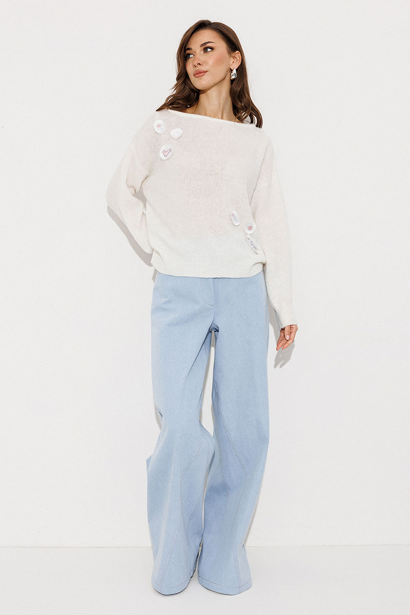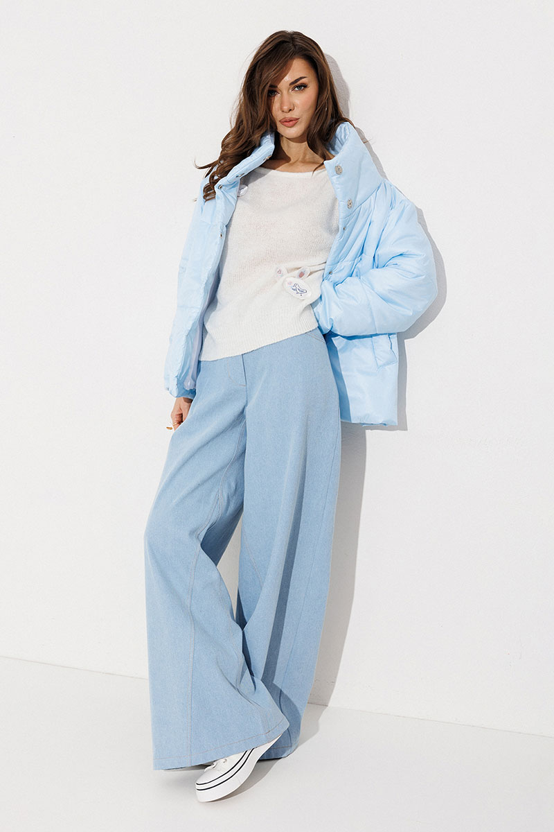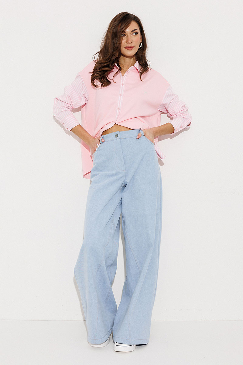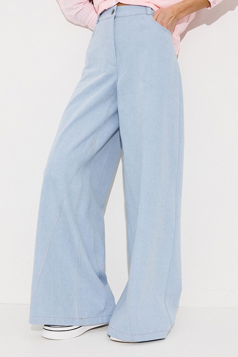 Брюки-джинсы, расклешенные к низу. На притачном поясе со шлёвками, застежкой-гульфик. Пояс застегивается на петлю-пуговицу. По переду карманы. Спинка с кокеткой и накладными карманами. По шаговому шву клин из основной ткани, переходящий на перед и спинку.