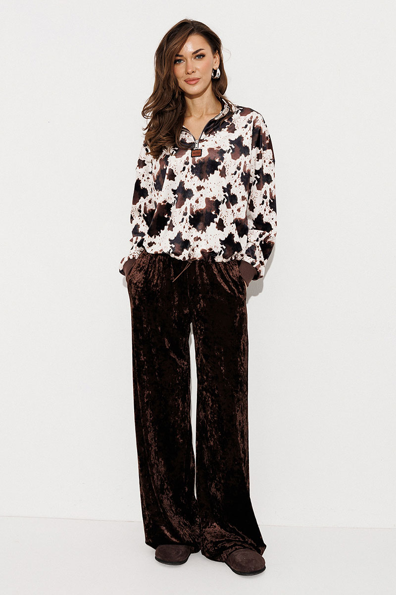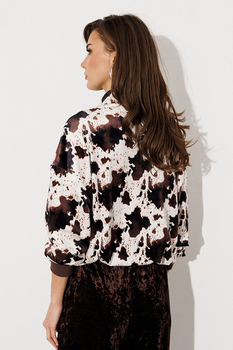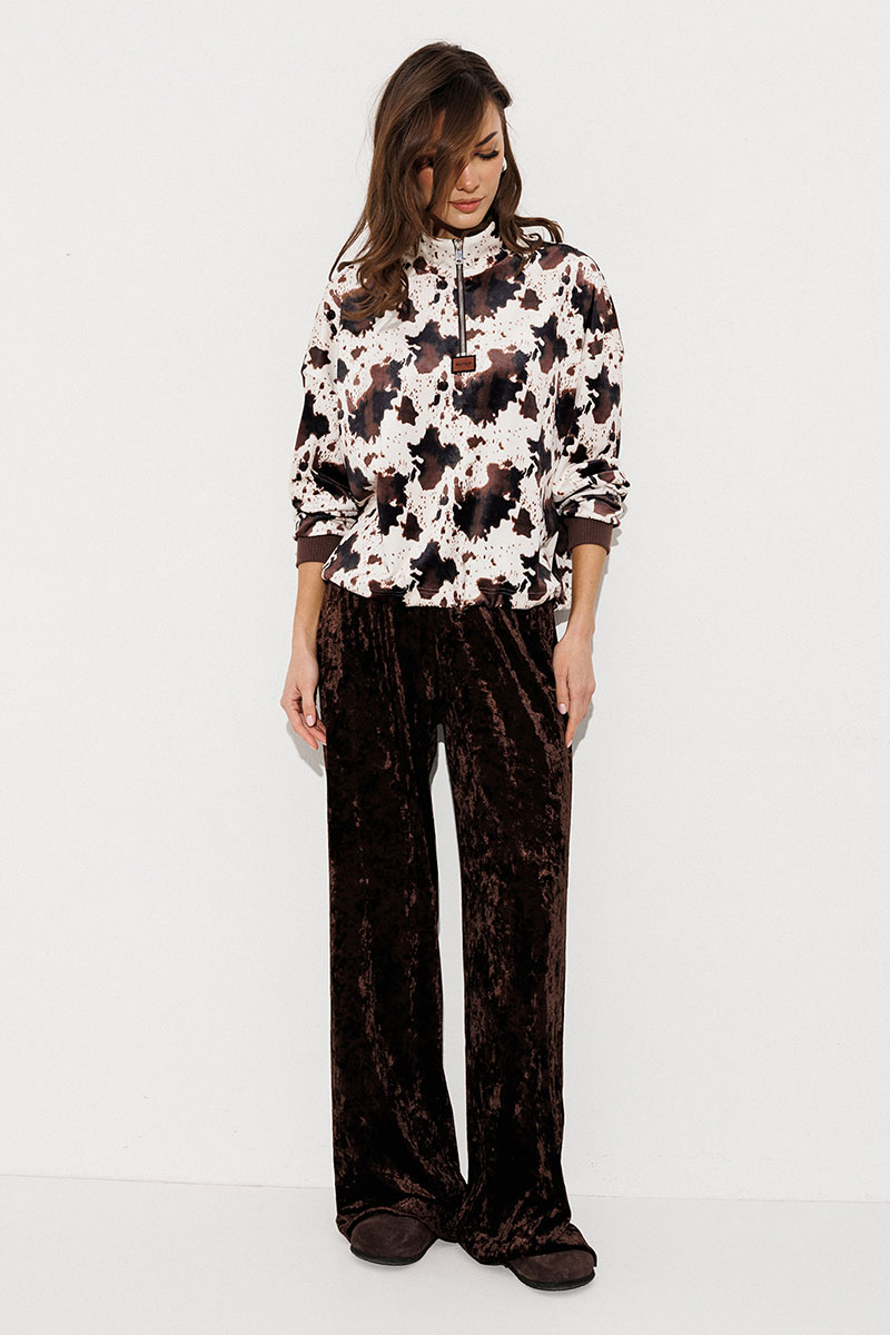 Джемпер из принтованного велюра прямого силуэта с втачным рукавом и спущенной линией плеча, с манжетой из довяза по низу рукава. По переду молния и нашивка "BUTER". Воротник-стойка. По низу подгибка со вставленной в него эластичной тесьмой и фиксатором, благодаря которому низ можно затянуть.