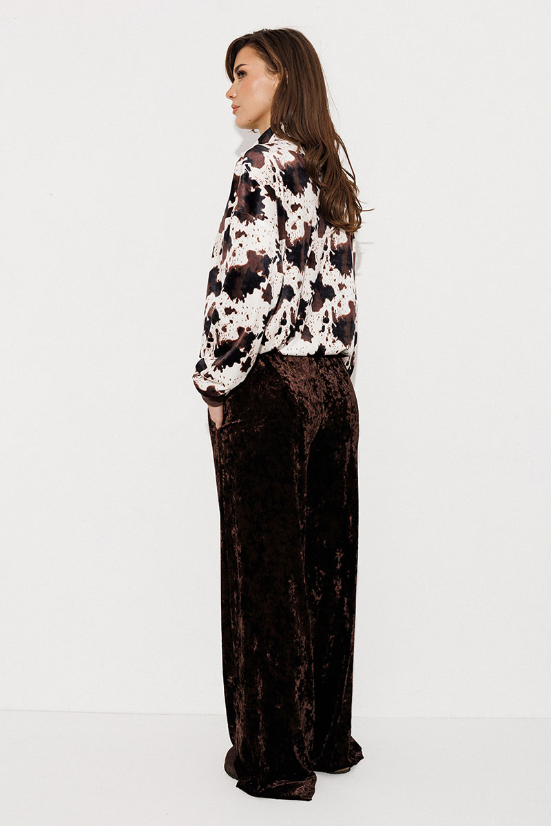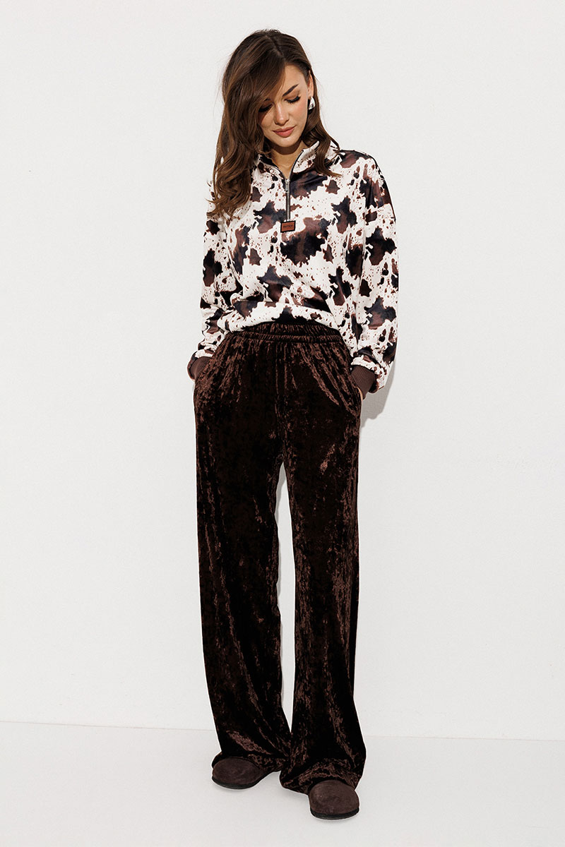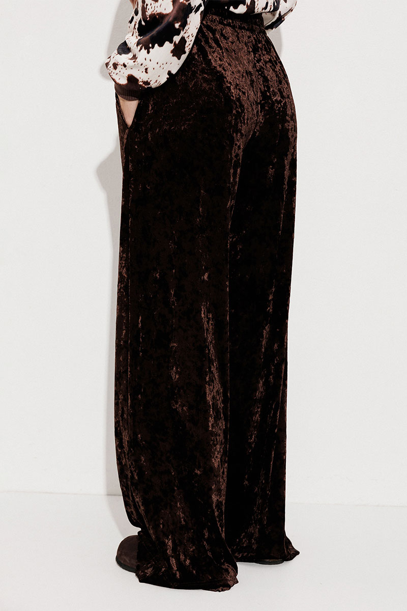 Брюки из однотонного велюра на цельнокроеном отстроченным поясе со вставленной в него резинкой. Брюки прямого силуэта с карманами в боковых швах.