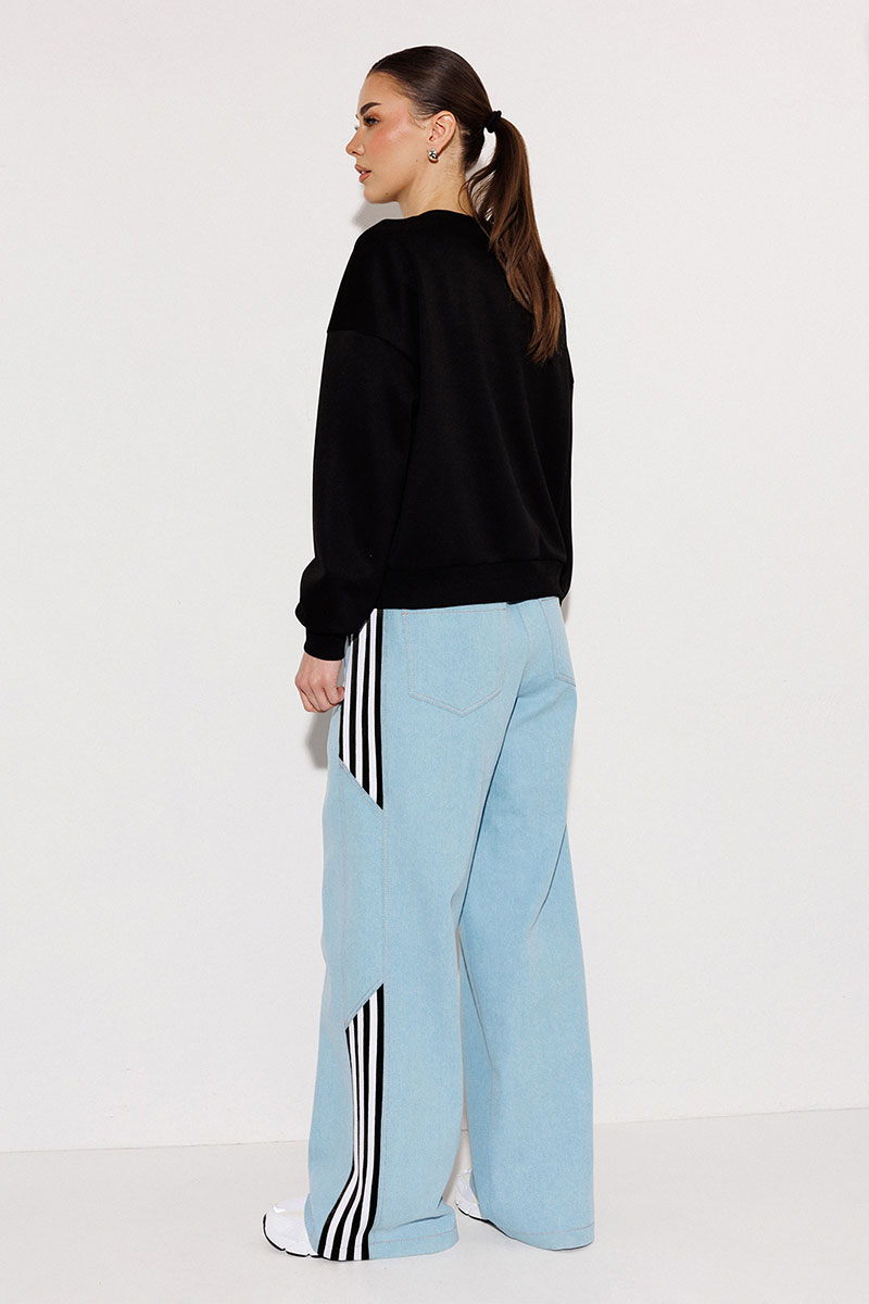 Брюки-джинсы, комбинированные, прямого силуэта. На притачном отстроченном поясе с втянутым в него декоративным шнурком. Перед и спинка выполнены из джинса. По переду карманы в шве с наклонным входом. По спинке накладные карманы с нашивкой "BUTER". По бокам отрезной бочок, комбинированный из замшевой отделочной ткани, по которой отстрочено 3 узких лампаса и центральная вставка из джинса.