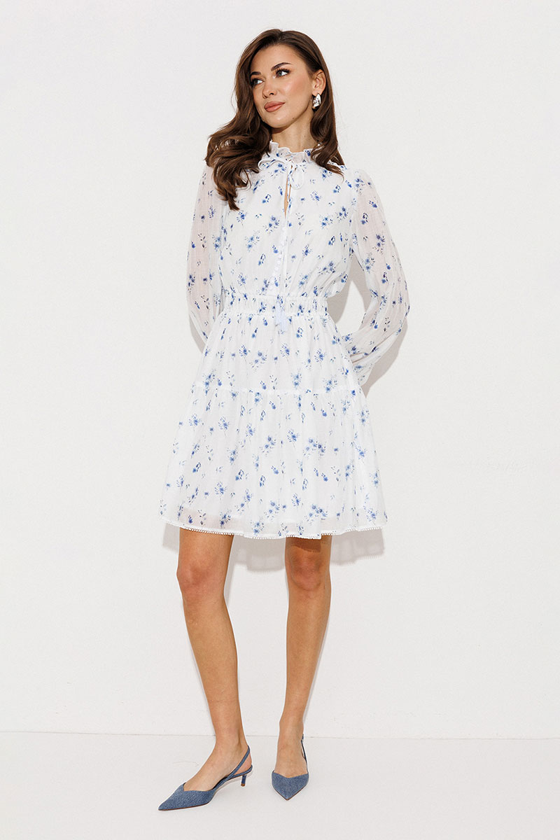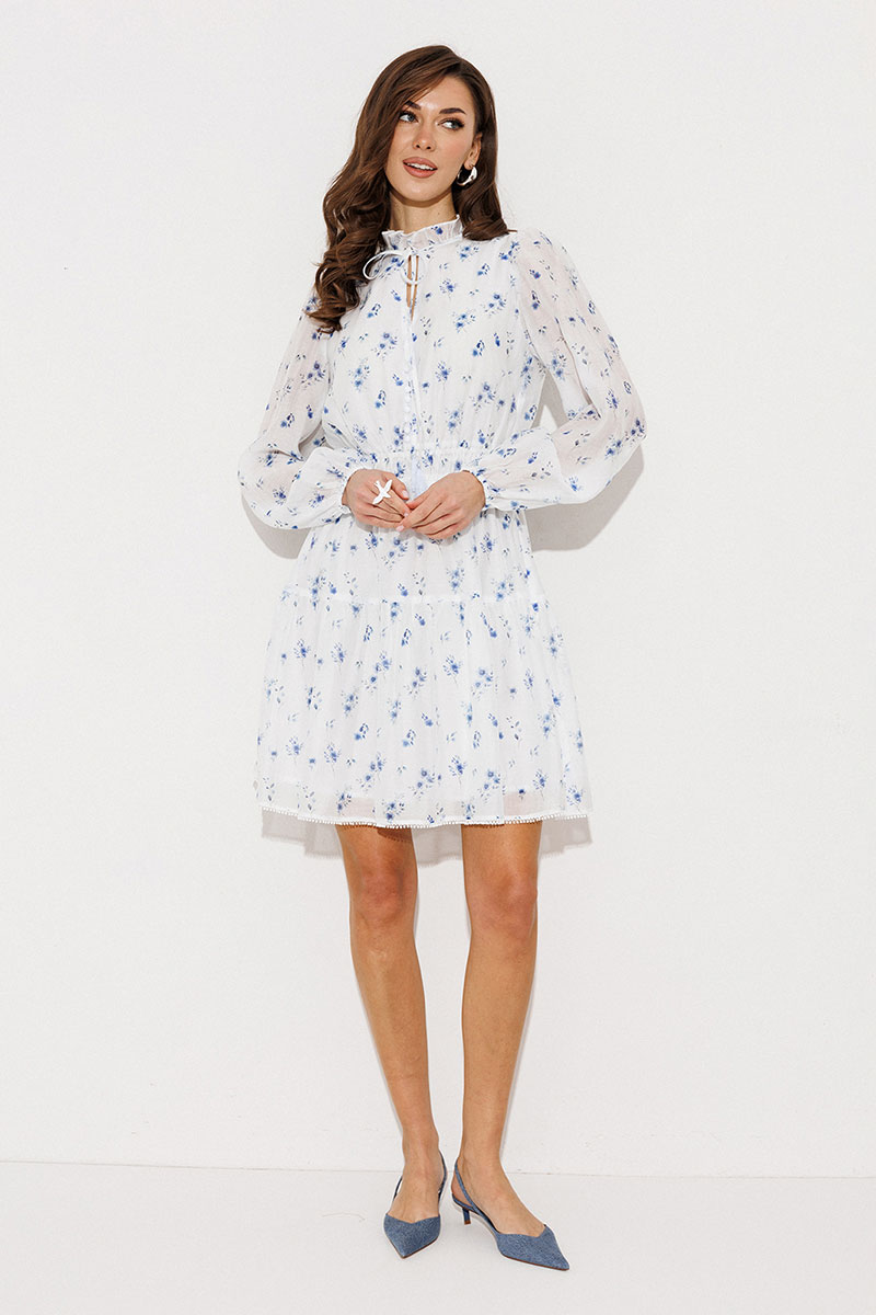 Платье полуприлегающего силуэта отрезное по линии талии, нижняя часть расширена, с воланом по низу. Платье с втачным рукавом со сборкой по окату и внизу на резинке. Лиф с V-образным вырезом и имитацией центральной застежкой на пуговицы. По спинке и переду вставка на талии с резинками. По горловине стойка с рюшей, которая завязывается по переду. Платье на подкладке.