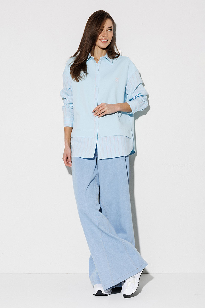 Блузка, комбинированная прямого силуэта, с втачным одношовным рукавом, со складкой и манжетой, с застежкой на петли-пуговицы и спущенной линией плеча. Полочка из трикотажа и рубашечной ткани с центральной застежкой на петли-пуговицы и вышивкой "Самолет". Спинка из трикотажа с печатью "BUTER". Воротник рубашечный отложной на стойке. Спинка и полочка с фигурным низом. Внизу по боковым швам обработаны разрезы.