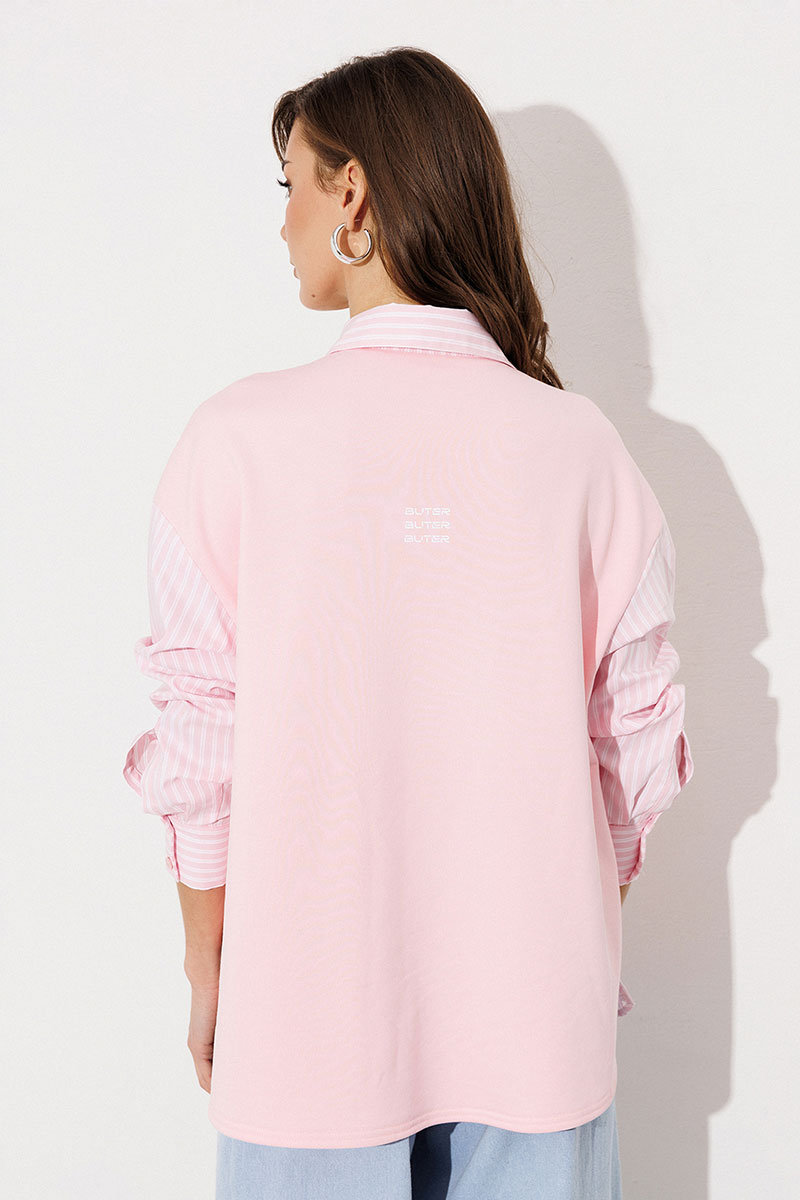 Блузка, комбинированная прямого силуэта, с втачным одношовным рукавом, со складкой и манжетой, с застежкой на петли-пуговицы и спущенной линией плеча. Полочка из трикотажа и рубашечной ткани с центральной застежкой на петли-пуговицы и вышивкой "Самолет". Спинка из трикотажа с печатью "BUTER". Воротник рубашечный отложной на стойке. Спинка и полочка с фигурным низом. Внизу по боковым швам обработаны разрезы.