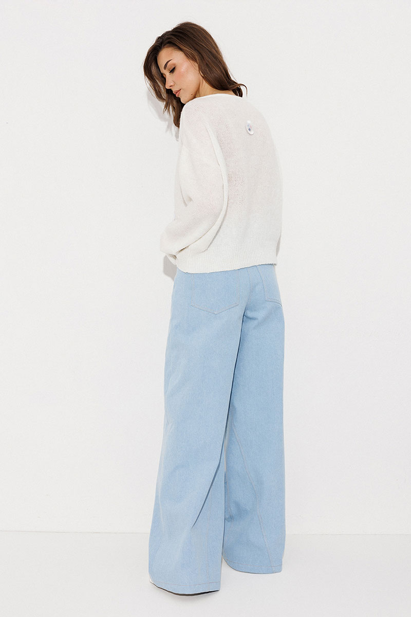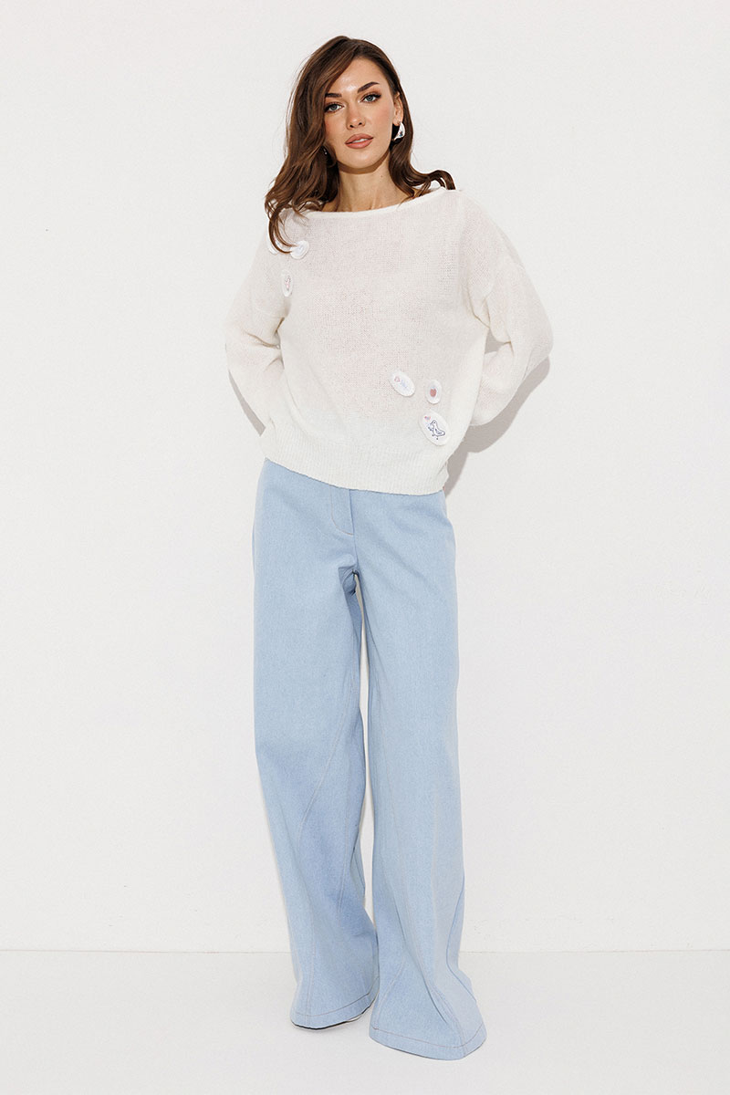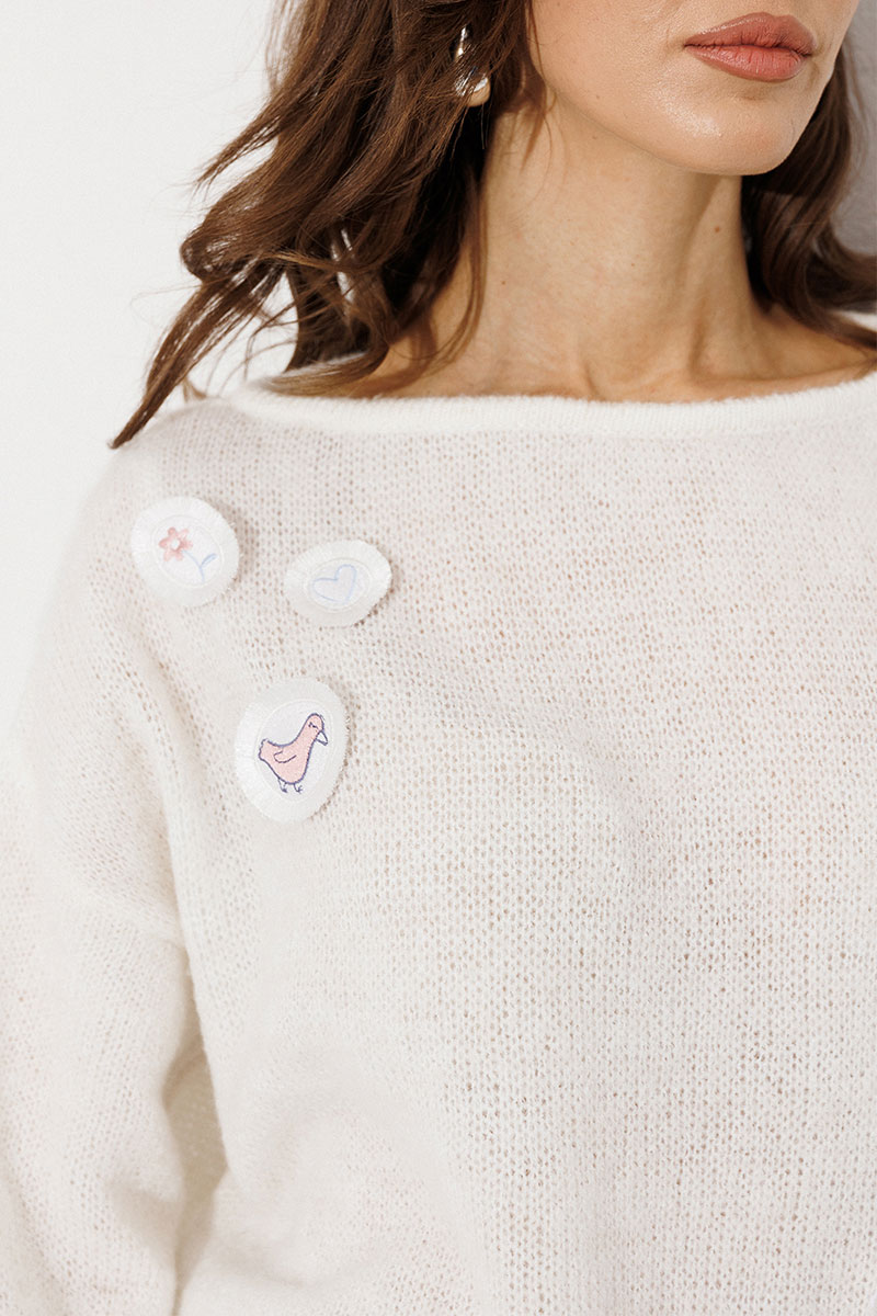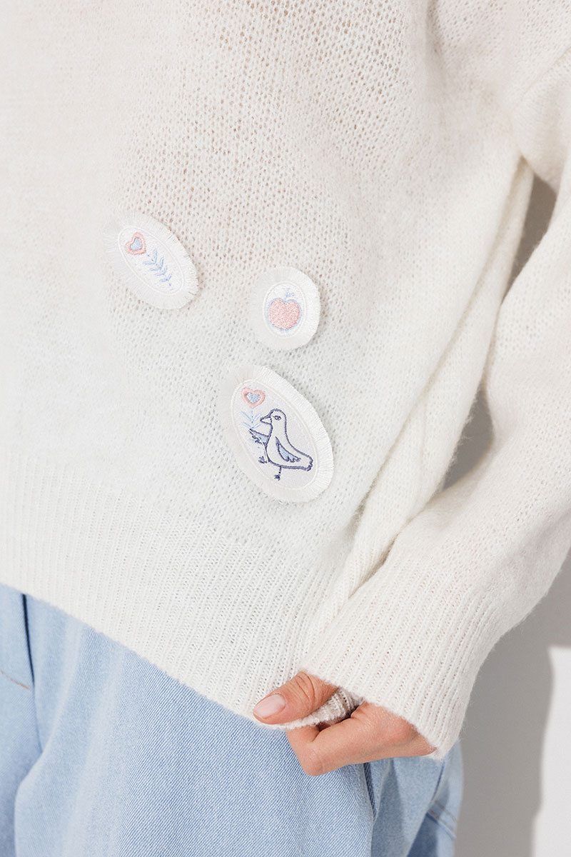 Джемпер трикотажный вязаный с втачным длинным рукавом и спущенной линией плеча. По переду и спинке нашивки. Вырез горловины круглый.