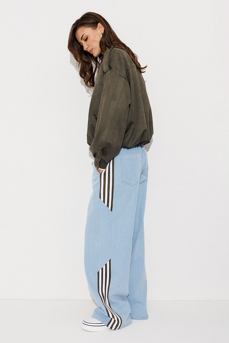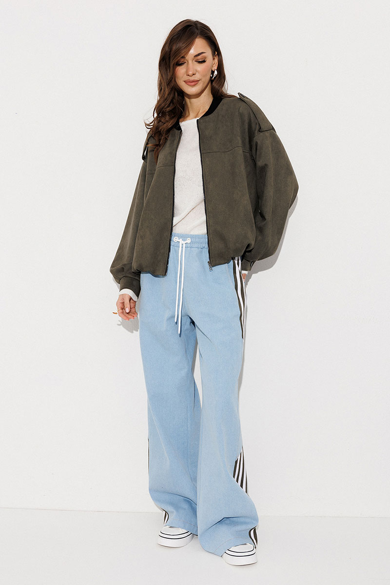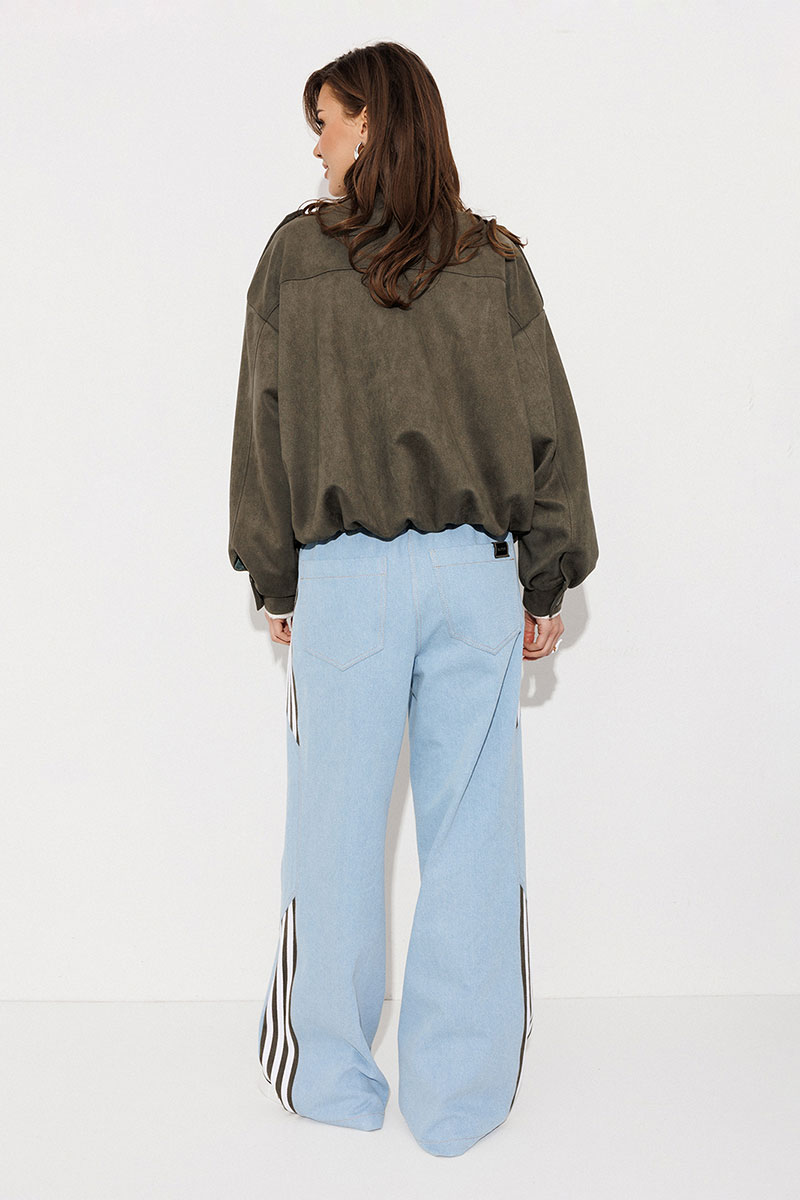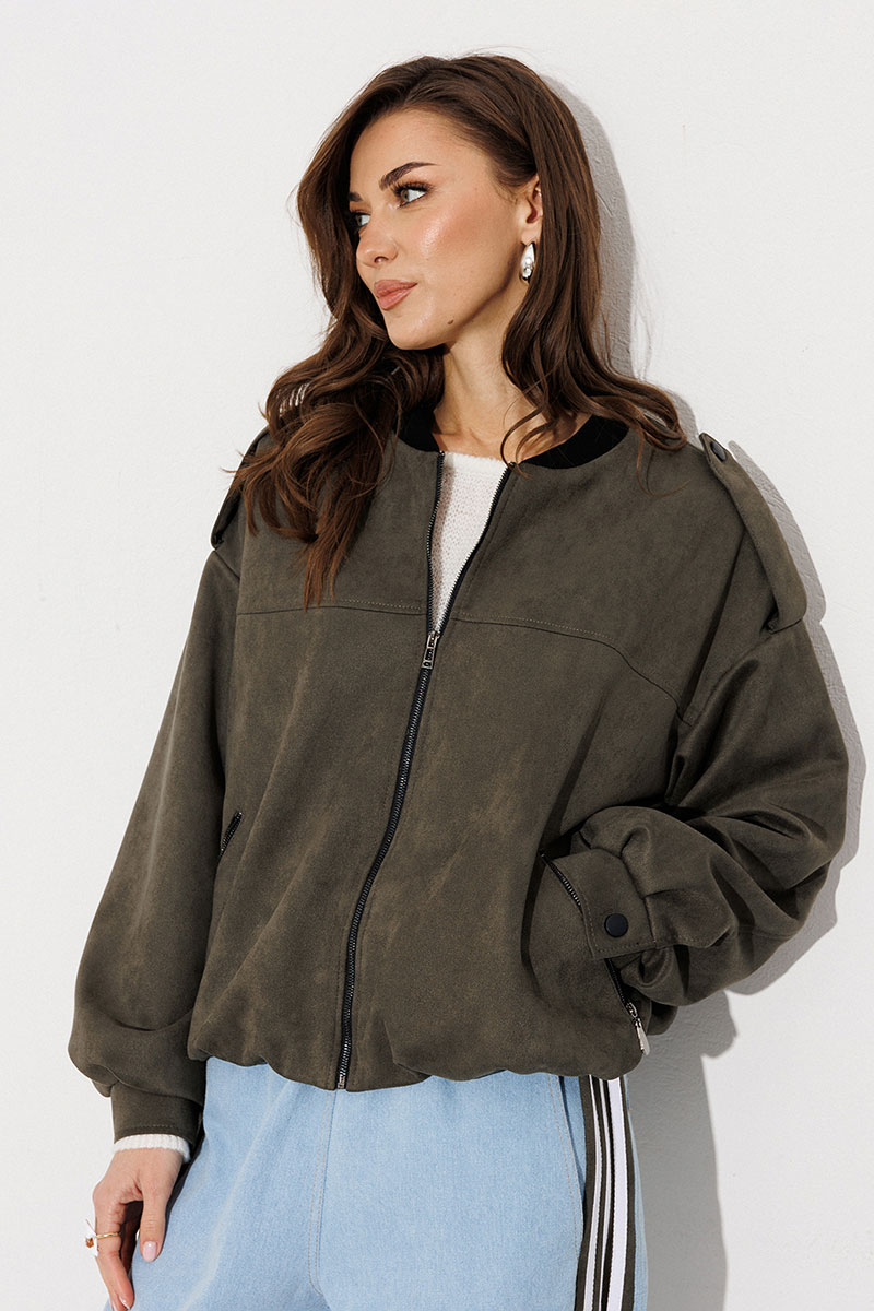Курта из замши прямого силуэта со спущенной линией плеча. Рукав втачной двух шовный внизу со складками от притачной планки с застежкой на кнопку. Полочка с застежкой на тесьму молнию, с кокеткой и карманами с застежкой на молнию. Спинка с кокеткой. По плечевому шву погон с застежкой на кнопку. По горловине планка из довяза. Низ куртки со сборкой. Куртка на подкладке.