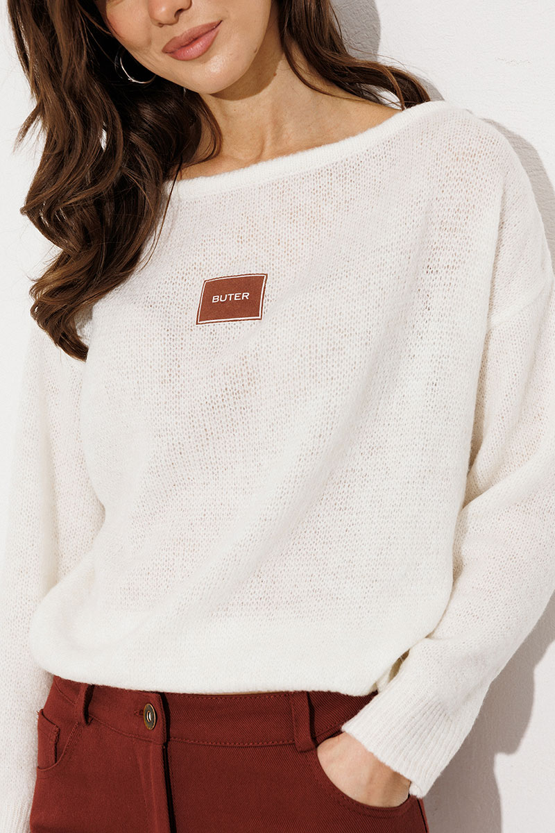 Джемпер трикотажный вязаный с втачным рукавом и спущенной линией плеча. По перу нашивка с логотипом «BUTER». Вырез горловины круглый.