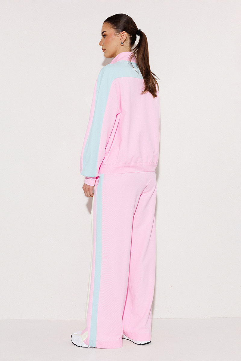 Брюки мультиколор трикотажные (2-хнитка) прямого силуэта на цельнокроеном отстроченном поясе со вставленной в него резинкой и декоративным шнурком. По бокам лампасы из ткани другого цвета и карманом-листочкой от бокового шва.