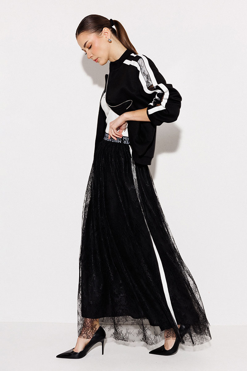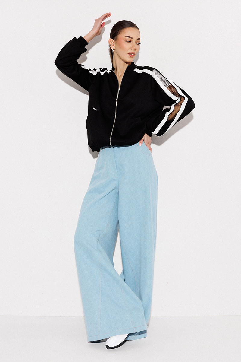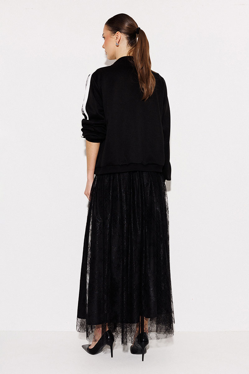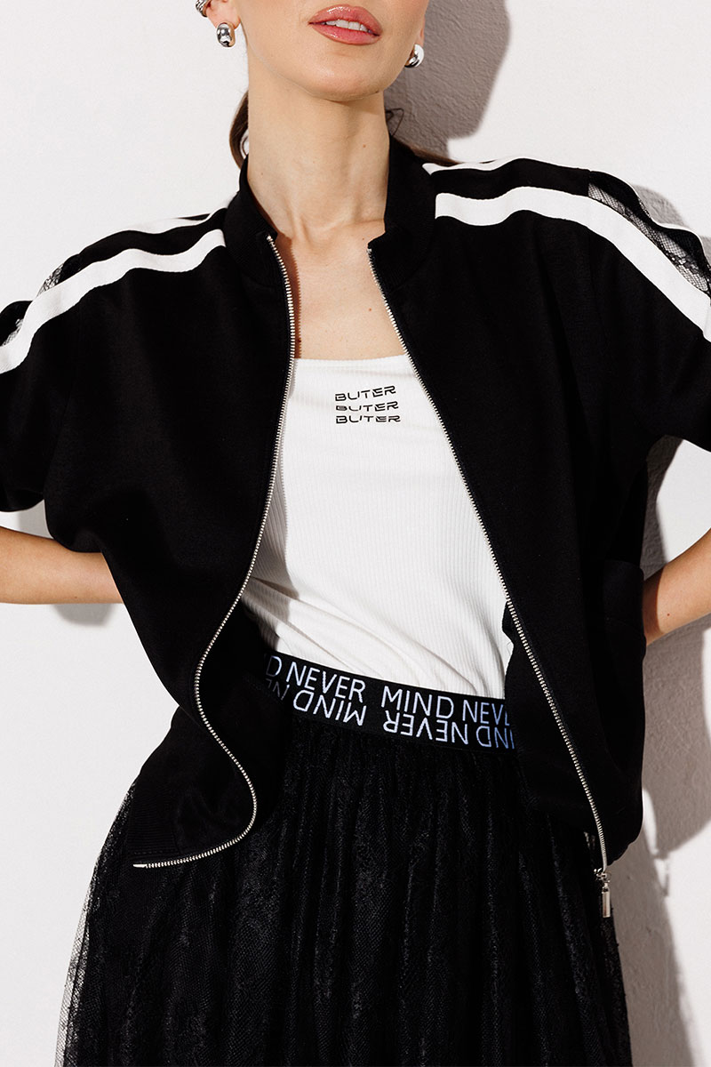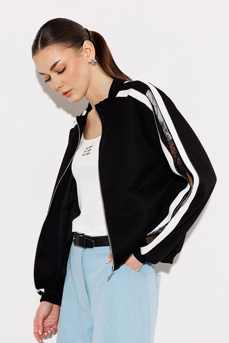 Джемпер из технологичного трикотажного полотна с эффектом peach. Прямого силуэта с втачным рукавом со вставкой из кружева и настроченными хлопковыми лампасами, переходящими на плечо и манжетой из отделочной ткани по низу рукава. Полочка с центральной застежкой на тесьму-молнию и карманом-листочкой и нашивкой с гравировкой "BUTER". По горловине и низу изделия притачная планка из отделочной ткани.