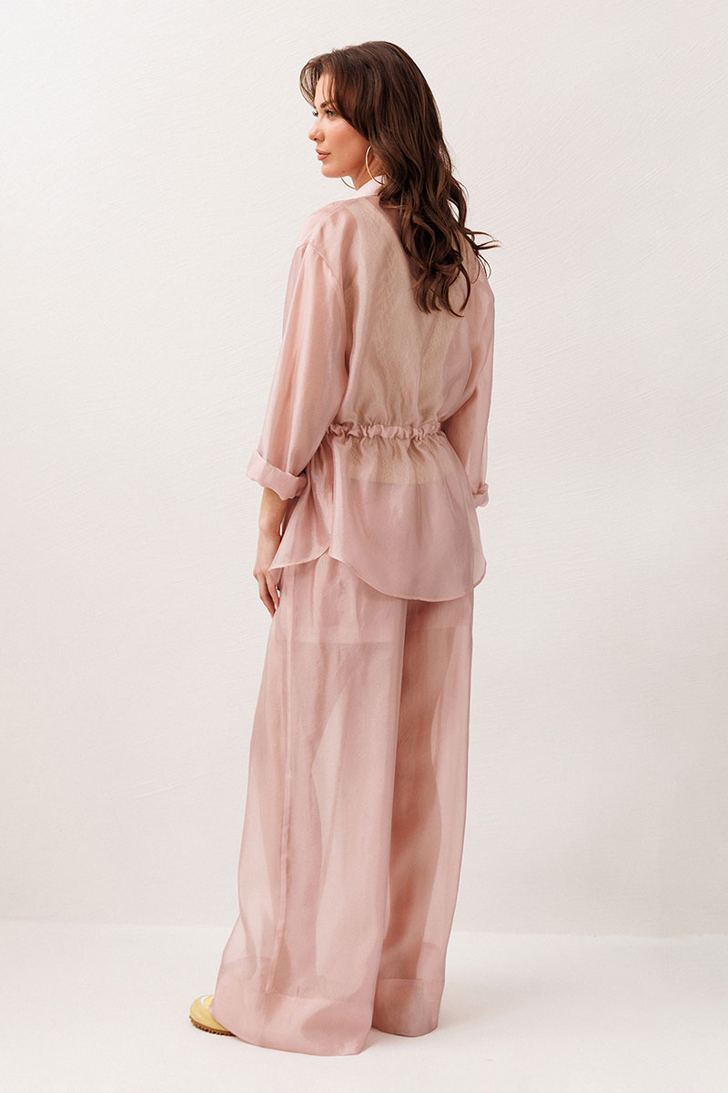 Блузка прямого силуэта, с длинным втачным одношовным рукавом. Полочка с застежкой на притачной планке на петли-пуговицы. По полочке и спинке настрочена кулиса со втянутым в него шнурком из основной ткани с наконечниками. Воротник рубашечный отложной на стойке. Спинка и полочка с фигурным низом. Внизу по боковым швам обработаны разрезы.