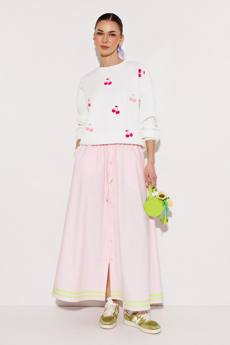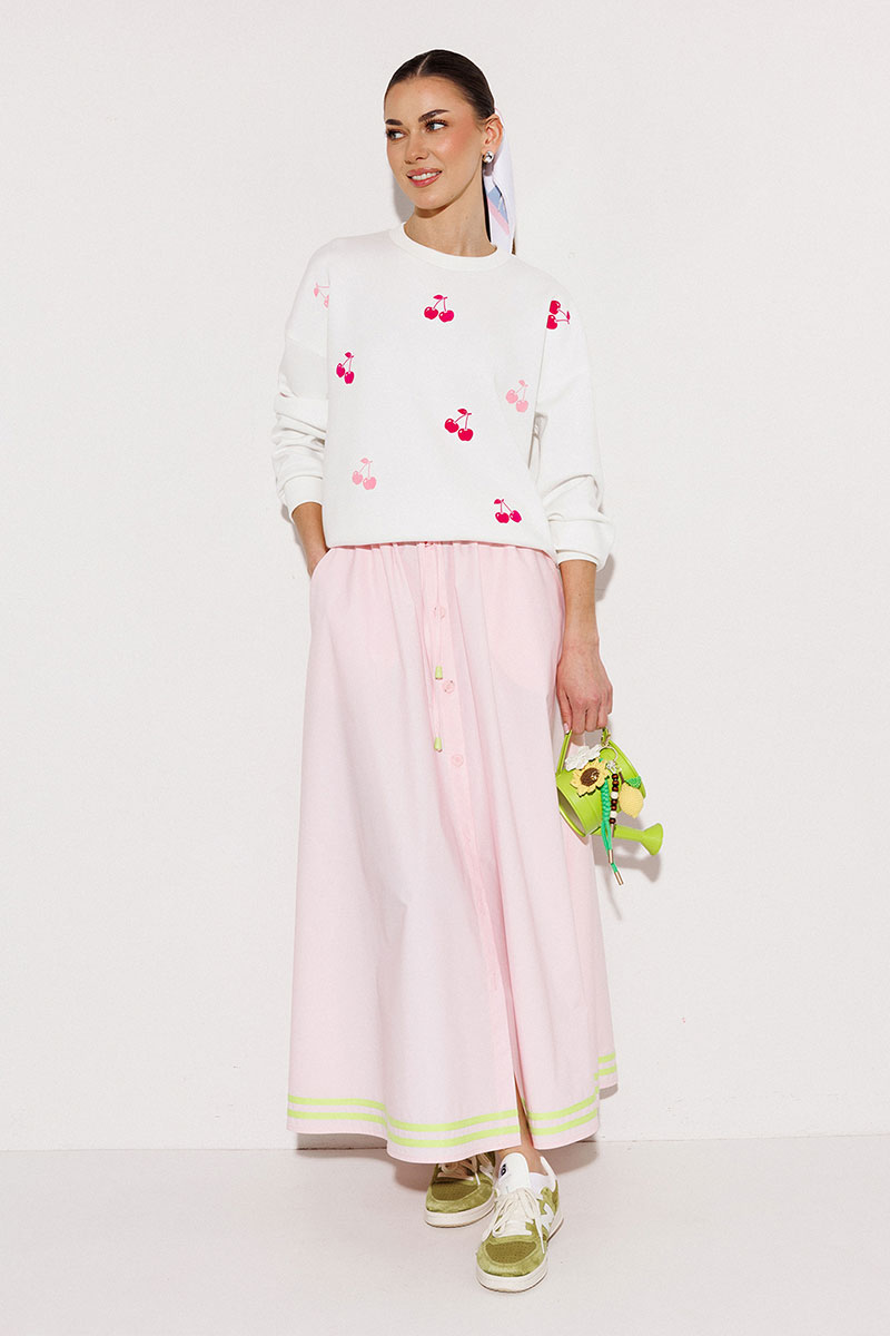 Юбка А-образного силуэта, на притачном отстроченном цельнокроеном поясе на резинке и вставленным в него шнурком из основной ткани и наконечниками по низу. По переду с центральной застежкой на петли пуговицы. Юбка с карманами в боковых швах, без подкладки. По низу настрочены хлопковые лампасы.