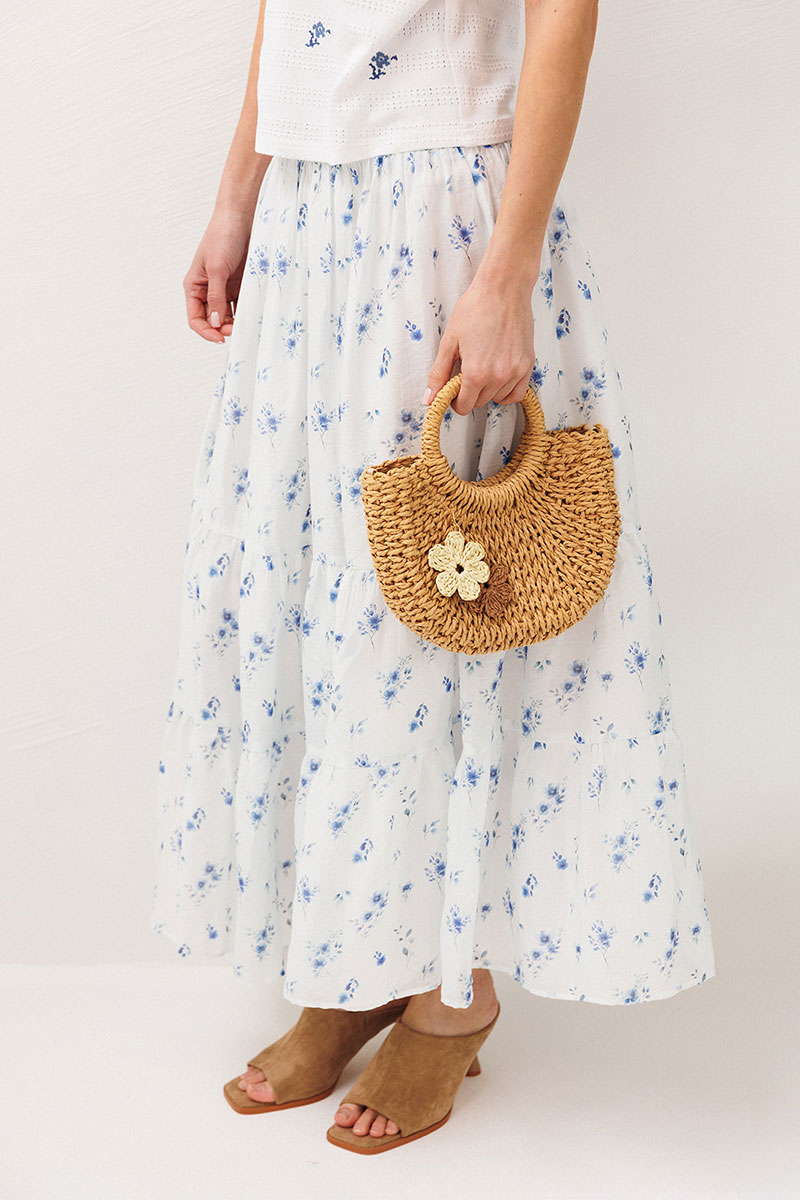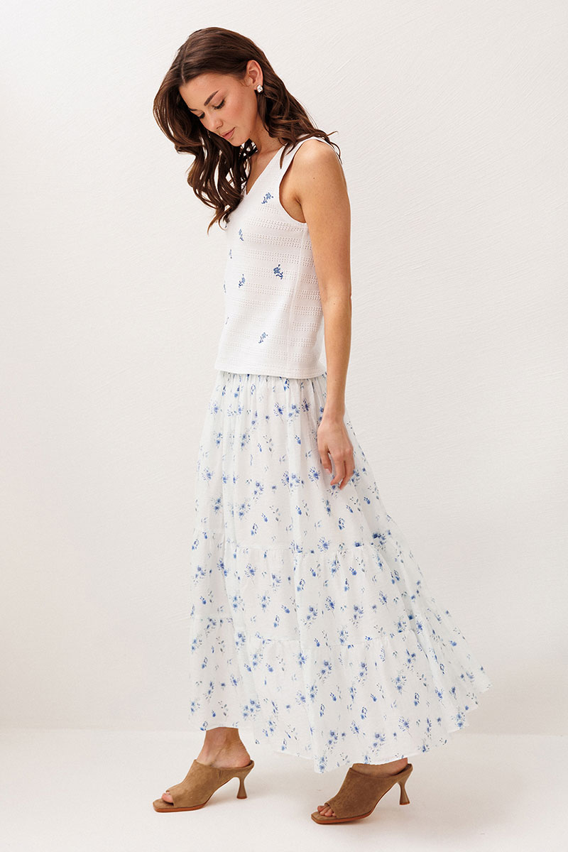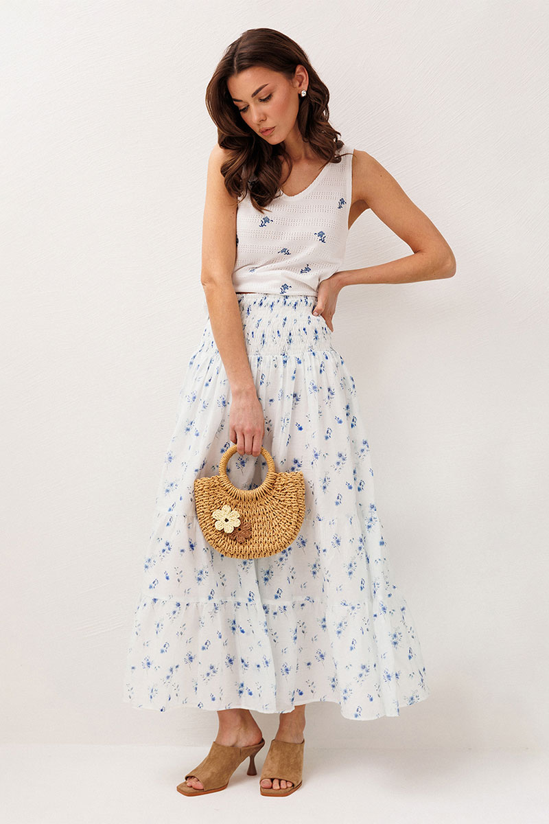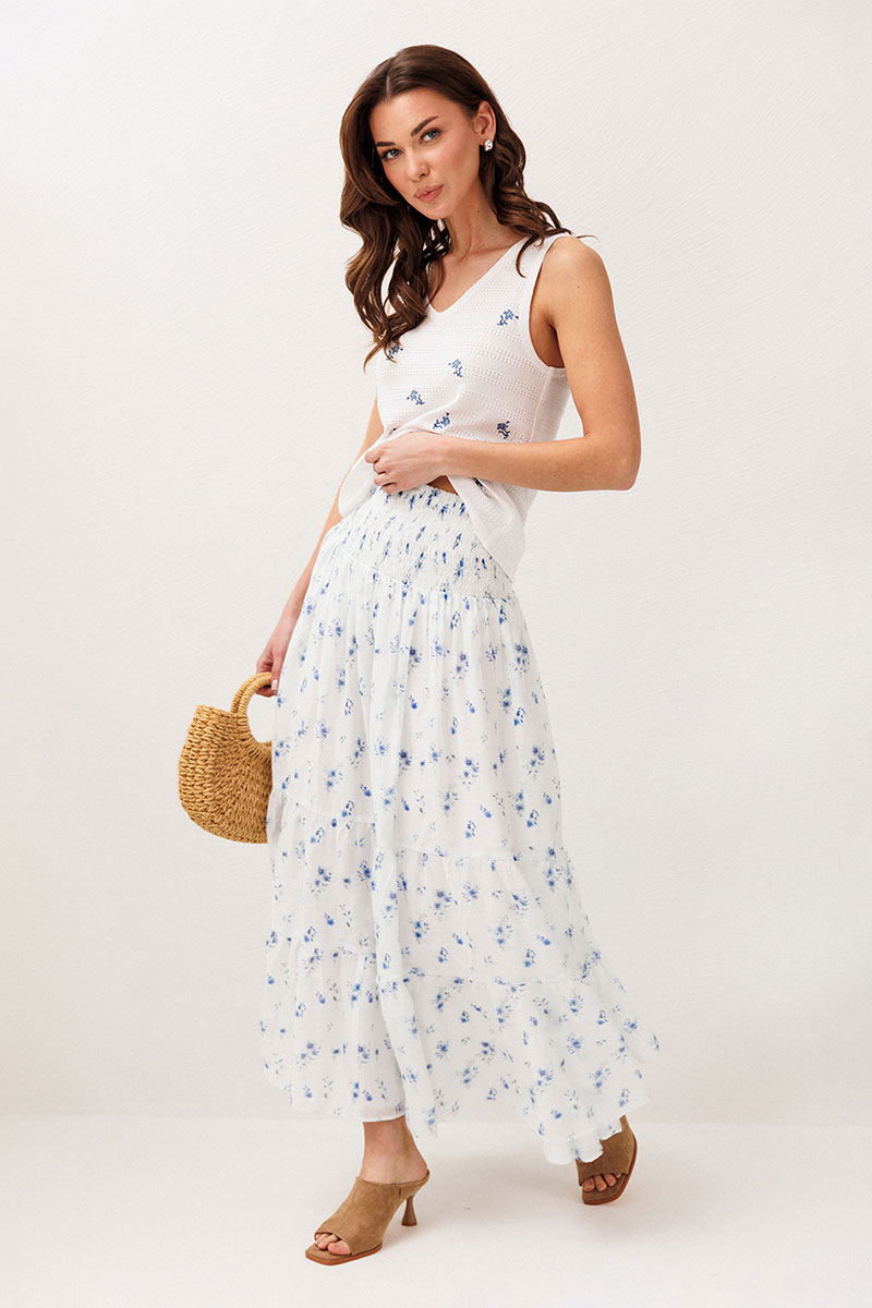 Юбка шифоновая А-силуэта на резинке с притачной кокеткой, которая отстрочена резинками. Юбка с 2-мя притачными слегка присборенными воланами. Юбка на подкладке.