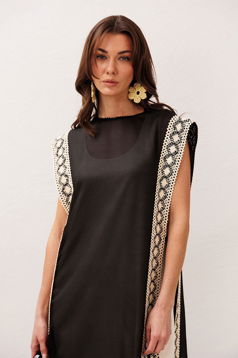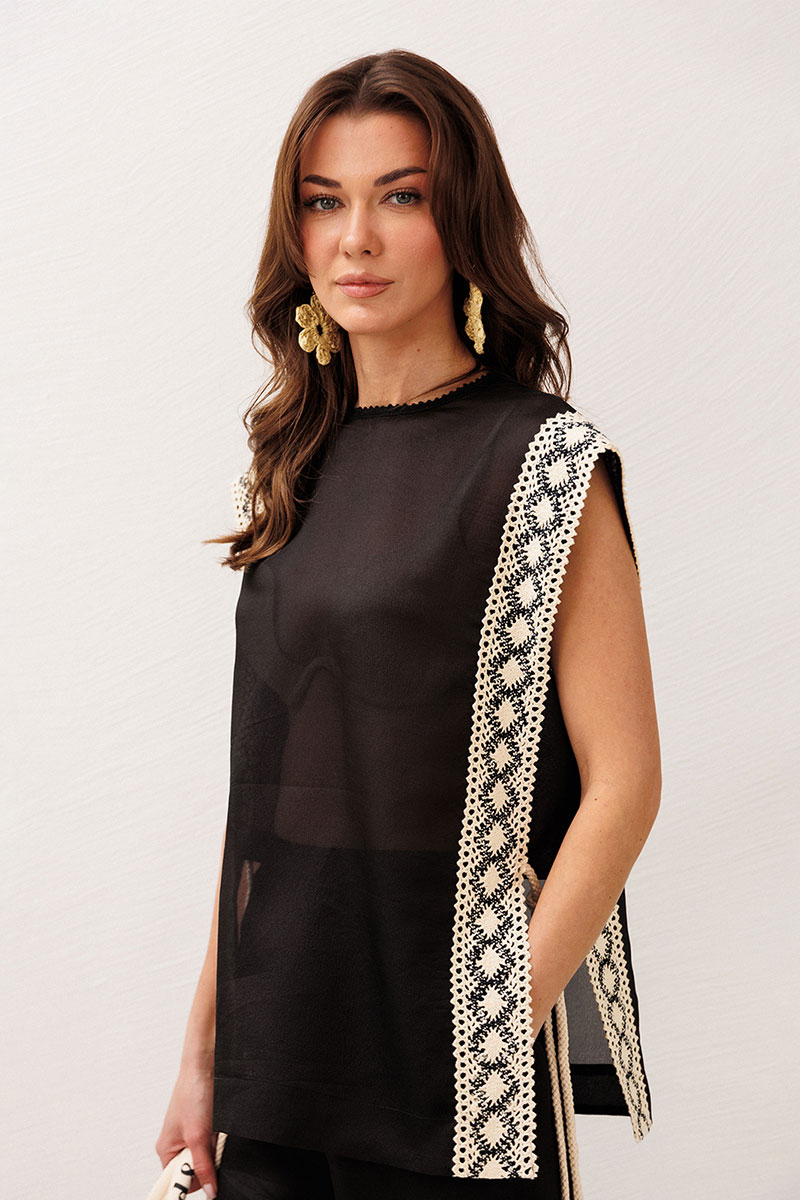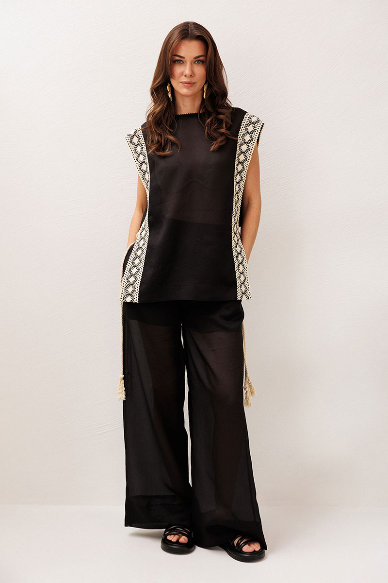 Туника из полупрозрачной ткани прямого силуэта со вставкой по бокам и завязкой на декоративный шнурок. По всей длине полочки и спинки по бокам настрочено кружево. Горловина округлая с притаченным к ней кружевом. По спинке вырез капля с застежкой на навесную петлю-пуговицу.