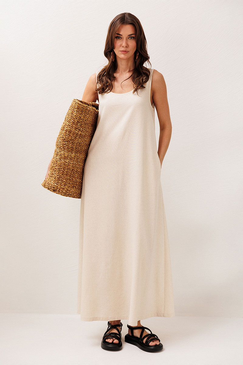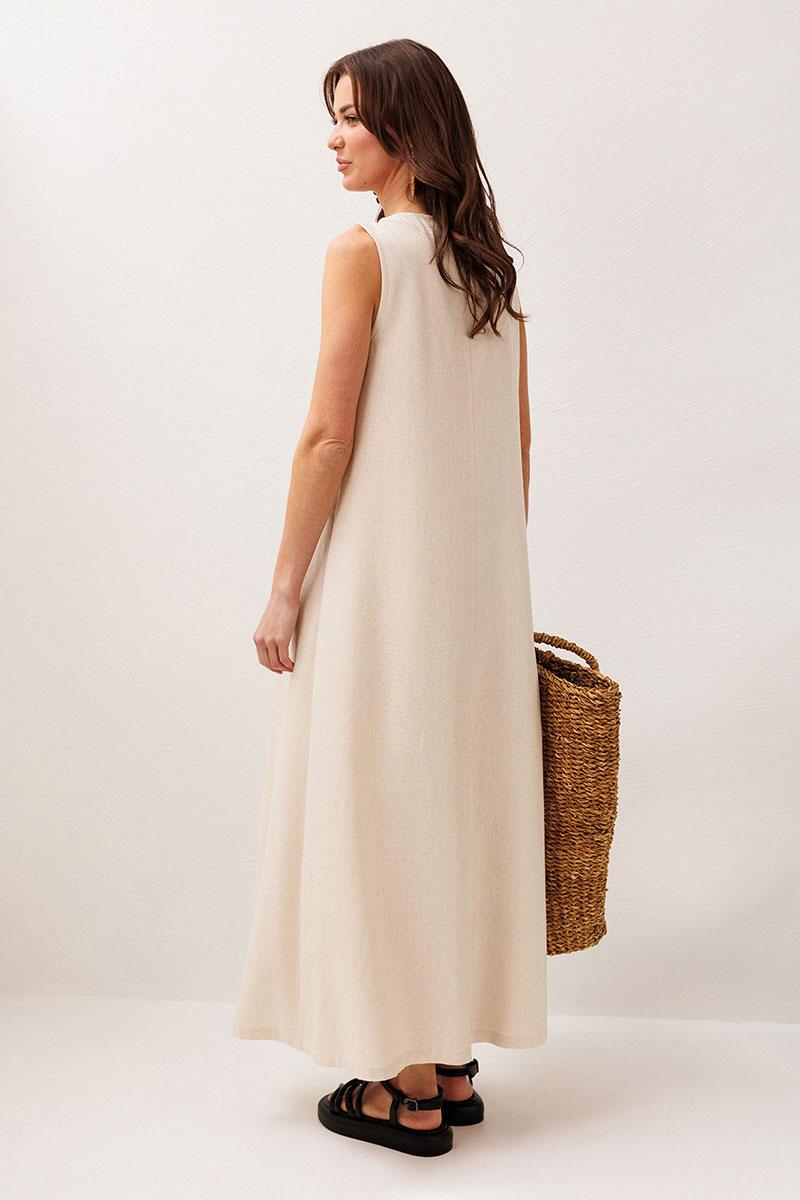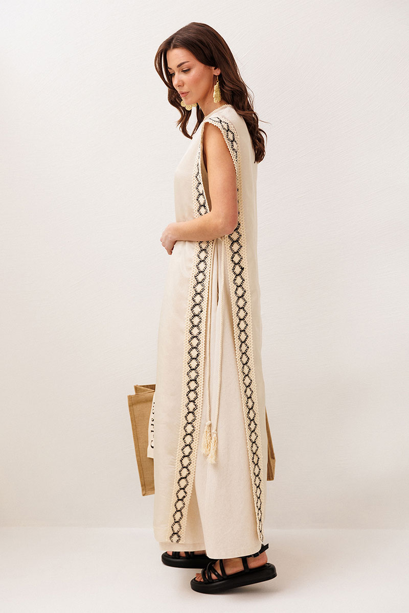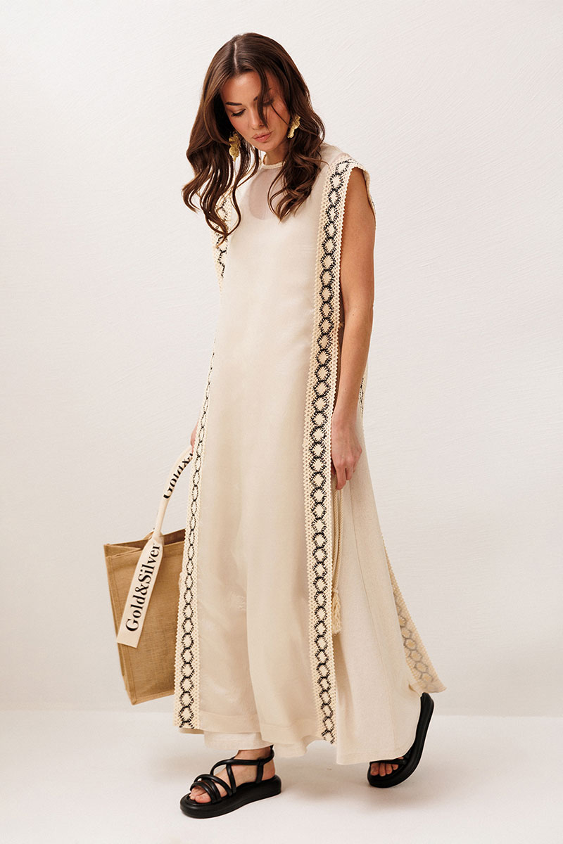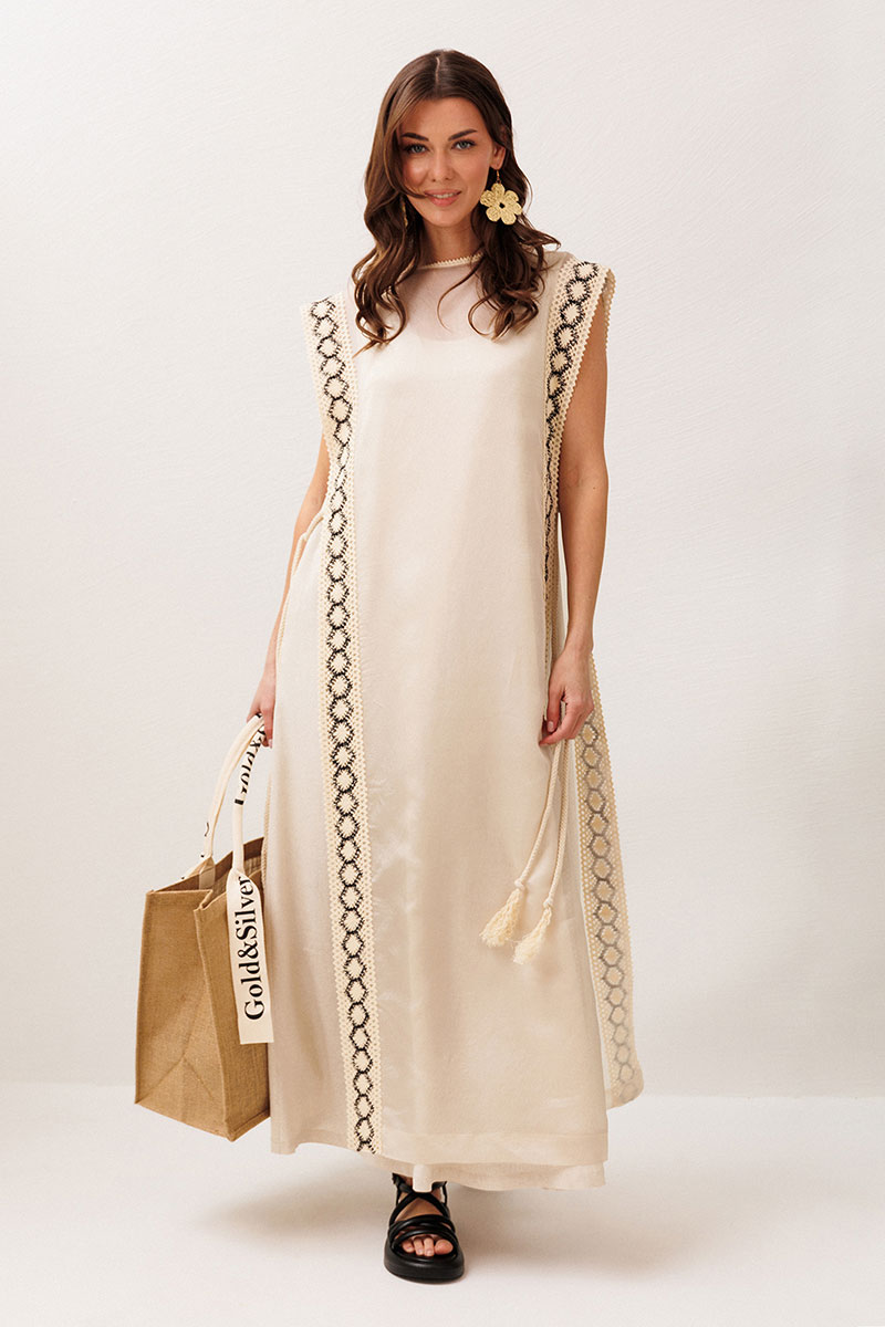 Платье длинное, состоящие их верхнего и нижнего. Верхнее платье из полупрозрачной ткани, слегка расклешенное к низу без рукавов. По бокам платье не стачено с завязкой на декоративный шнурок. По всей длине полочки и спинки по бокам настрочено кружево. Горловина округлая с притаченым к ней кружевом. По спинке вырез капля с застежкой на навесную петлю-пуговицу. Нижнее платье А-силуэта без рукавов, с карманами в боковых швах. Вырез горловины – округлый.