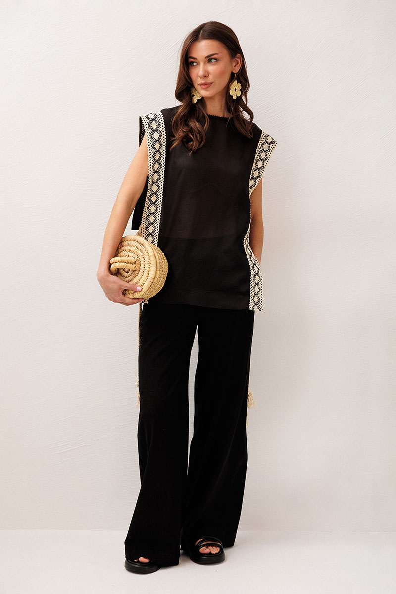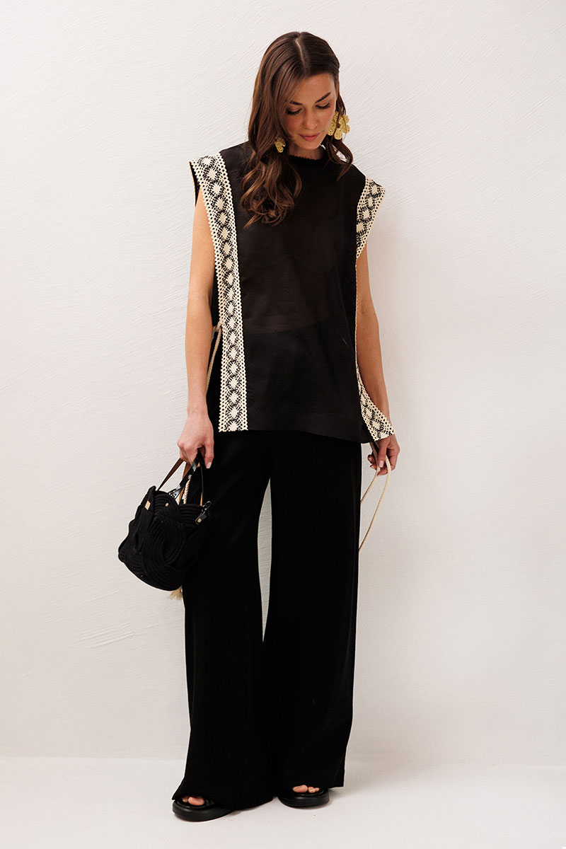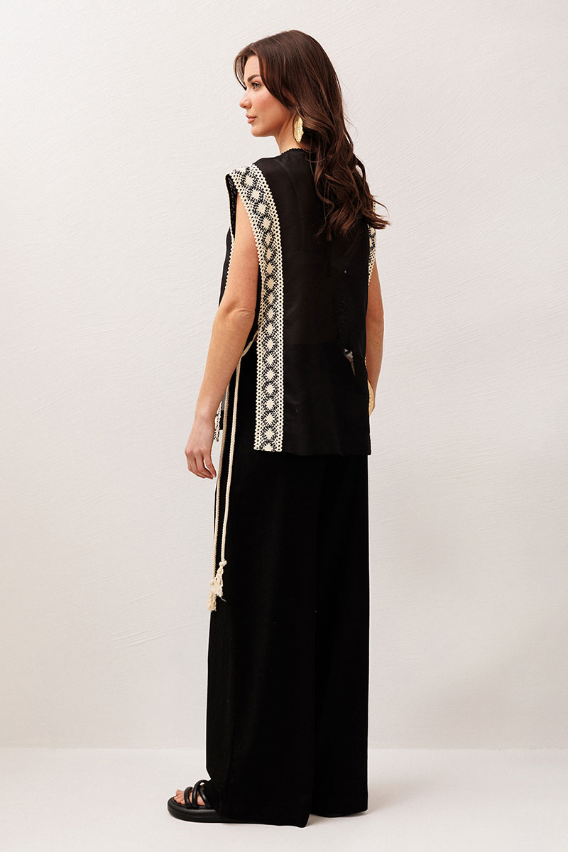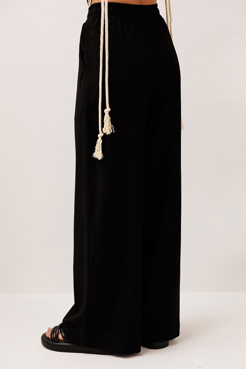 Брюки немного расширенные к низу, на притачном, отстроченном поясе на резинке, с карманами в боковых швах. Вверху по переду имитация застежки-гульфик.