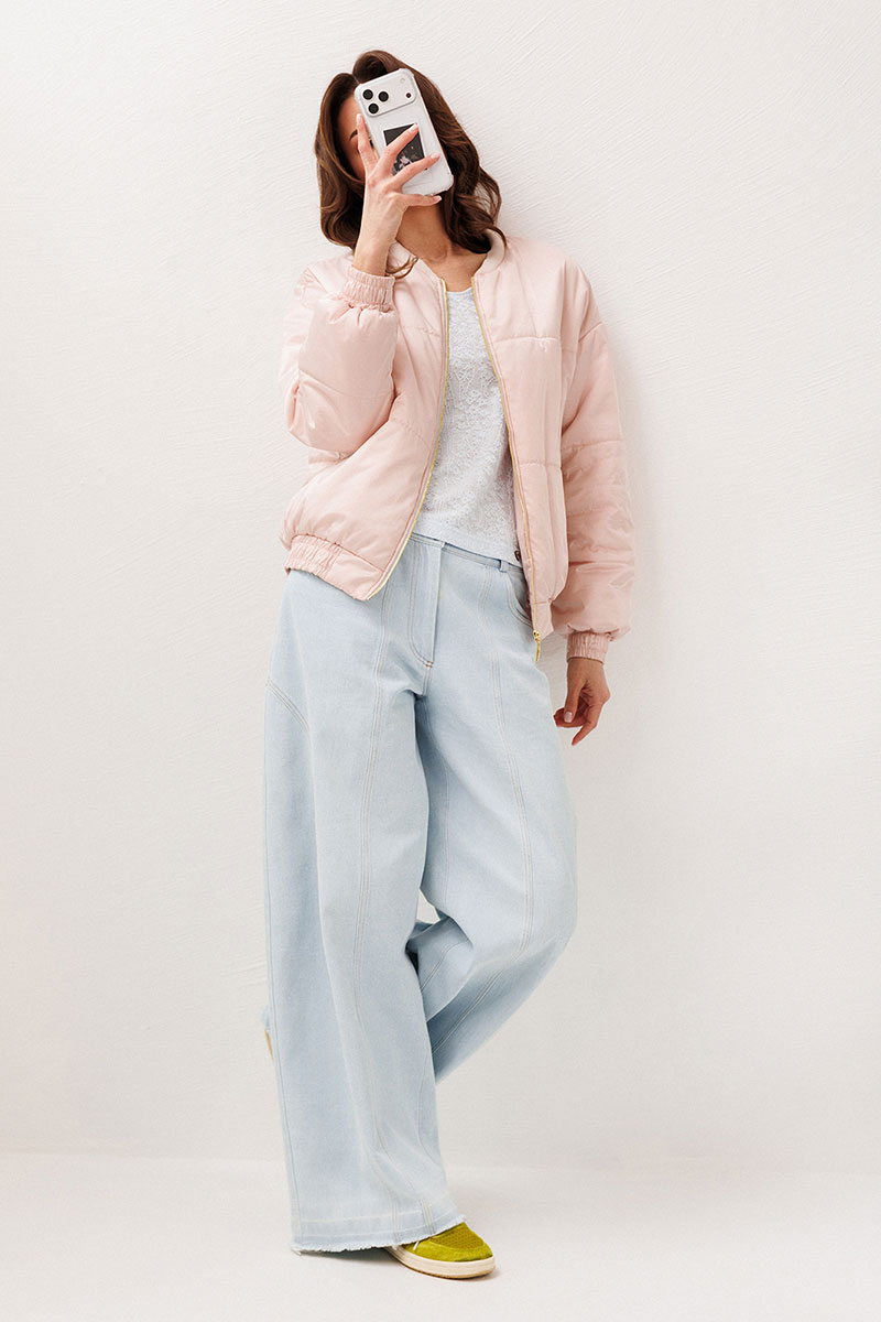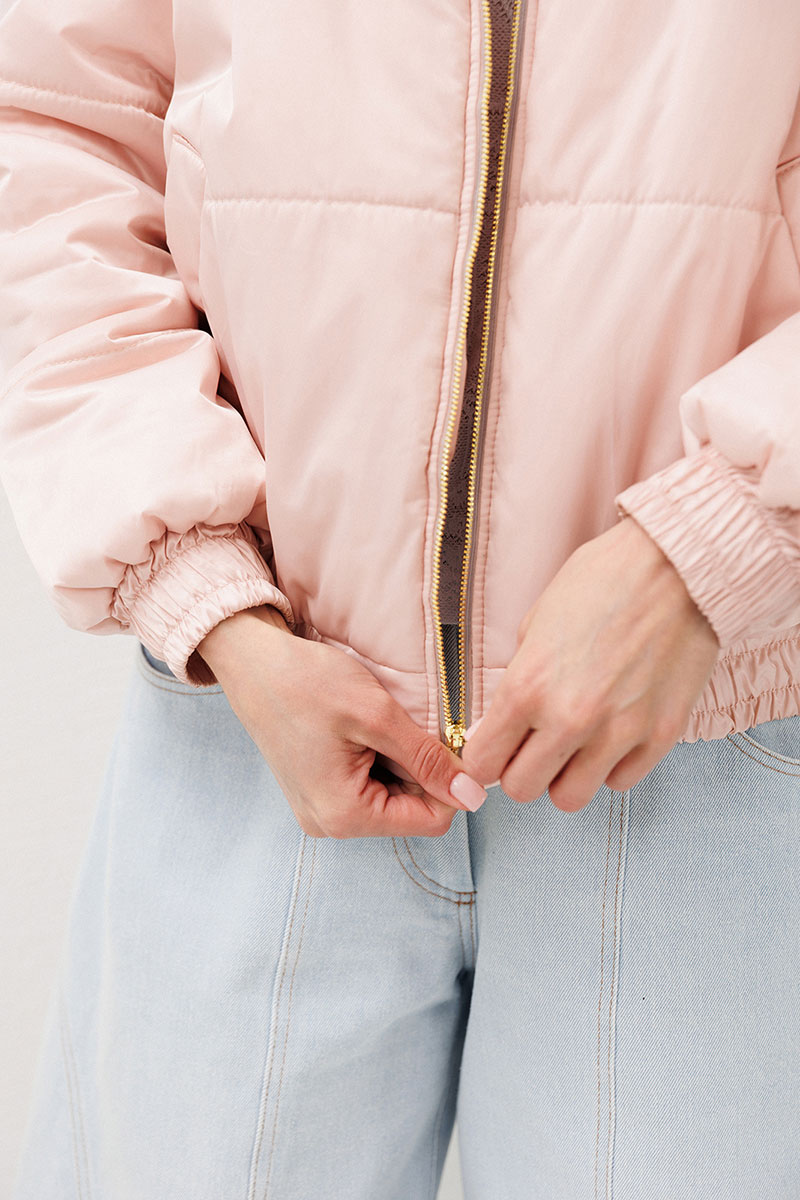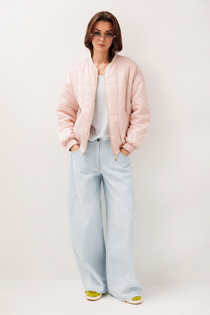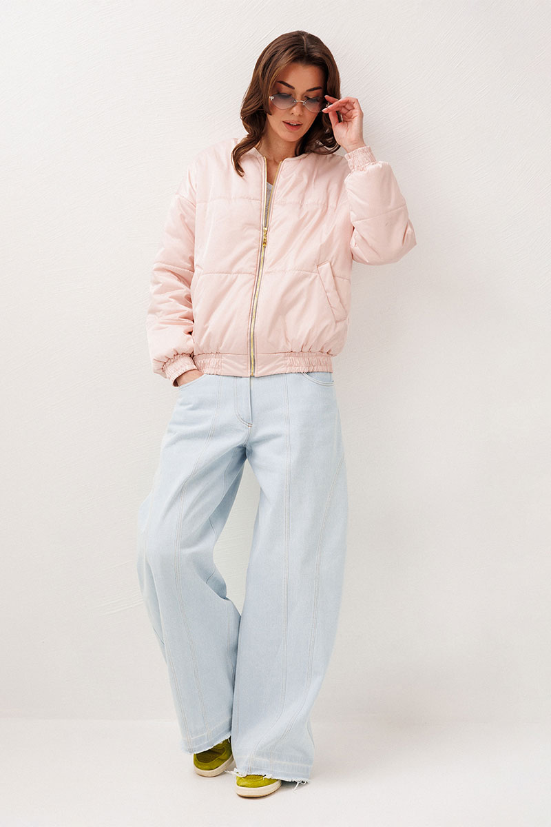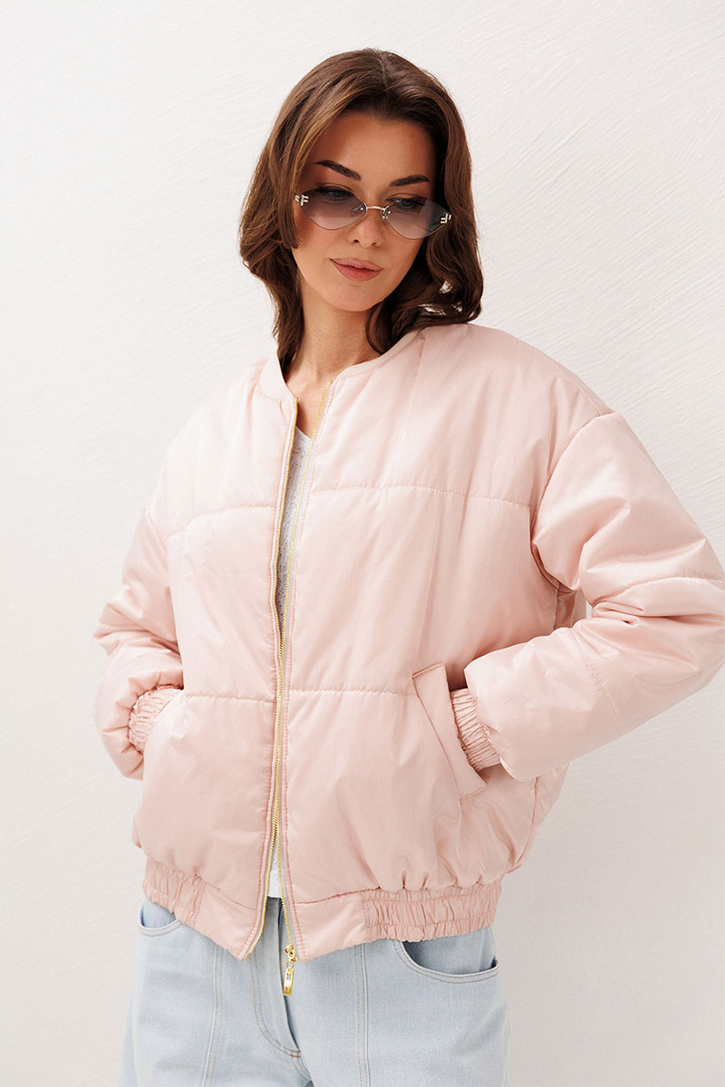 Куртка-бомбер демисезонная (t до 0С) прямого силуэта с втачным рукавом внизу на притачной отстроченной планке со вставленной в него резинкой и со спущенной линией плеча. Полочка с центральной застёжкой на тесьму-молнию и карманы-листочки. По спинке нашивка, по низу притачная отстроченная планка со вставленной в нее резинкой. Воротник-стойка из декоративного давяза. Куртка из плащевой ткани со стежкой на синтепоне (Изософт (Isosoft) — современный синтетический утеплитель на основе тончайших полиэстеровых волокон) 100г/м²) и подкладке.