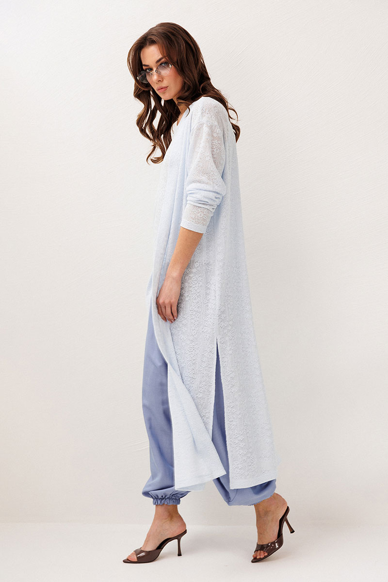 Кардиган прямого силуэта, длинный, с втачным длинным рукавом внизу на подгибке. Кардиган без застежки, внизу по боковым швам - разрезы.