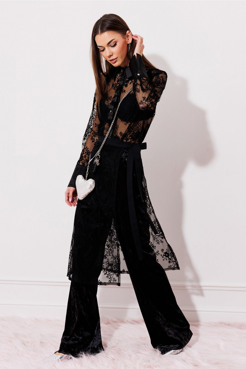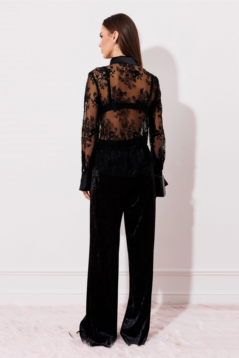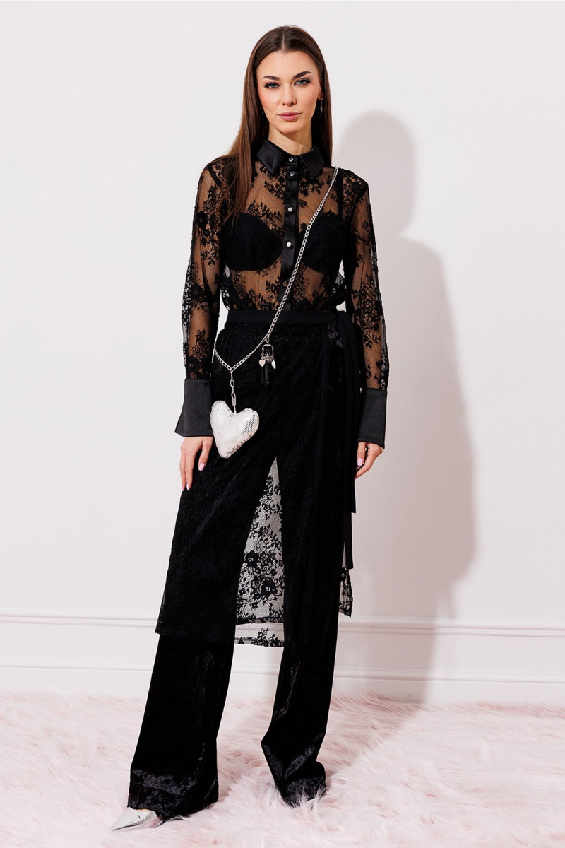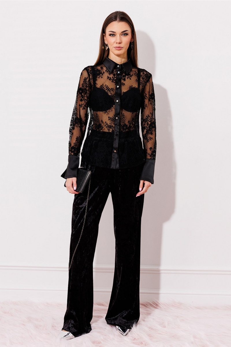 Кружевная блузка прилегающего силуэта, с втачным одношовным рукавом, внизу на манжете из атласной ткани с застежкой на петлю-пуговицу. Полочка с притачной планкой из атласной ткани с застежкой на петли-пуговицы. Воротник рубашечный отложной на стойке из атласной ткани. Спинка и полочка с фигурным низом. Внизу по боковым швам обработаны разрезы.