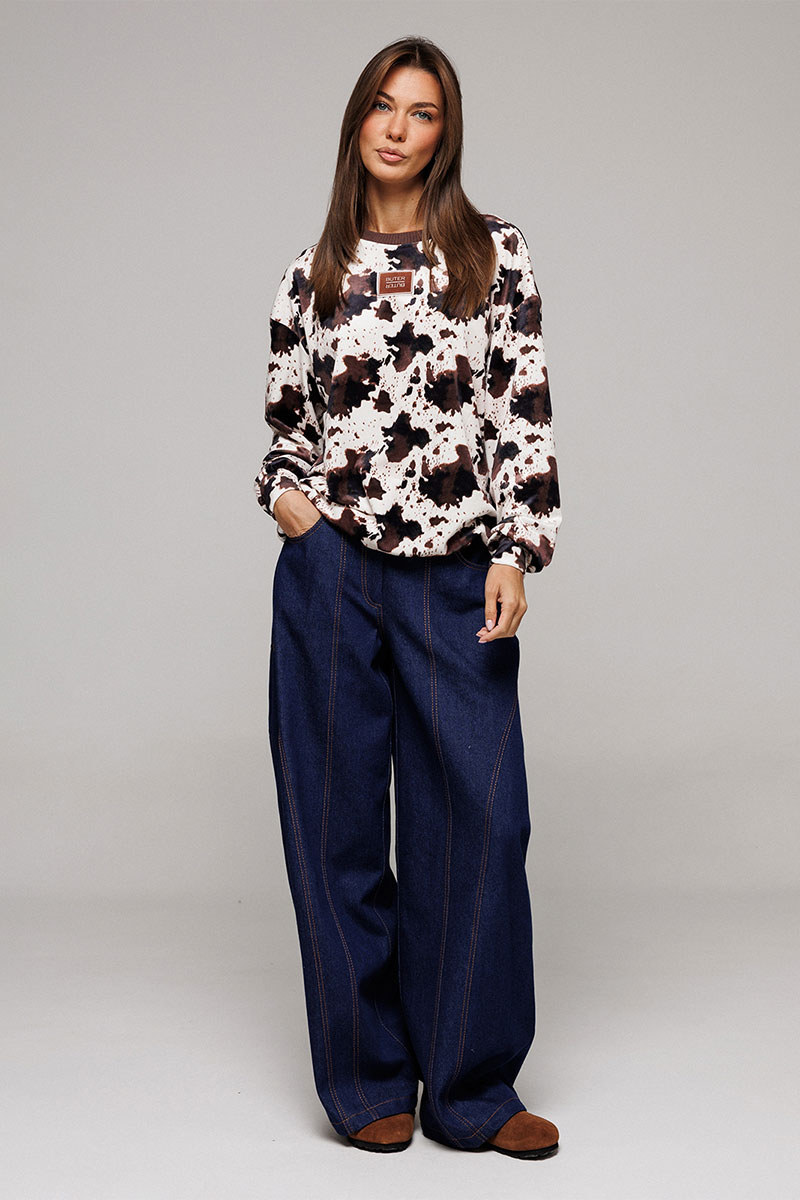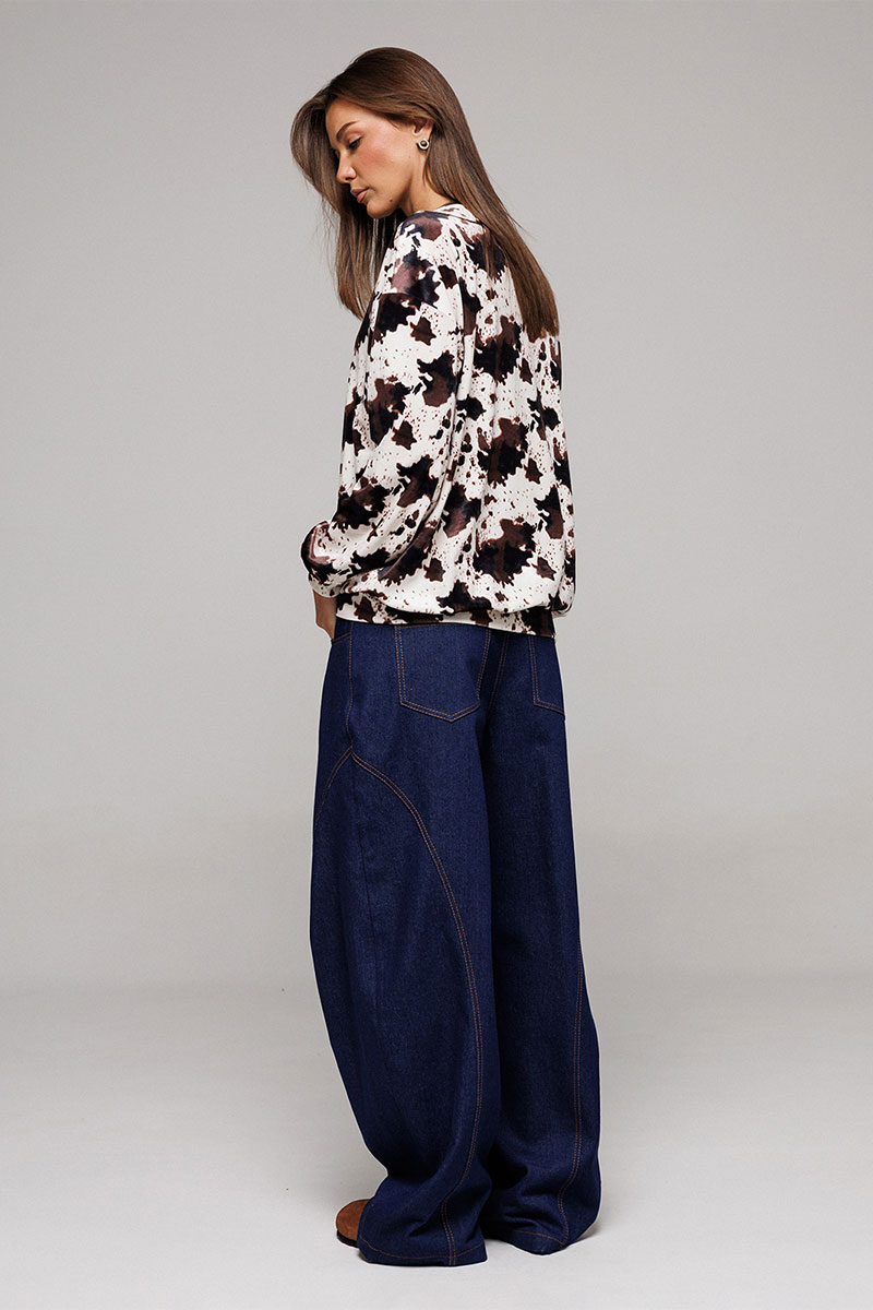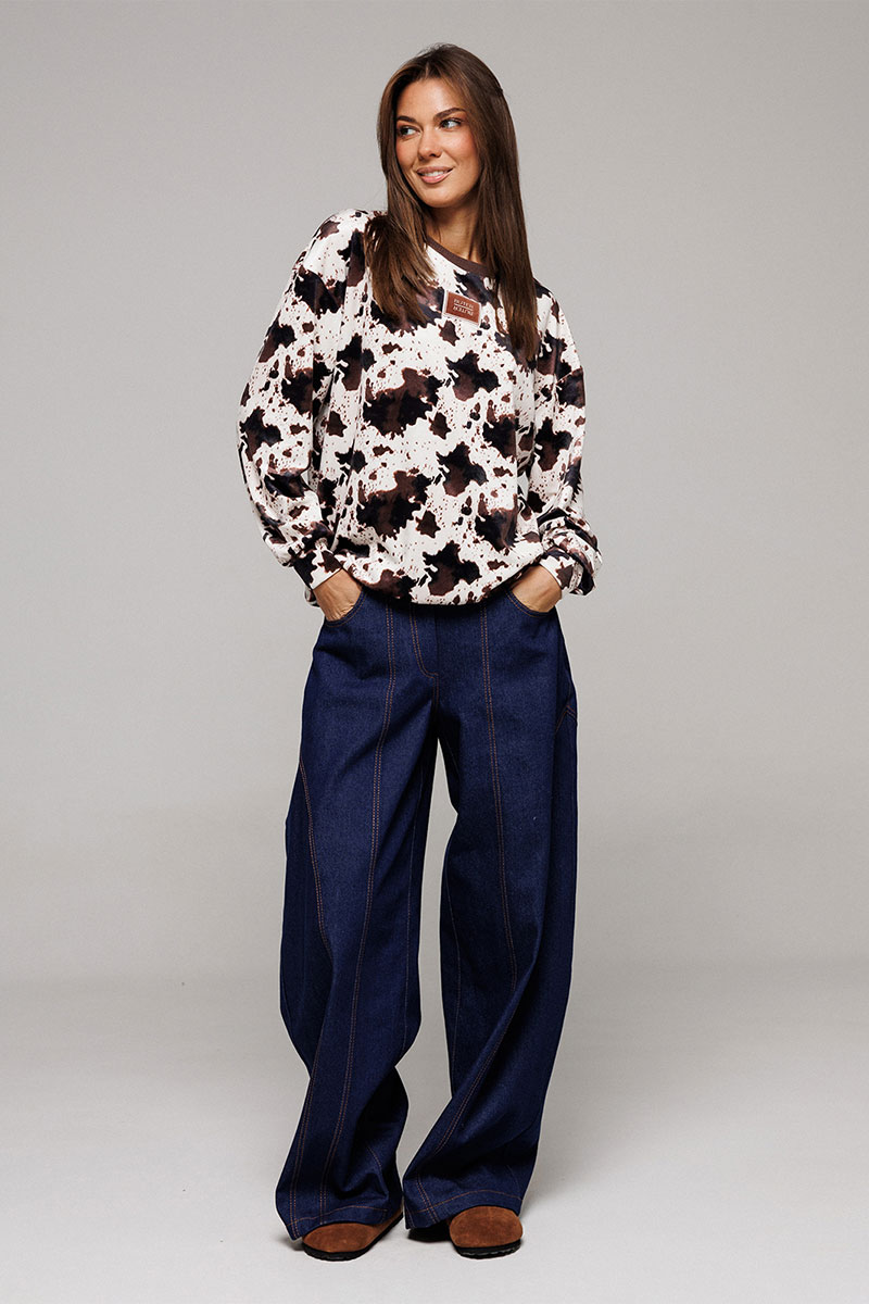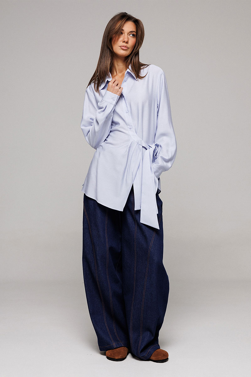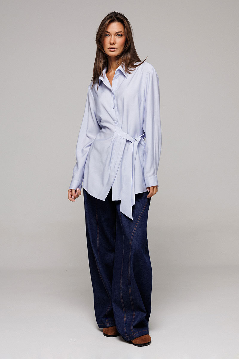 Брюки-джинсы немного заужены к низу. На притачном поясе со шлёвками, застежкой-гульфик. Пояс застегивается на петлю-пуговицу. По переду карманы и рельефы. По спинке кокетка, накладные карманы и рельефы.