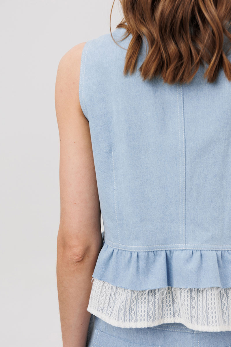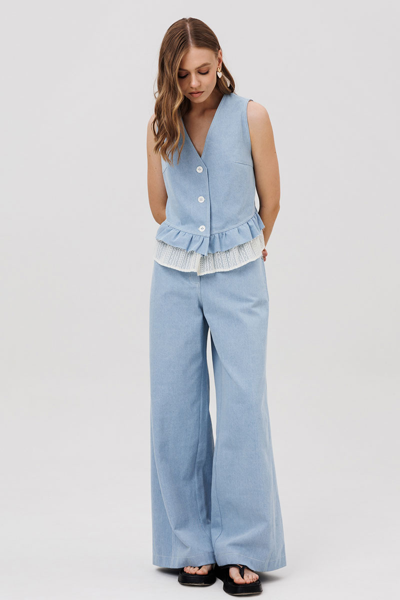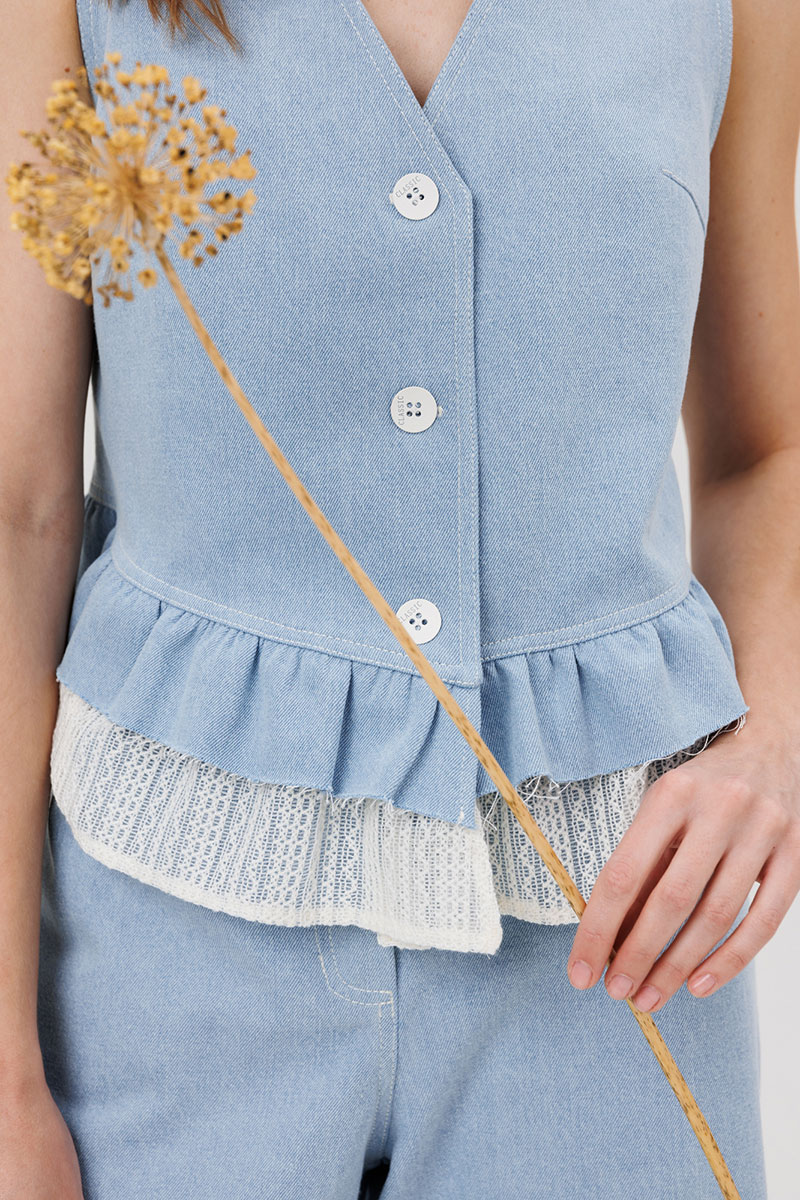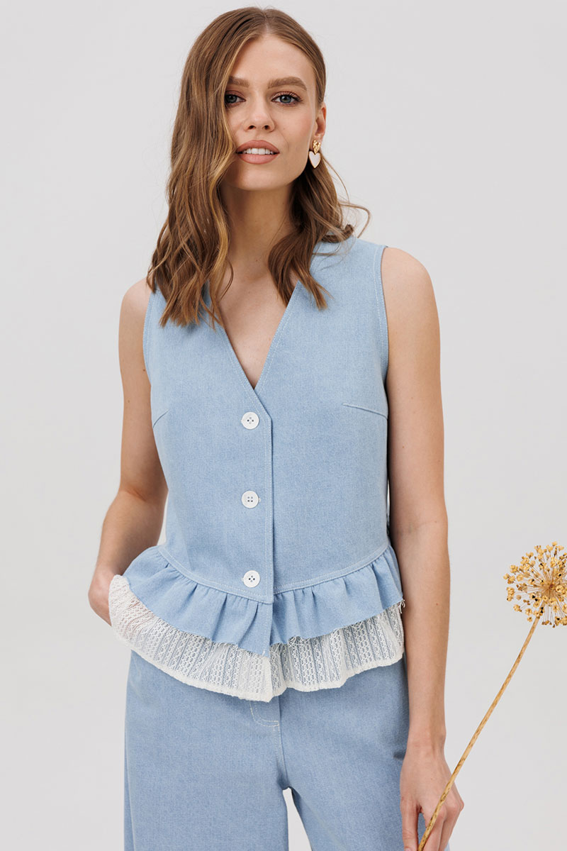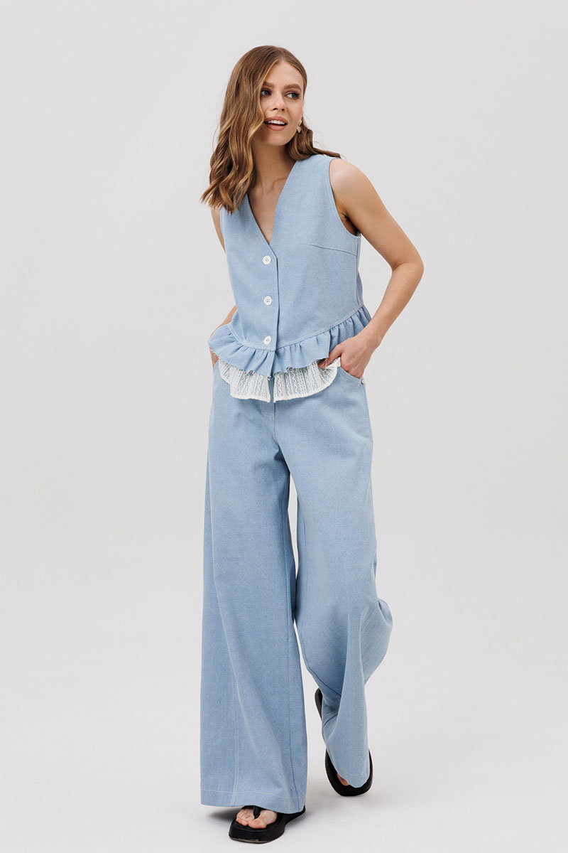 Комплект женский, состоящий из жилета и брюк. Комплект выполнен из джинсовой ткани.