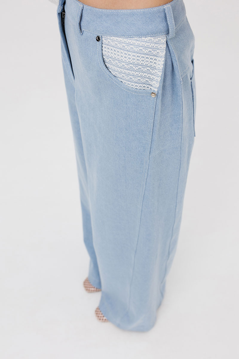 Джинсы - расширенные книзу, с застежкой на тесьму молнию, с притачным поясом, застегивающимся на 1 прорезную петлю и болт. Пояс - со шлевками. Передние половинки брюк с боковыми карманами, с ажурными вставками в карманах, с хольнитенами у боковых швов и у шва притачивания пояса. Задние половинки - брюк с отрезными кокетками и накладными карманами. По боку – отрезная деталь, которая закладывается в складку у пояса.